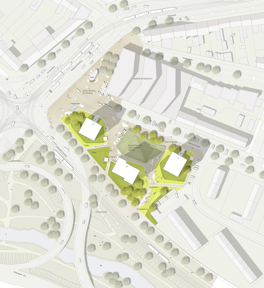 Ein weiterer Betrachtungsansatz des Areals ergibt sich aus der umgebenden Bau- und Landschaftsstruktur. Schon der Entenfang und das Wasserschloss hatten einen direkten Bezug zur Alb. Auch das derzeitige Baugebiet der Zeilenbauten und Punkthochhäuser im Mühlburger Feld lässt im Vergleich zu der heute vorherrschenden Blockrandbebauung in Mühlburg noch einen visuellen Bezug zum Grünkorridor entlang der Alb erkennen, wenngleich Zugänge zum niedriger gelegenen Albtal durch Straßen und Bahntrassen heute erschwert sind. Dieser Bezug soll wieder gestärkt werden, in ideeller wie freiraumplanerischer Hinsicht. Erstrebenswert wäre ein weiterer Zugang zur Alb über die Bahngleise. Die Punkthochhäuser sollen gleich Hochpunkten in der Flusslandschaft von Strömen an Menschen umspült werden. Daraus ergibt sich wie in Auenlandschaften ein Mosaik aus verschieden hoch und tief gelegenen Terrassen und Senken. Dieses Thema wird als Gestaltungsthema aufgegriffen, um der neuen Bibliothek und dem Bürgerzentrum am Entenfang eine eigene Identität zu verleihen.
