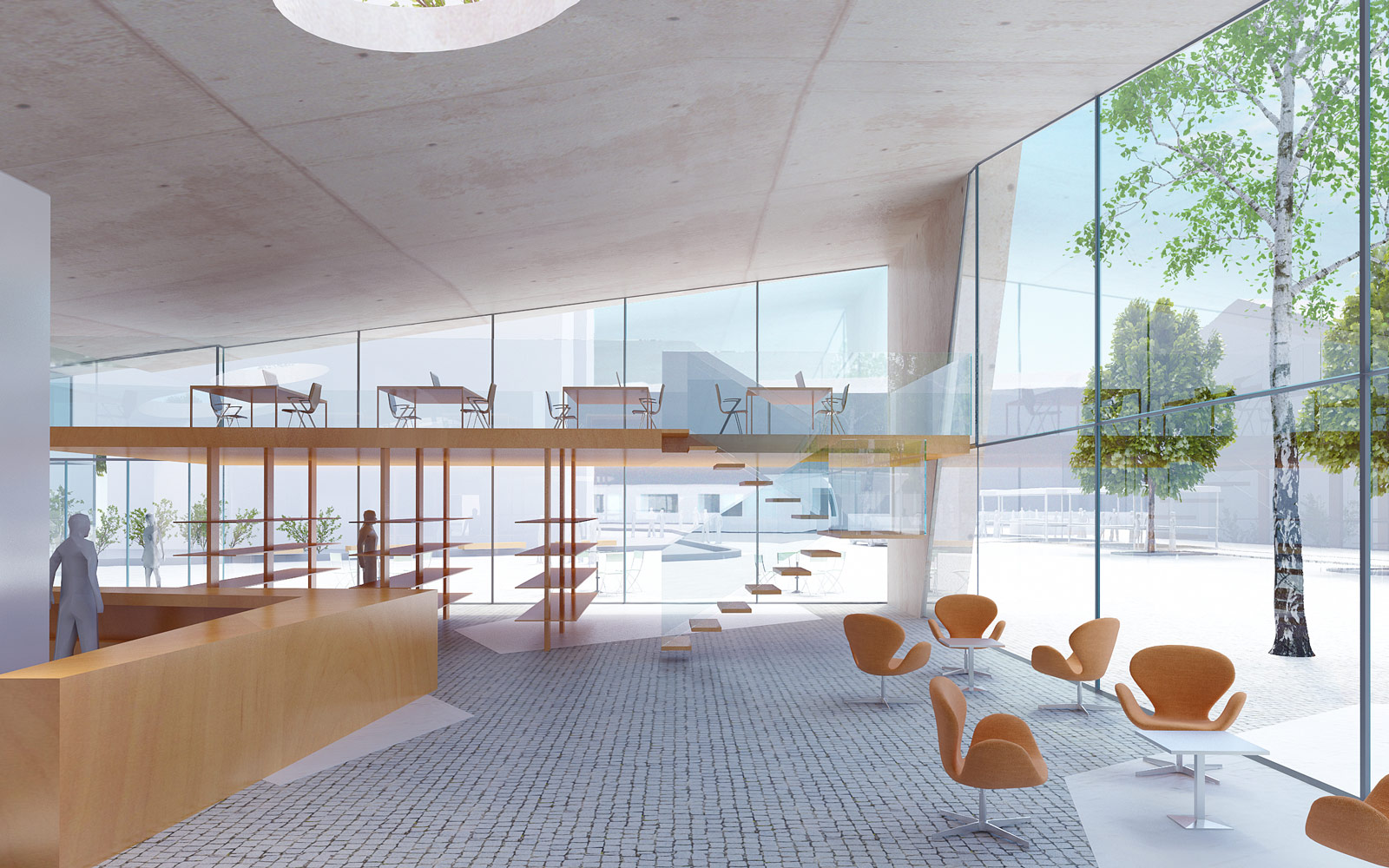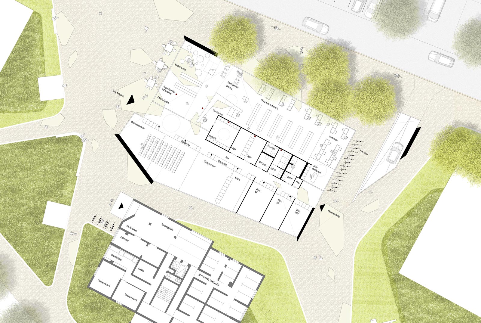 Das öffentliche Gebäude erhebt sich gleich einer Eruption aus dem Gelände vor den drei Punkthochhäusern. Eine große Scholle bricht auf und faltet sich als schützendes Dach über das Bürgerzentrum und die Bibliothek. Es entsteht ein kantiger, sich aus der Stadtlandschaft lösender Solitär, der in seiner Erscheinung weniger ein Haus als vielmehr eine Umhausung ist.
