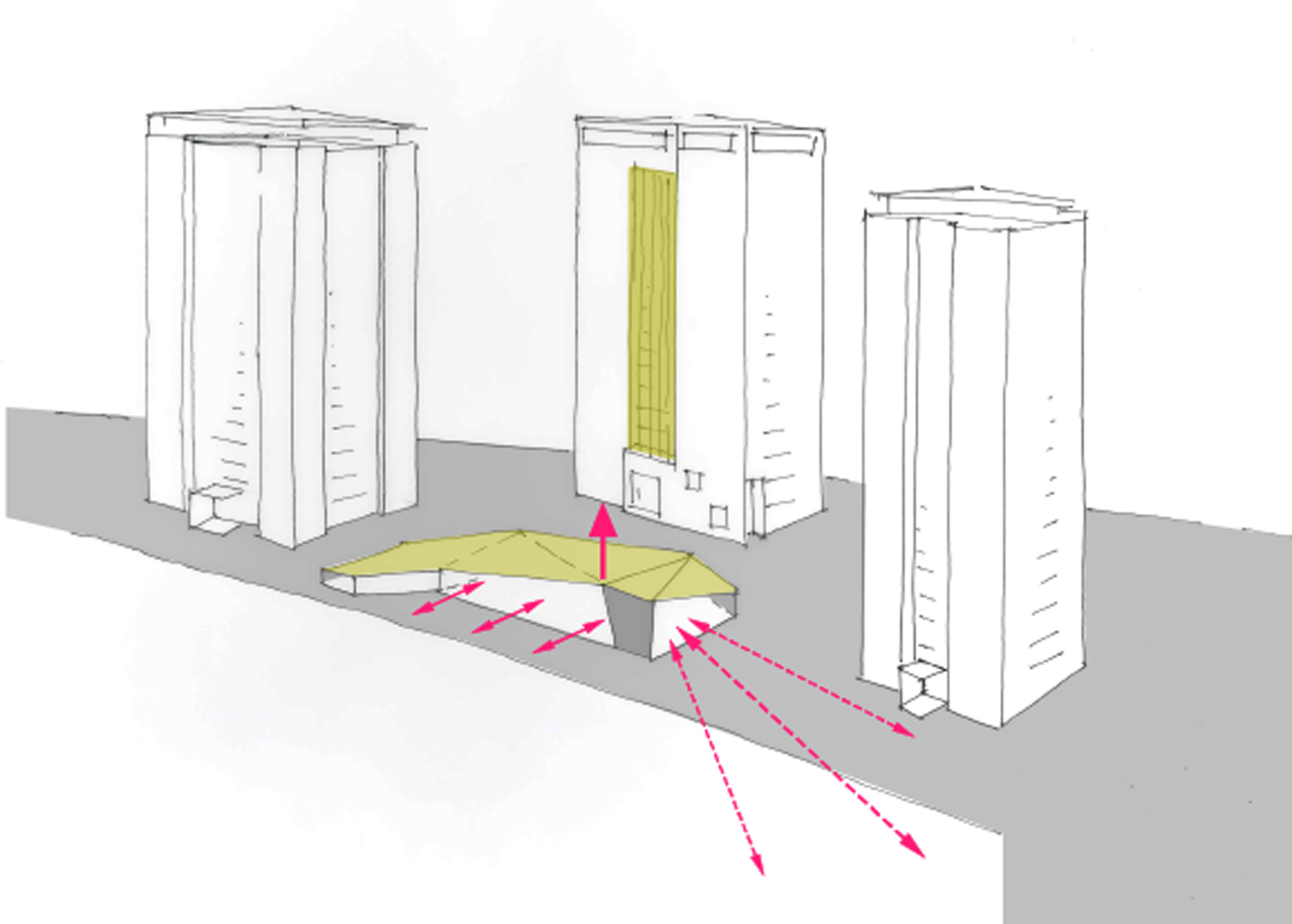 Er setzt sich dadurch stark von seiner Umgebung ab und behauptet sich gegen die dominanten Baumassen der Hochhäuser. Selbstbewusst nimmt er den Platz zwischen ihnen ein und richtet sich zum "Entenfang" auf. Gleichzeitig fügt er sich durch seine besondere Ausformung gut in den Zwischenraum. Seine äußeren Kanten leiten und begleiten die Bewohner zu ihren Häusern wie die Kanten eines Steins, die die Wasserströme wie selbstverständlich umleiten.