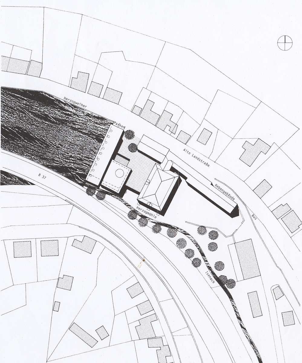 Der Inhalt des Museums ist dort verborgen, wo wir in der Regel Zeugnisse der Menschheitsgeschichte finden: unter der Erde. Das sichtbare Haus ist Hülle über dem Zugang. Es löst sich vom gebauten Kontext und entwickelt sich als Solitär. Die Dominanz der Herzogmühle bleibt damit erhalten.
