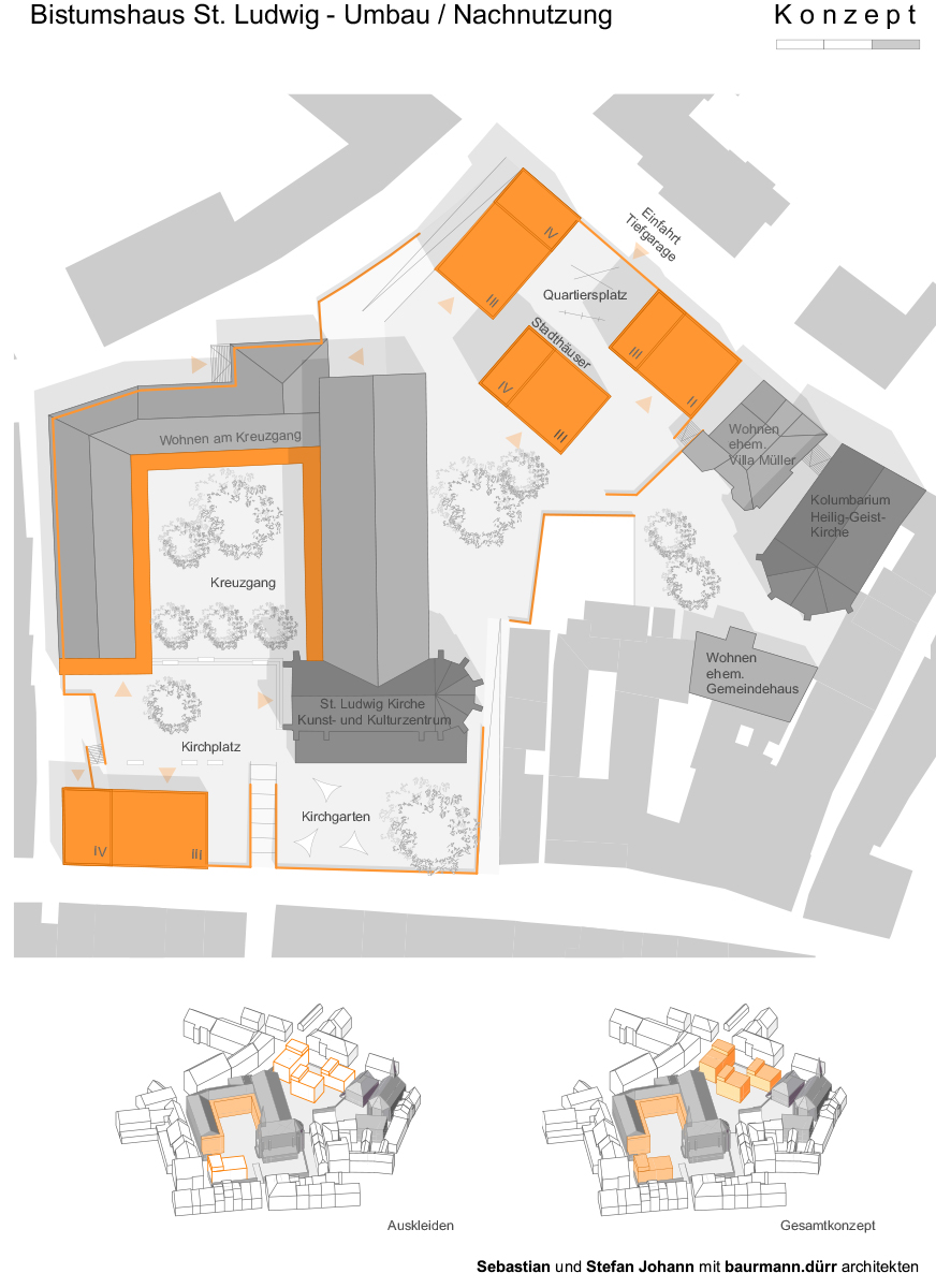Der konzeptionelle Ansatz für die Umnutzung und Erweiterung des ehemaligen Bistumshauses St. Ludwig setzt sich aus fünf Strategien zusammen, die zum Ziel haben, die Dreiheit aus St. Ludwig-Kirche, Bistumshaus und Kreuzgang als städtebaulich qualitätsvolles Ensemble zu stärken und durch eine dezente bauliche Verdichtung zu ergänzen.