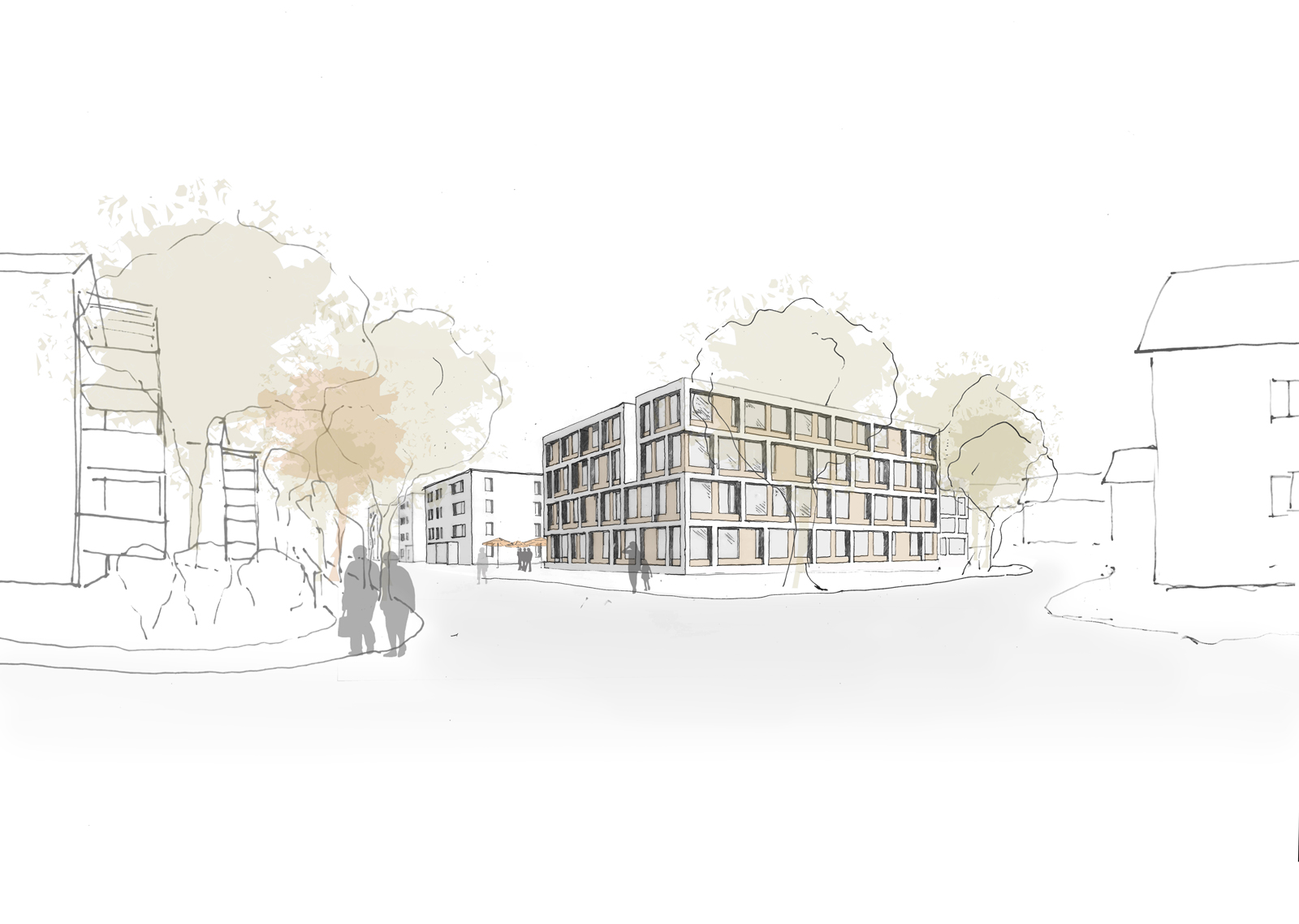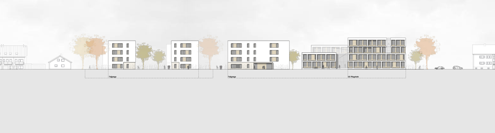 Die Fassaden sorgen neben den Außenräumen für die unterschiedlichen Atmosphären in den verschiedenen Planungsgebieten. Entlang der Steinwaldstraße entstehen klar gegliederte helle Putzbaukörper mit einzelnen Holzelementen. Die drei Baukörper des Pflegeheimes werden über eine gemeinsame Fassade zusammengefasst. Sie legt sich wie ein Netz über die Häuser. Die anschließenden fünf Mehrfamilienhäuser sollen formal eine gemeinsame Sprache sprechen. Die Ausbildung einer Sockelzone sorgt hier für eine verträgliche Maßstabswahrnehmung und ist neben dem Fassadenmaterial das verbindende Element.