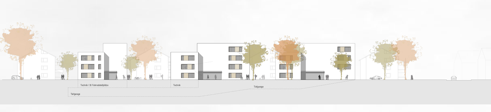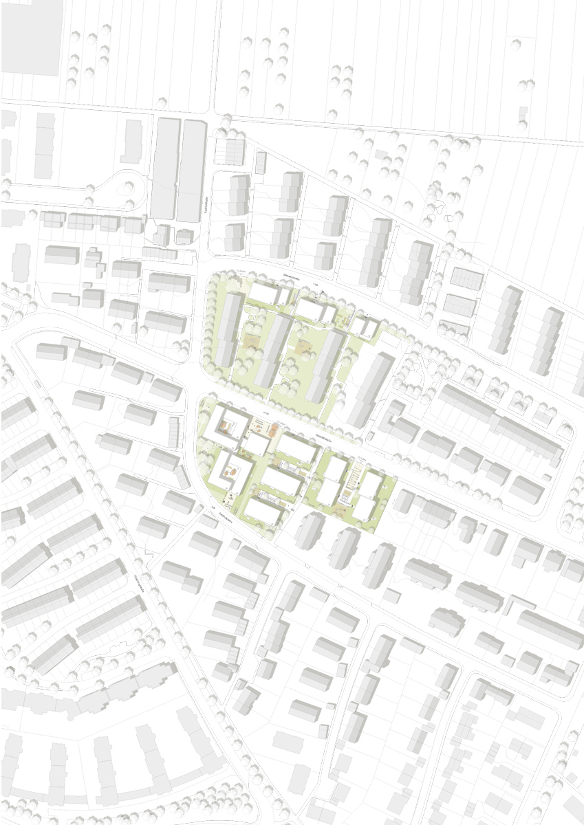 Das Planungsgebiet 1 wird durch drei präzise gesetzte Bausteine nachverdichtet. Jeder der drei Bausteine besteht aus zwei Baukörpern unterschiedlicher Höhe und Länge und kann sich so genau der vorhandenen Lücke anpassen. Der Baumbestand entlang der Straße bleibt so weit wie möglich erhalten und prägt auch in Zukunft den Straßenraum. Es wird an das vorhandene Wegenetz angeknüpft und dieses fortgeführen. Das Grün, das die Häuser umgibt, wird klar zoniert und zugeordnet, so dass keine undefinierten Außenräume entstehen. So werden den Erdgeschosswohnungen Gärten und den Eingangsbereichen Fahrradabstellplätze zugeordnet. Es werden Spielplätze angelegt und die Autos verschwinden von der Straße in eine Tiefgarage.