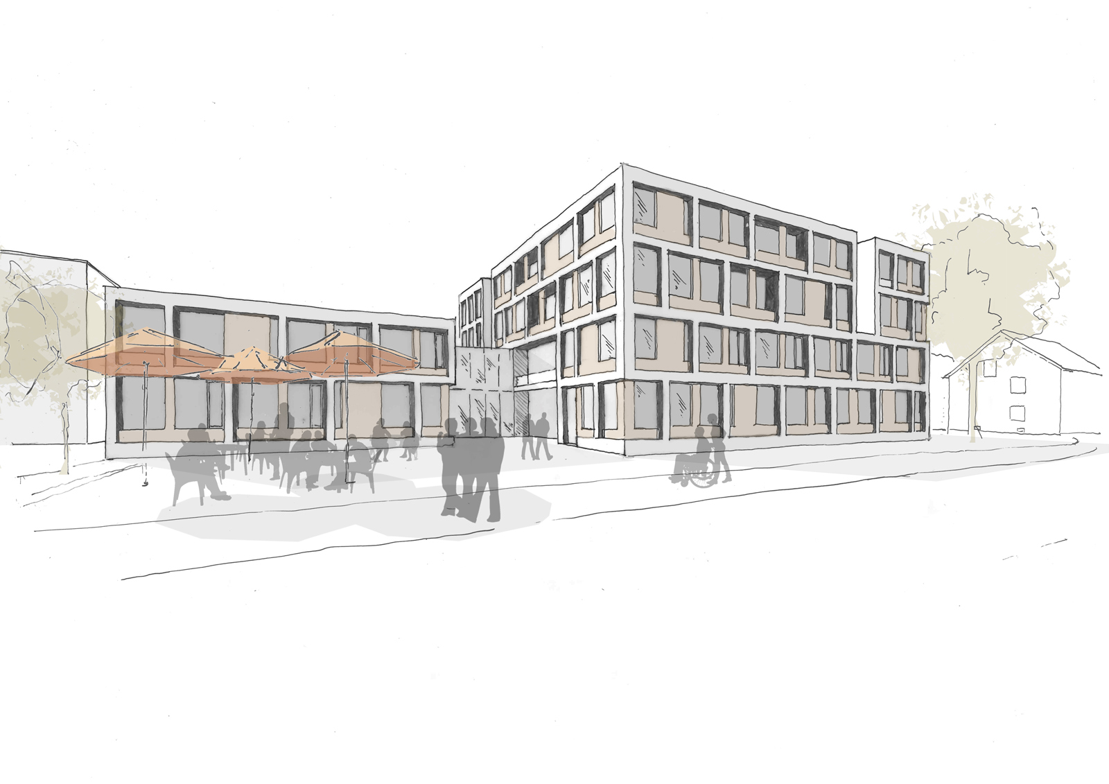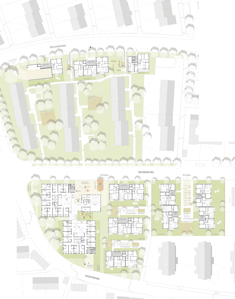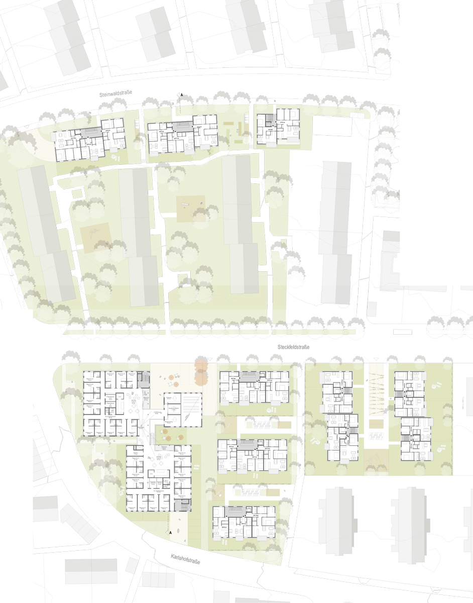Das Pflegeheim ist den Anforderungen entsprechend entworfen. Es gibt 4 Gruppen mit jeweils 12 Bewohnern. Jede Gruppe hat eine „Essküche", die Möglichkeit eines Rundganges und einen direkt zugeordneten Außenbereich. Der Pflegestützpunkt ist so platziert, dass beide Gruppen in einem Geschoss gut überblickt werden können. Die Arbeitswege des Personals sind kurz. Die Gemeinschaftseinrichtungen sind in einem gesonderten Baukörper untergebracht. Dies erlaubt für den Gesamtkomplex eine wirtschaftliche Erstellung, da nur gleiche Funktionen übereinanderliegen. Aufgeteilt sind die Gruppen auf zwei Baukörper. Beide Baukörper sind jeweils viergeschossig, jedoch in der Höhe um ein Geschoss versetzt, dem natürlichen Gelände folgend. Der Baukörper entlang der Steckfeldstraße übernimmt dabei die Rolle des Raumteilers. Er besetzt die prominenteste Stelle am Beginn der Steckfeldstraße. Dahinter liegt, ein Geschoss tiefer, der zweite Baukörper ausgerichtet zur Karlshofstraße. In diesem Baukörper liegen die betreuten Wohnungen einmal über dem Pflegeheim und einmal unter dem Pflegeheim. Das Geschoss unter dem Pflegeheim orientiert sich zur Karlshofstraße mit eigenen Privatgärten. Der „Eingangspavillon" mit den Gemeinschaftseinrichtungen ist von der Steckfeldtraße abgerückt und gibt somit den öffentlichen Raum frei für den Quartiersplatz, der gleichzeitig Eingangsplatz für das Pflegeheim ist. Die Geschosse des betreuten Wohnens sitzen bis auf das Geschoss, das sich zur Karlshofstraße orientiert, über dem Pflegeheim. Die Zimmer legen sich dabei um einen nicht überdeckten Innenhof, der als Dachgarten angelegt ist. Die Erschließung erfolgt über ein Laubengangsystem.