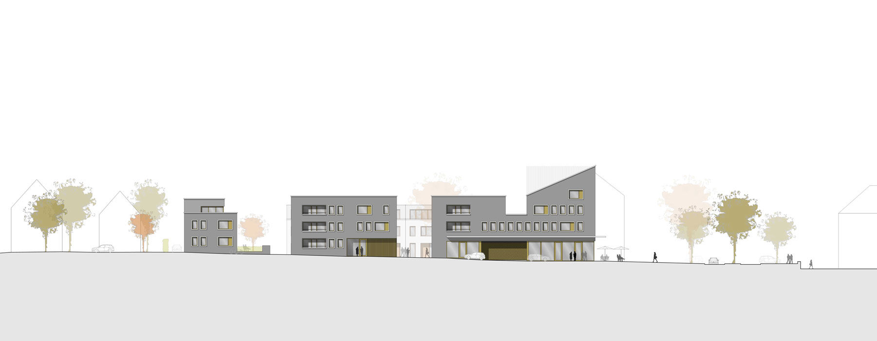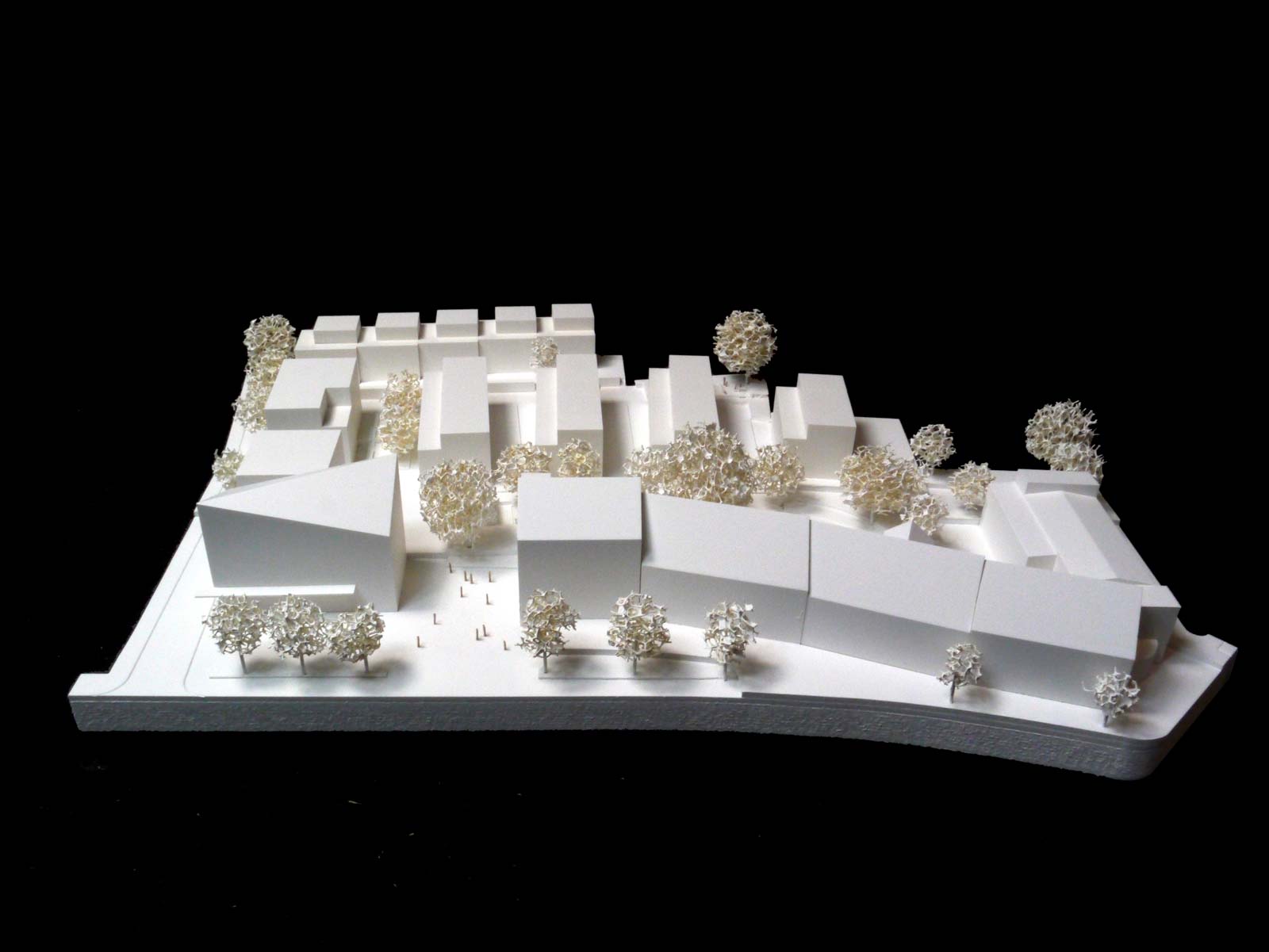 Der Vorschlag zur Neubebauung des Alten Feuerwehrareals folgt dem Gedanken, einer klaren städtebaulichen Figur im Äußeren ein kleinteiligeres Inneres entgegen zu setzen. Ausgehend von dem Wunsch, eine diagonale Durchwegung des neuen Quartiers vom Gemeindehaus bis zur Altstadt zu gewährleisten, haben wir auf überschaubare Raumkonfigurationen geachtet, deren Abfolge einen spannungsreichen Weg ergibt.