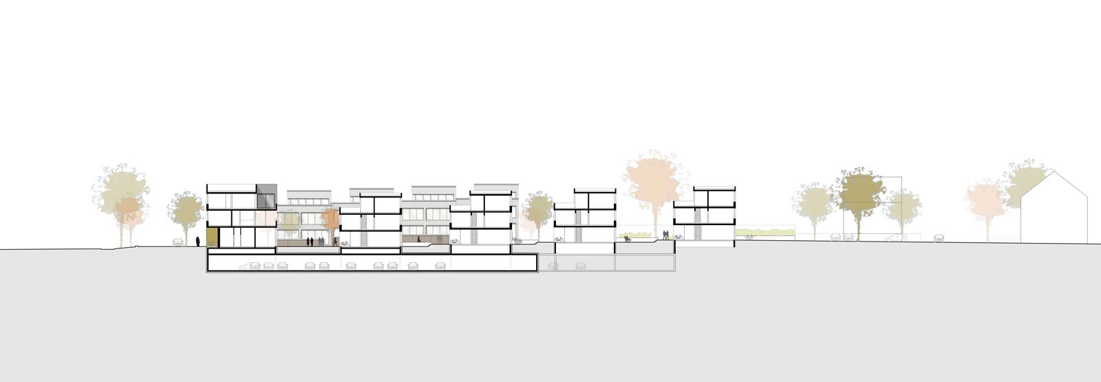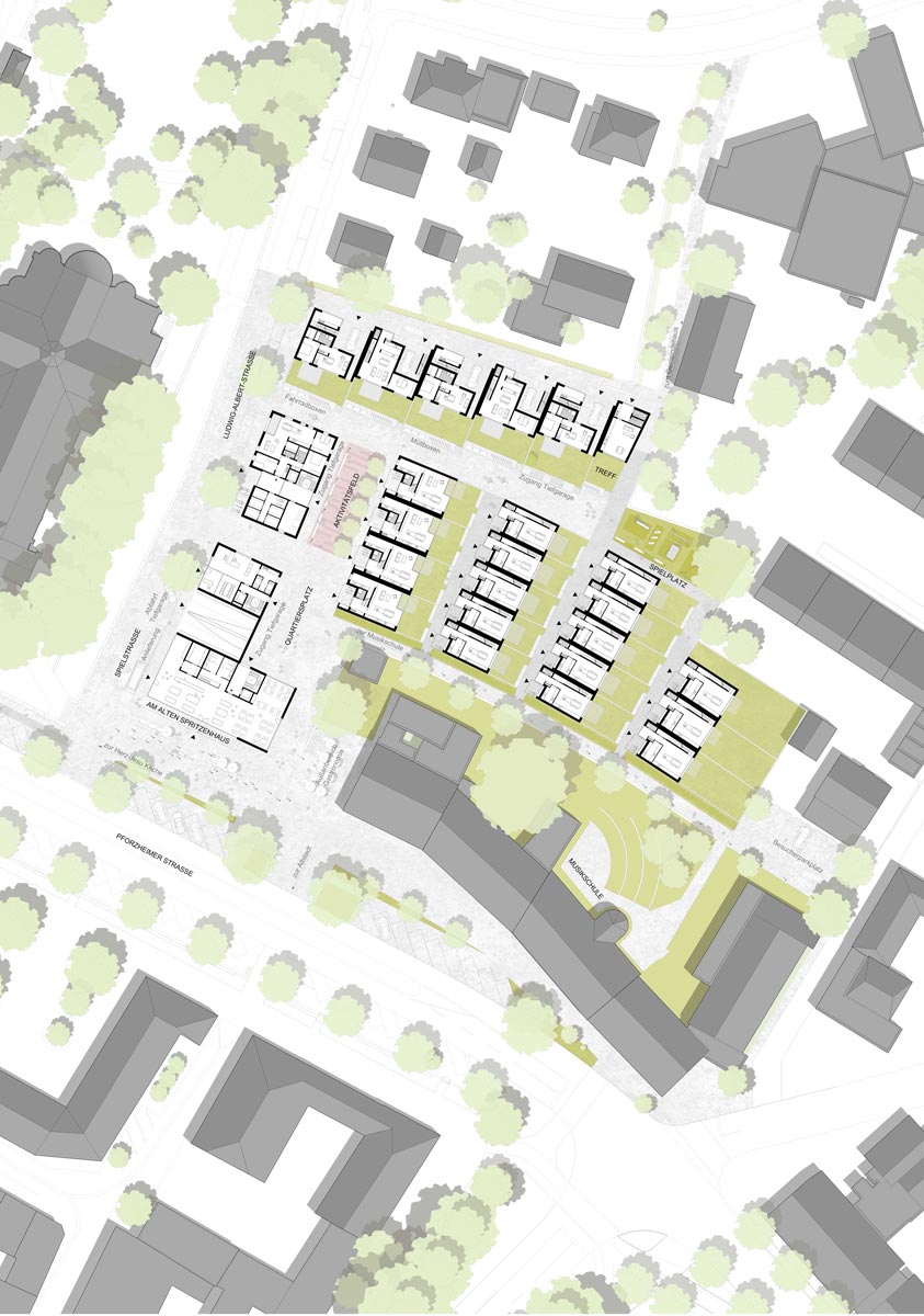 Die geschlossene Bebauung entlang der Pforzheimer Straße findet mit dem Hotel Sonne ihren Abschluss. Ein Solitärbau, aus der vorderen Bauflucht zurückgesetzt, bildet den Auftakt zum Kirchvorplatz und leitet ein in die straßenbegleitende Bebauung der Ludwig-Albert-Straße. Diese Aufweitung der ohnehin großzügigen Pforzheimer Straße verweist auf den historischen Stadtgrundriss, gibt die Sicht auf die Kirche frei und dem neuen Wohnquartier ein würdiges Entree. Das Quartiersinnere ist geprägt durch eine verdichtete Reihenhausbebauung in unterschiedlicher Ausformulierung, die sich auch über die angrenzenden Grundstücke erstrecken soll.