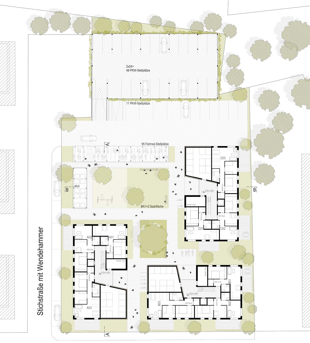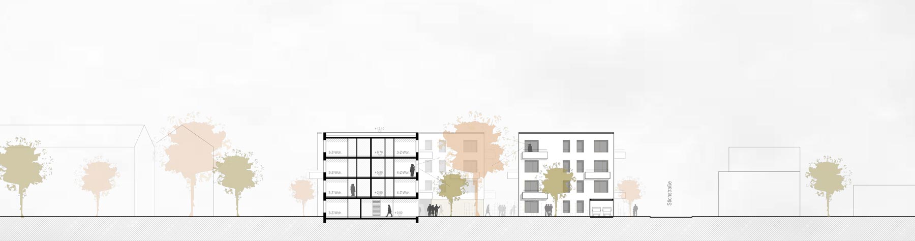 Kostengünstig Bauen heißt Bauen ohne Tiefgarage, d.h. die Parkierung findet in einer wirtschaftlich zu erstellenden Parkpalette komplett oberirdisch statt.