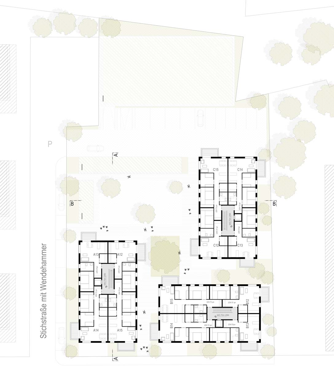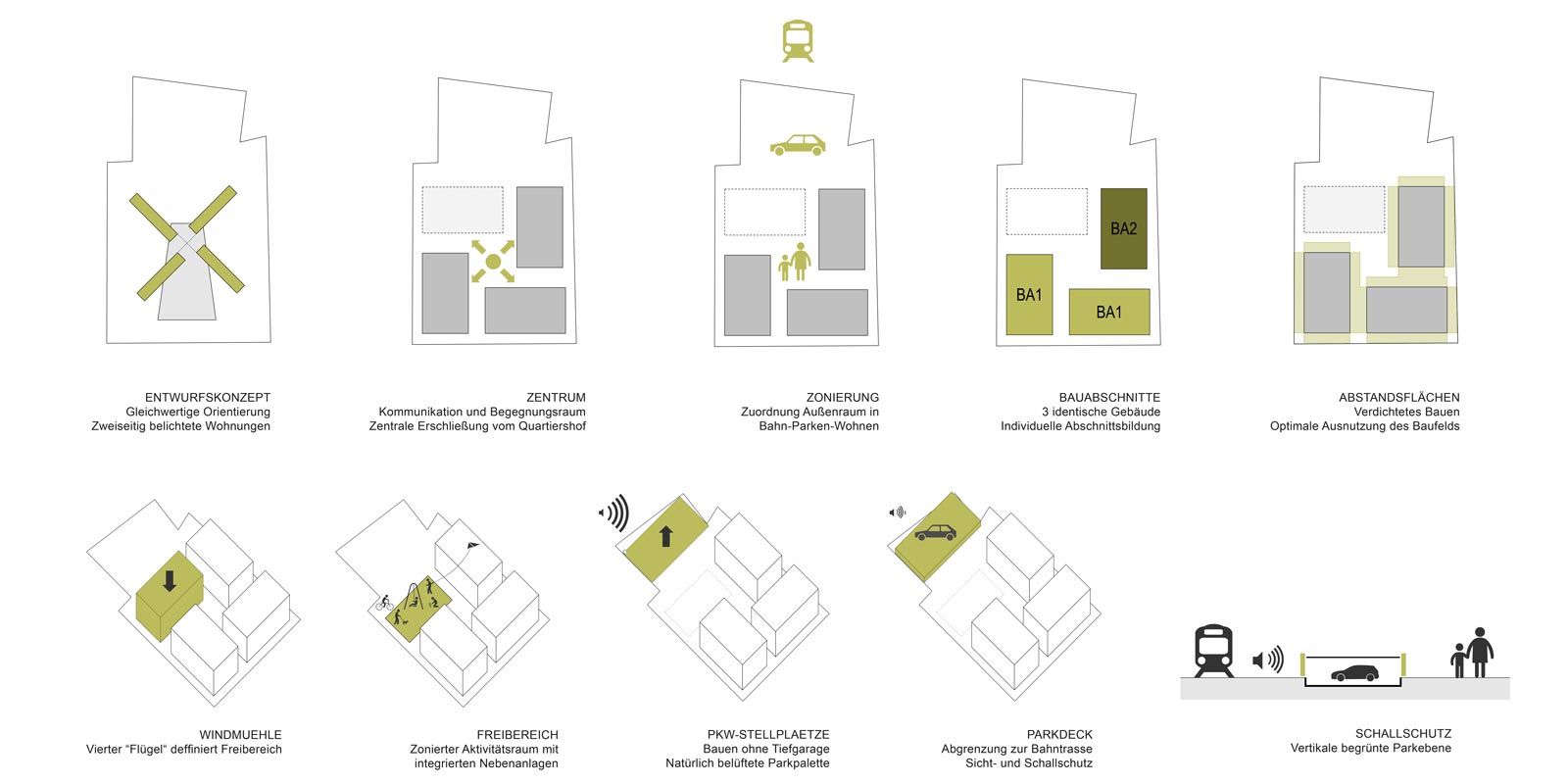 Vor diesem Hintergrund erklärt sich der Entwurf leicht: drei nahezu identische Häuser gruppieren sich um einen zentralen Quartiersplatz, begrenzt zur Bahn hin von einem begrünten, offenen Parkhaus. Der Verzicht auf Unterkellerung und eine teure Tiefgarage kommt einer anspruchsvollen Gestaltung der Frei- und Gemeinschaftsflächen zugute.