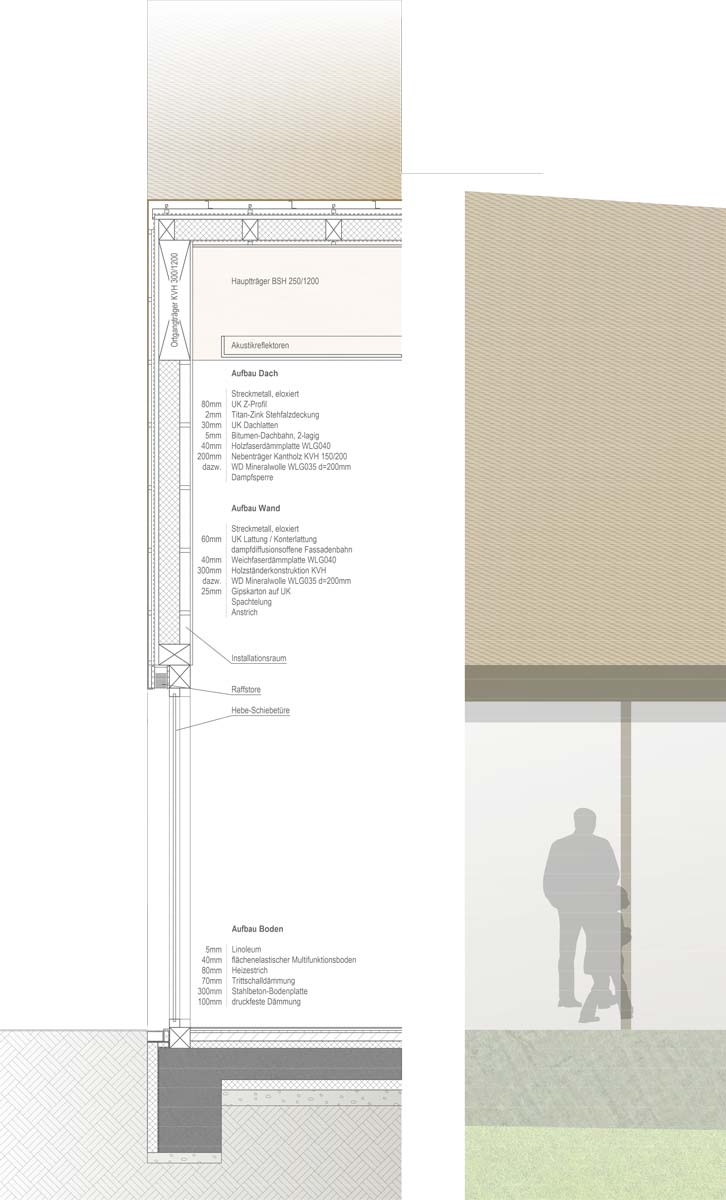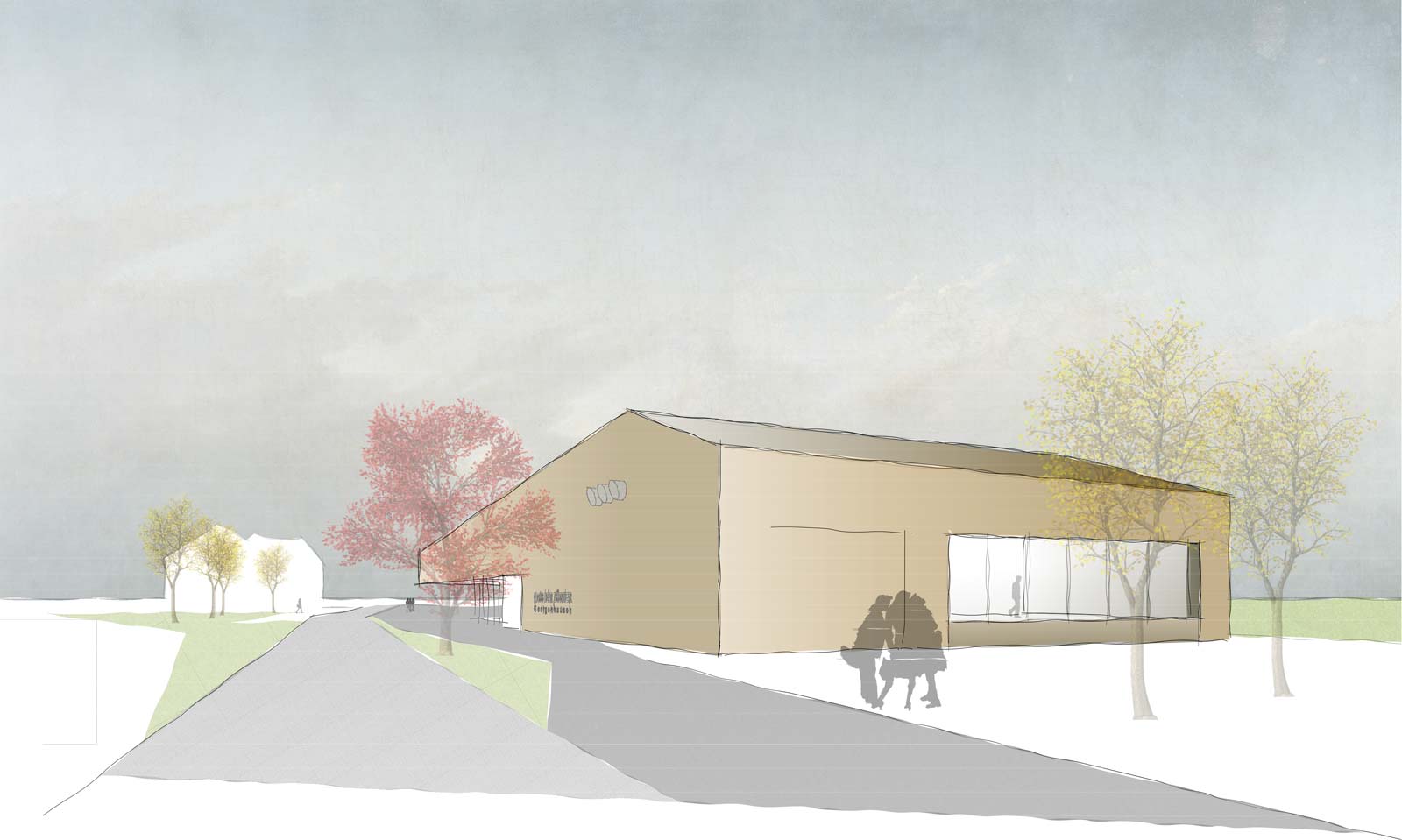 Der Entwurf zeichnet sich vor allem durch seine Einfachheit aus. Sowohl die archetypische Gestalt, die durch den homogenen Einsatz von Streckmetall für Fassade und Dachbekleidung gestärkt wird, als auch der einfache Grundriss unterstreichen dies. Garderobe und Küchenausgabe bilden jeweils die räumlichen Scharniere, über die die Besucher sanft in das Innere geführt werden. Der Saal mit seiner zur Bühne ansteigenden Decke wird durch kräftige hölzerne Querträger rhytmisiert.