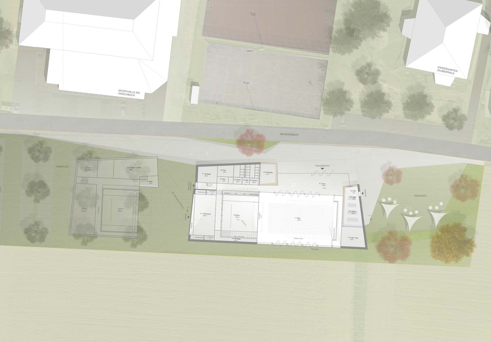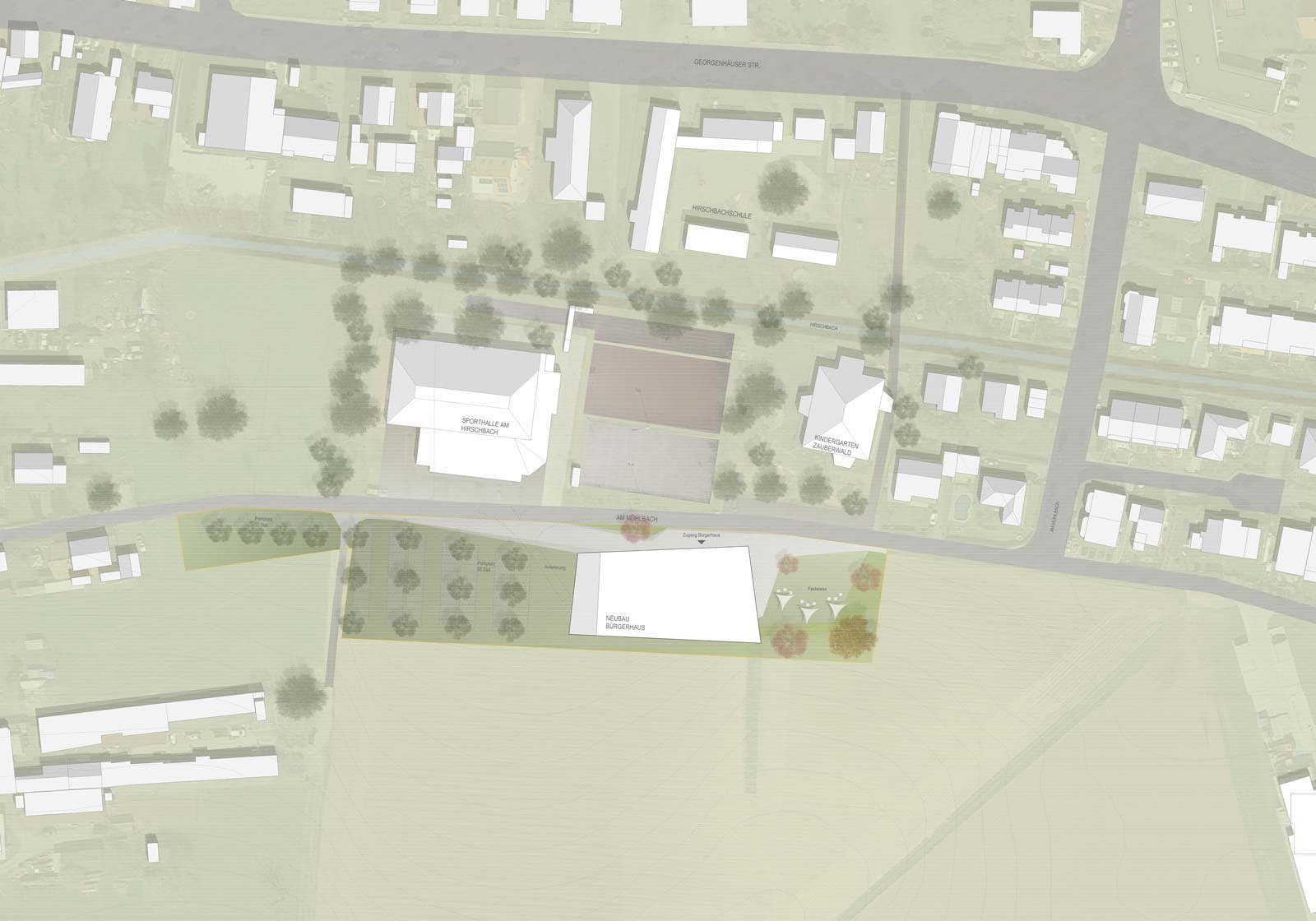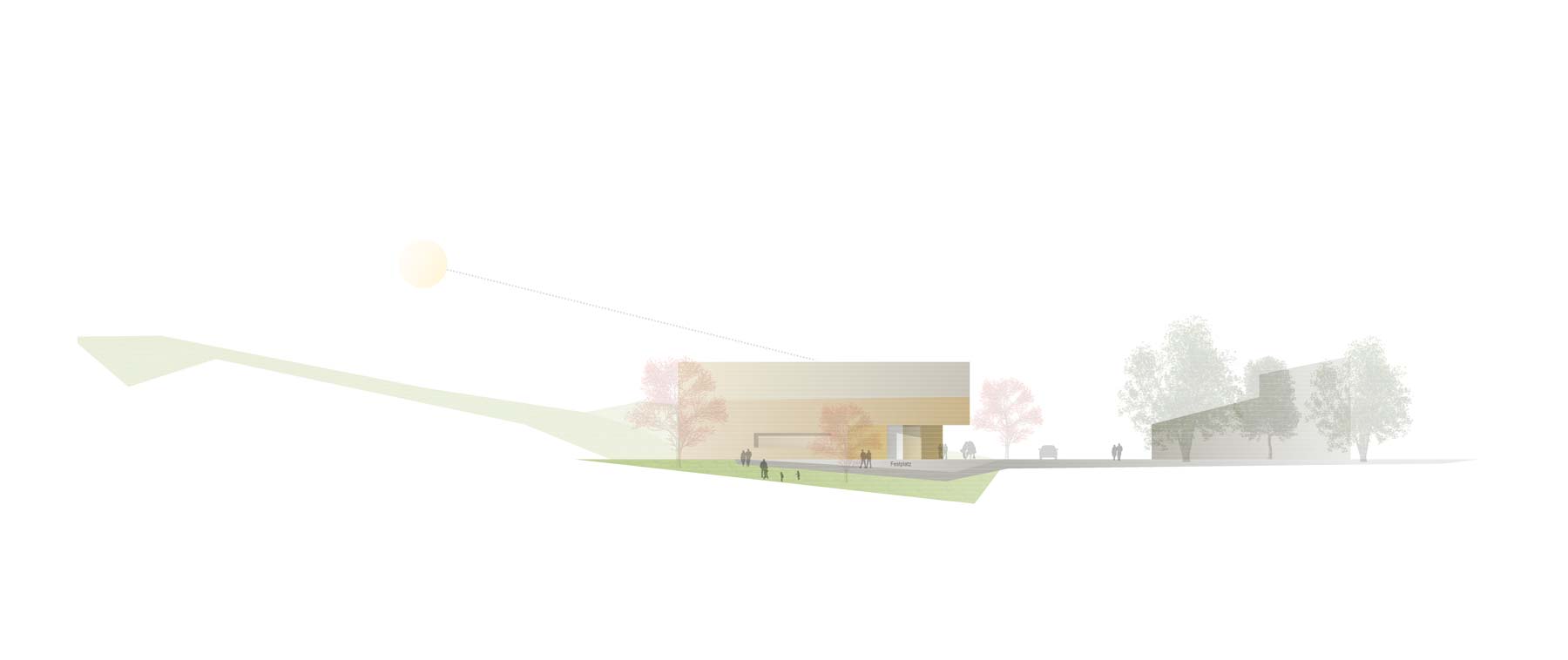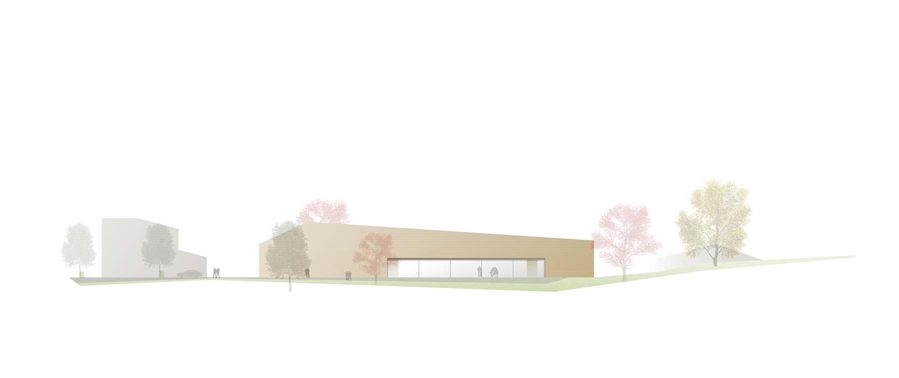 Ein „Haus der Bürger", das für die Bürger auch als solches erkenntlich sein soll - einfache, deutliche, archetypische Grundform, mit einladender Geste zur Straße, in die Topographie gedreht, einfach benutz- und bespielbar. Als vierter Baustein ergänz das Bürgerhaus das Ensemble aus Kindergarten, Schule und Sporthalle. Zur einen Seite öffnet es sich dem Besucher mit einer weit auskragenden Überdachung und großzügiger Verglasung. Vom Parkplatz im Westen kommend, führt ein breiter Weg an der dem Besucher leicht zugewandten Fassade entlang zum Haupteingang.