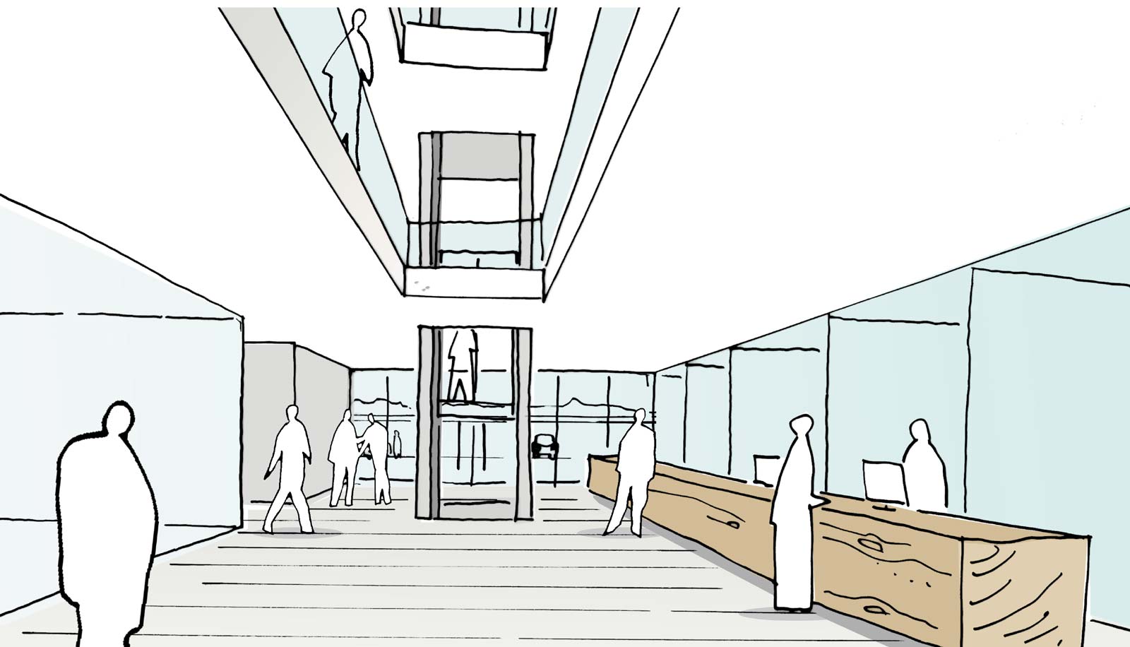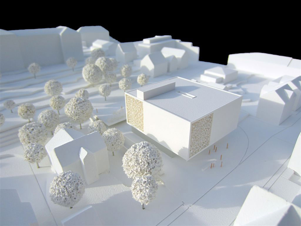 Die Zugänge für Fußgänger und ruhendem Verkehr sind klar von einander getrennt. Durch eine Trennung von Zufahrt in und Ausfahrt aus der Tiefgarage werden geschickt die Stellplätze unter dem Gründach mit in den Parkverkehr aufgenommen. Mit den Fahrrädern kann man direkt zum Eingang fahren und diese geschützt unter der Auskragung abstellen. Das Erdgeschoss ist der Verwaltung, dem Aufenthalt und dem Besucherverkehr vorbehalten. Die Seminare finden ausschließlich in den Obergeschossen satt. Im offenen geräumigen Foyer ist Platz für Ausstellungen und Veranstaltungen. Gegebenenfalls könnte auch der Aufenthaltsraum dem Foyer durch eine mobile Faltwand zugeschaltet werden. Der niedere lange Tresen steht für eine offene Willkommenskultur.