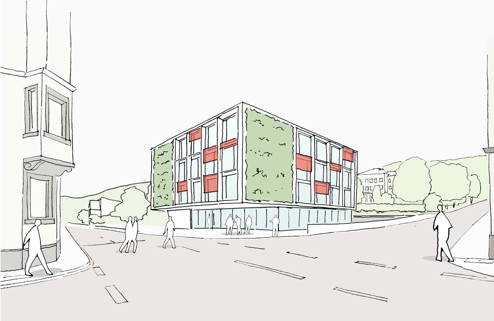 Mit dem Zurückweichen des Baukörpers von der Bauflucht entsteht ein kleiner Vorplatz, der durch die starke Auskragung der Obergeschosse geschützt wird und die Besucher in das offene Erdgeschoss geleitet. Der zum Stadtraum breit angelegte Platz steht für ein offenes Haus. Der ruhende Verkehr wird bewusst der öffentlichen Sicht entzogen. In einer Tiefgarage und in einem mit Gründach überdeckten offenen Parkplatz kommen die Autos zum Stehen. Das Gründach entwächst dem Gelände und verbindet sich wie selbstverständlich mit der Parkanlage des ehemaligen Aufbaugymnasiums. Das intensiv begrünte Dach kann von den Seminarteilnehmern als Aufenthaltsfläche genutzt werden und dient natürlich als Regenrückhaltung. Gleiches gilt für den Dachgarten auf dem Gebäude. Insgesamt soll die eigentlich versiegelte Fläche durch die intensive Begrünung aller Dachflächen nachhaltig gestaltet und besser nutzbar gemacht werden. Die begrünten Fassaden spielen neben ihrer bildhaften auch eine wichtige Rolle für die Luftreinhaltung und für den Lärmschutz.