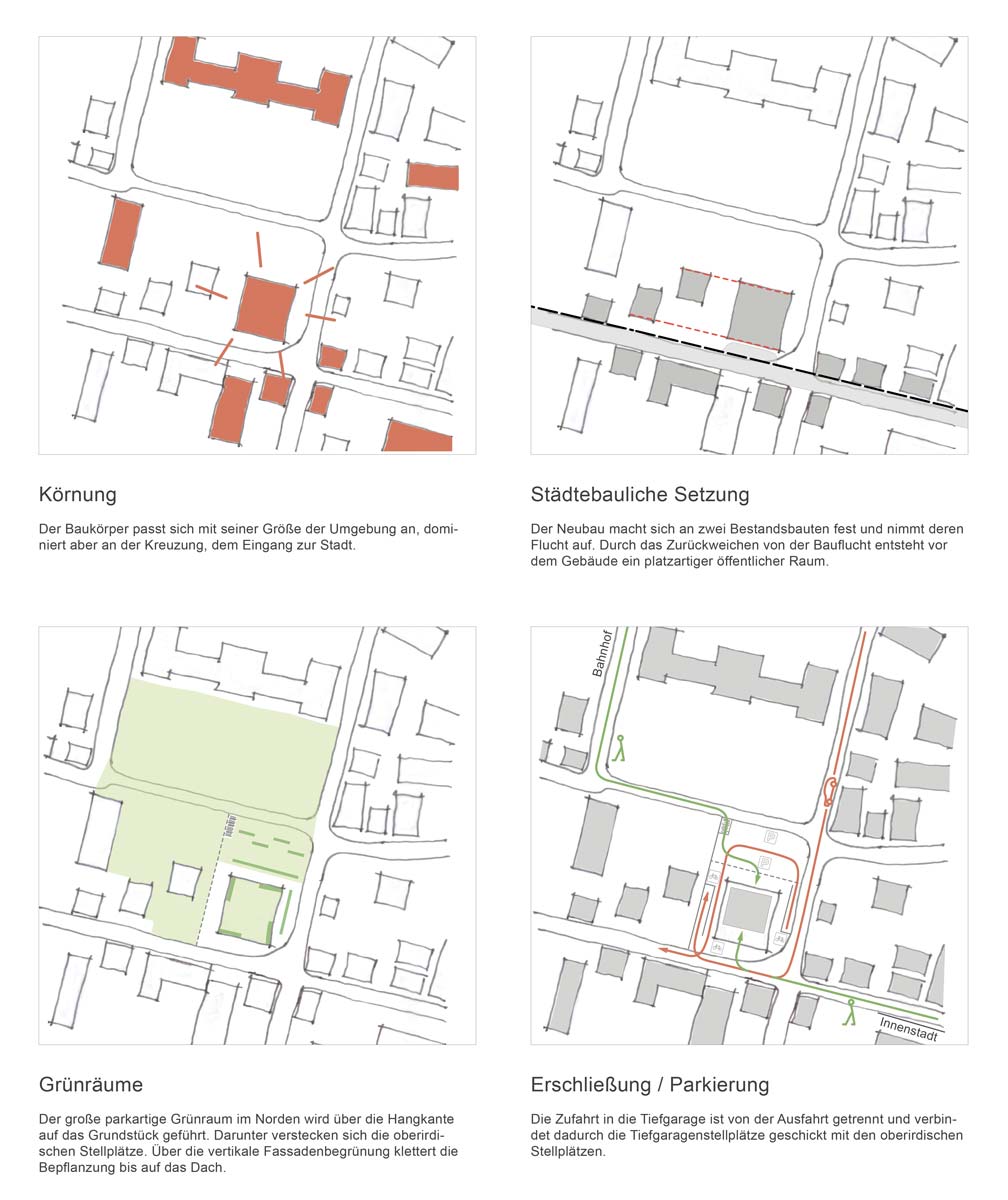 In einem präzise gesetzten Baukörper mit offenem Erdgeschoss, der sich zur Stadt öffnet und dessen Außenanlagen die grüne Hangkante des dahinterliegenden Parks aufnimmt sehen wir die Lösung, in einem Baukörper, in dessen Obergeschossen die Bildungseinrichtungen liegen und der durch seine begrünten Fassaden Innovation verkörpert, in einem Baukörper, der durch sein kompaktes Volumen für eine geringe Hüllfläche und damit für energieeffizientes und nachhaltiges Bauen steht, in einem Baukörper, der durch den explizit außenliegenden Sonnenscreens effektiven Schutz vor dem Wärmeeintrag der Sonne bietet, in einem Baukörper, der sich selbstbewusst als Solitär zeigt und den nördlichen Stadteingang prägt. Ein solcher Baukörper im Stadtraum mit den beschriebenen Eigenschaften soll für eine grüne Innovation stehen, die sinnbildlich die IHK Nordschwarzwald präsentiert.