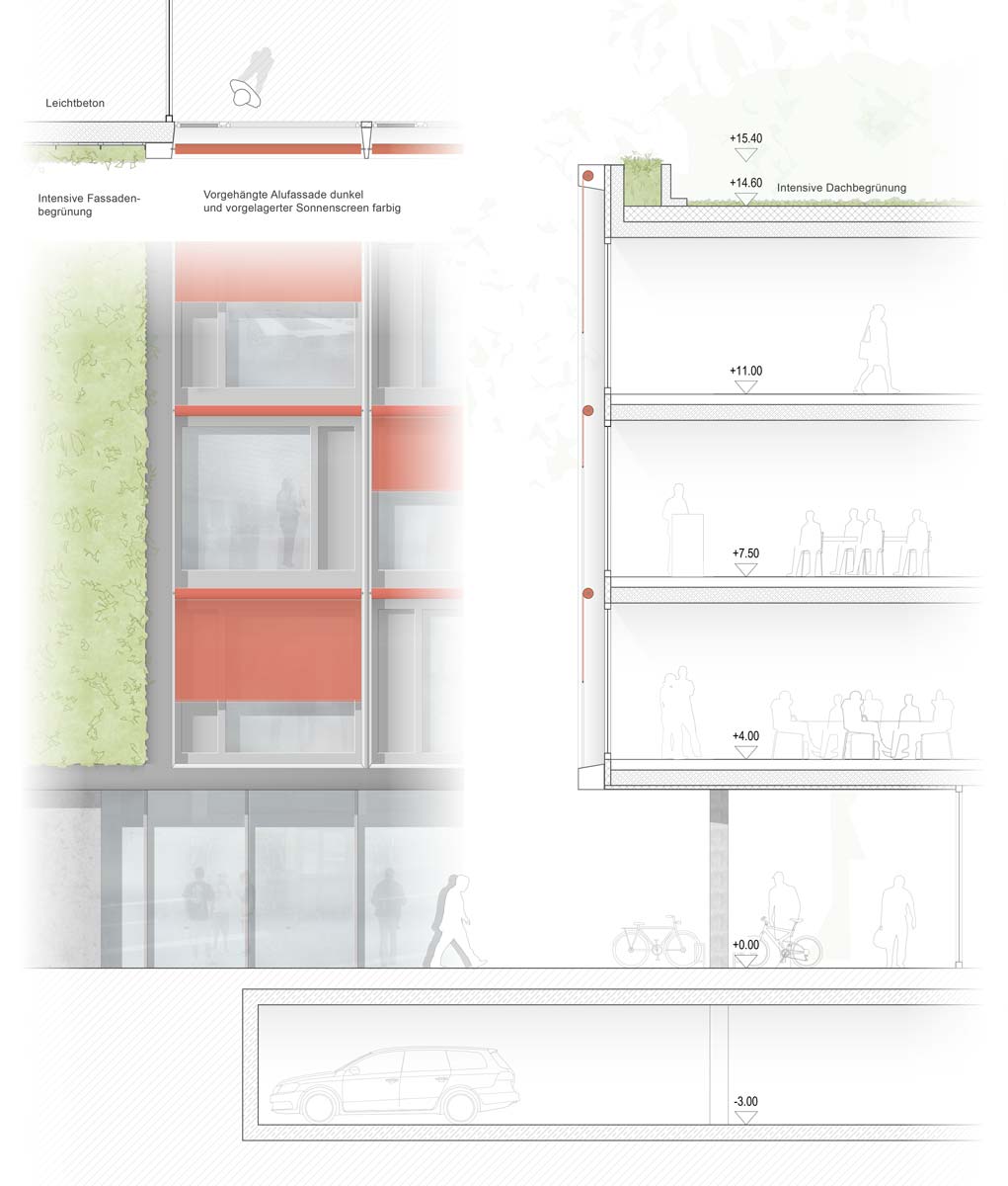 Die Konstruktion des Hauses ist denkbar einfach: ein Skelettbau mit aussteifenden Kernen und Scheiben. Die Decken sind vorgespannt, die Fassaden vorgehängt. Die Scheiben mit der vertikalen Begrünung dienen neben der Aussteifung auch als Pufferspeicher. Wenn konstruktiv möglich könnten dies auch monolithisch in größerer Stärke in Leichtbeton (umgangssprachlich Wärmedämmbeton) ausgeführt werden, um erstens auf Dämmplatten verzichten zu können und zweitens im Inneren eine bessere Schallabsorption zu erreichen. Leichtbeton ist nämlich ein hervorragender Baustoff für den Schallschutz und deshalb prädestiniert für den Seminarbereich.