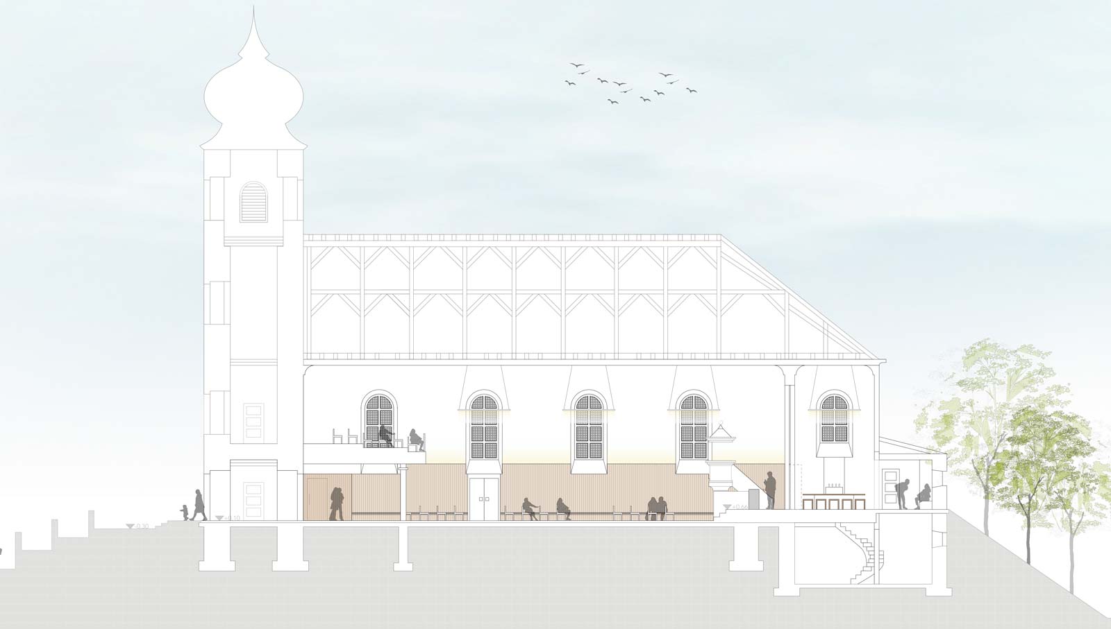 Zwei grundsätzliche Überlegungen liegen unserem Entwurf zugrunde: wie können wir die Erschließung der Petruskirche verbessern und zugleich den Baukörper besser mit dem angrenzenden Stadtraum verbinden – und wie kann eine Parallelnutzung von Gemeinde- und Kirchenraum ohne gegenseitige Störung gewährleistet werden.