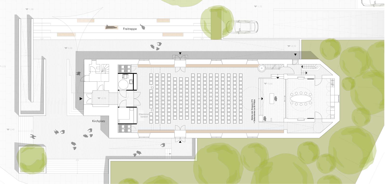Eine vergrößerter Platzbereich vor dem Haupteingang schafft in Verbindung mit einer städtebaulich inszenierten Rampenanlage einen angemessenen Zugang; zugleich wird der Pfarrgarten durch die Stufenanlage der Terrasse mit neuem Zugang vom Kirchenschiff aus einbezogen. Der Keller erhält einen anfahrbaren Außenzugang wodurch er als vollwertiger Lagerraum genutzt werden kann.