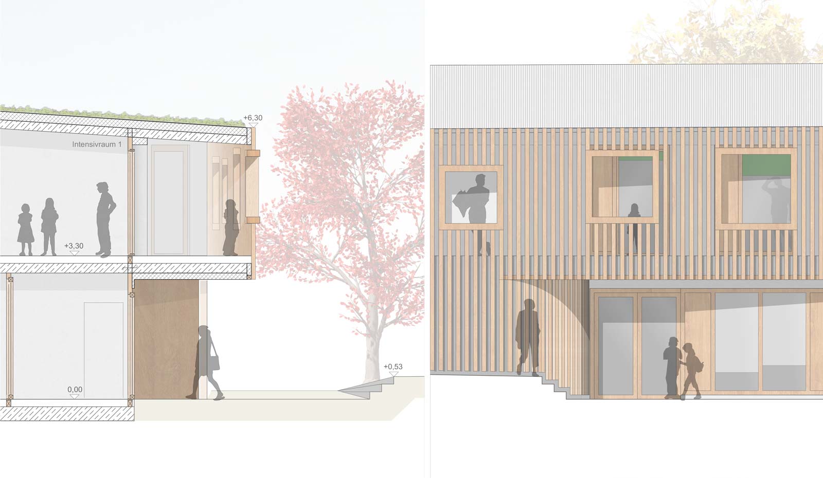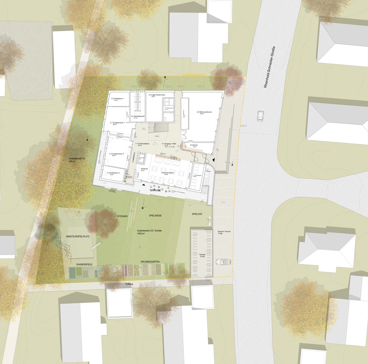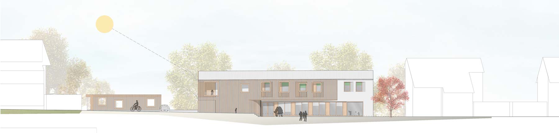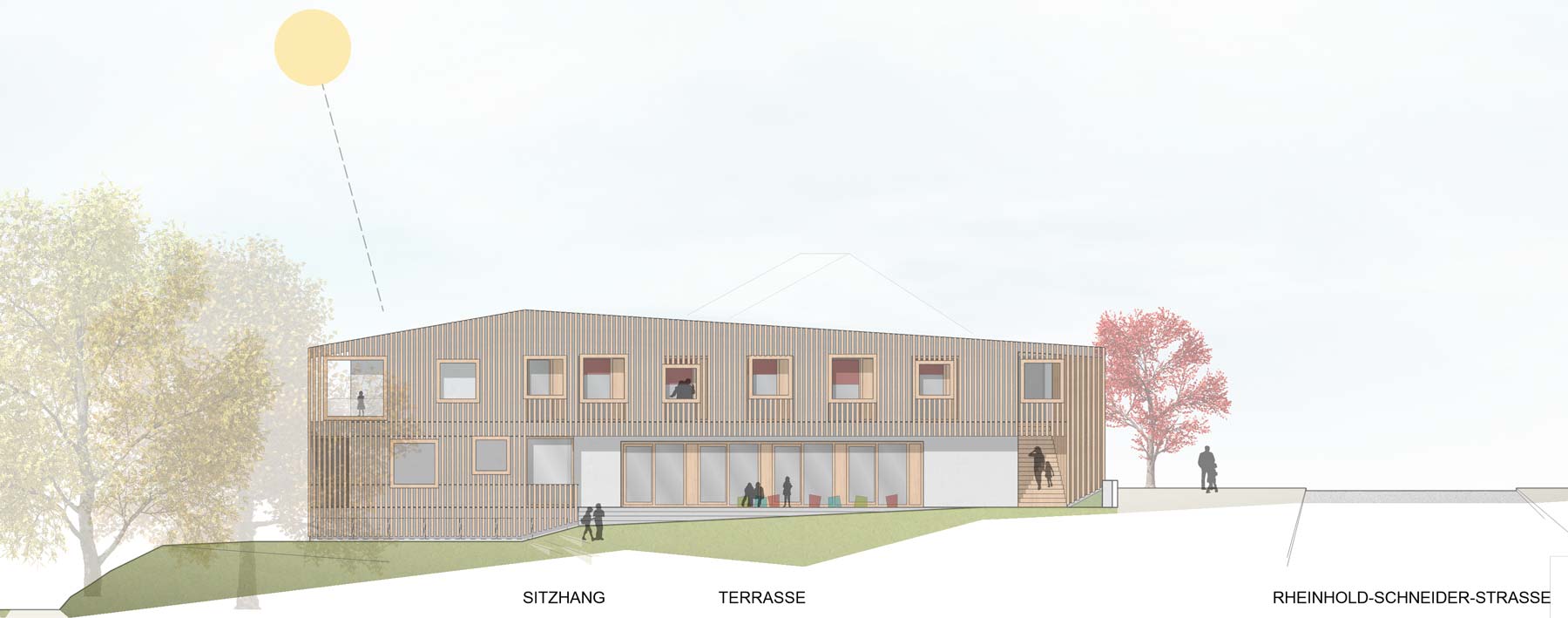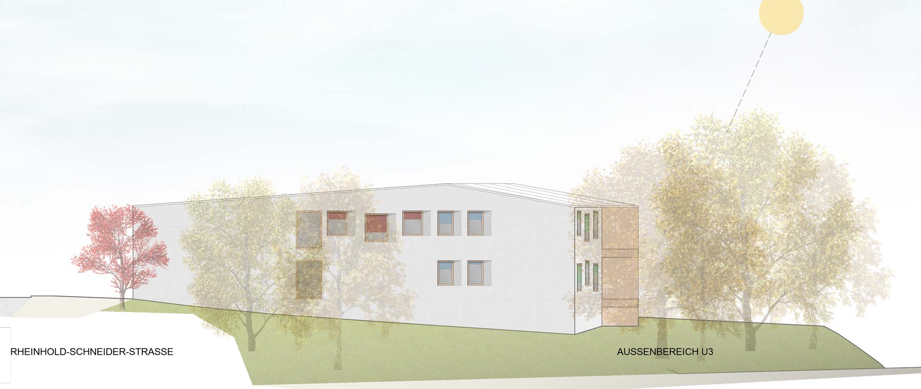 Die Anordnung des umfangreichen Raumprogramms über drei Geschosse ermöglicht die Ausbildung eines kompakten Baukörpers, der sich städtebaulich in Größe und mit seinem leicht geneigten Satteldach formal in den ruhigen Duktus der Umgebung eingliedert. In der nördlichen Grundstückshälfte verortet, bildet der Baukörper des Kinderhauses zusammen mit der Fahrradeinhausung entlang der Rheinhold-Schneider-Straße ein Ensemble welches, den sonnigen, nach Süden orientierter Außenraum rahmt.