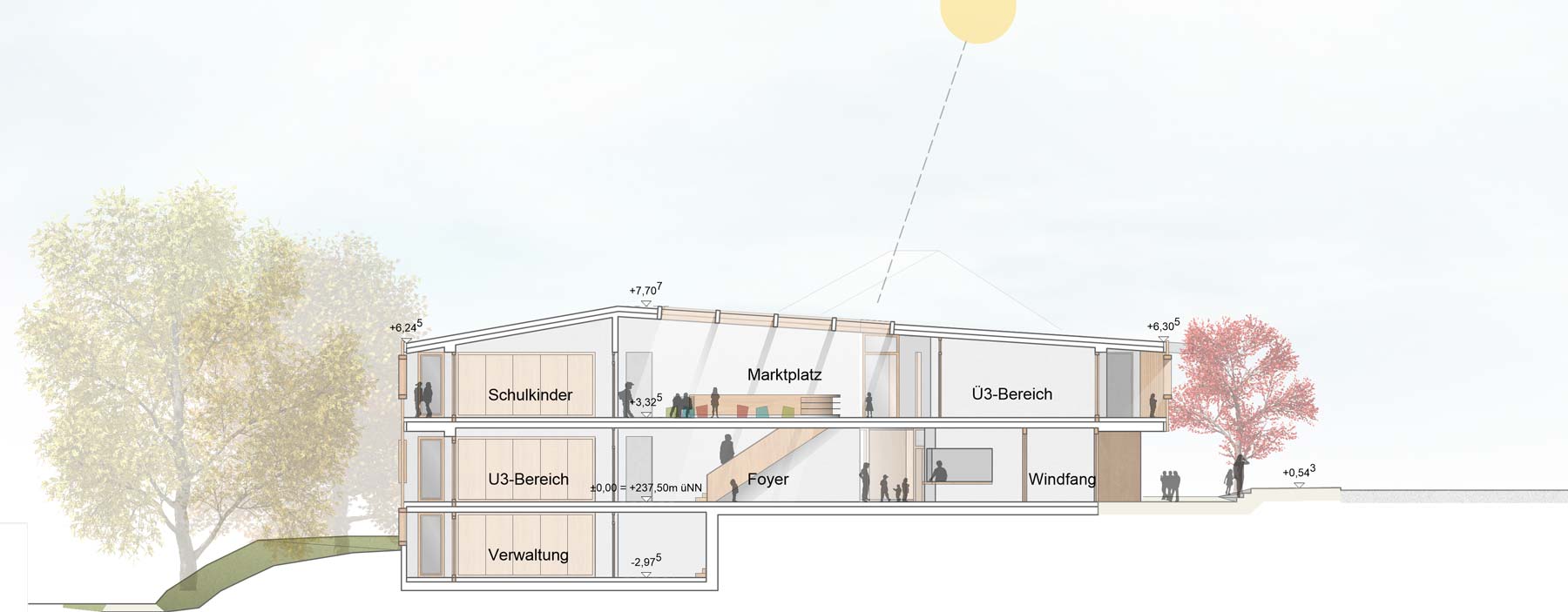 Ein Haus für Kinder - als Ort der Kommunikation, durchlässig und offen, doch bergend zugleich. Das neue Kinderhaus Gundelfingen soll sich als Ort des gemeinsamen Spielens, Lernens und des Austausches zwischen verschiedenen Altergruppen präsentieren. Die Bauaufgabe ist damit geradezu prädestiniert sich in einem Atrium- oder Zentralbau auszudrücken. Folglich ordnen sich die verschiedenen Bereiche und Nutzungen windmühlenartig um eine gemeinsame Mitte an und bilden somit einen zentralen "Marktplatz". Das Haus somit begriffen als Stadt, mit Wegen, Gassen, Nischen und Plätzen, Innen- und Außenräumen die zum Verweilen, Wandeln und Entdecken einladen.