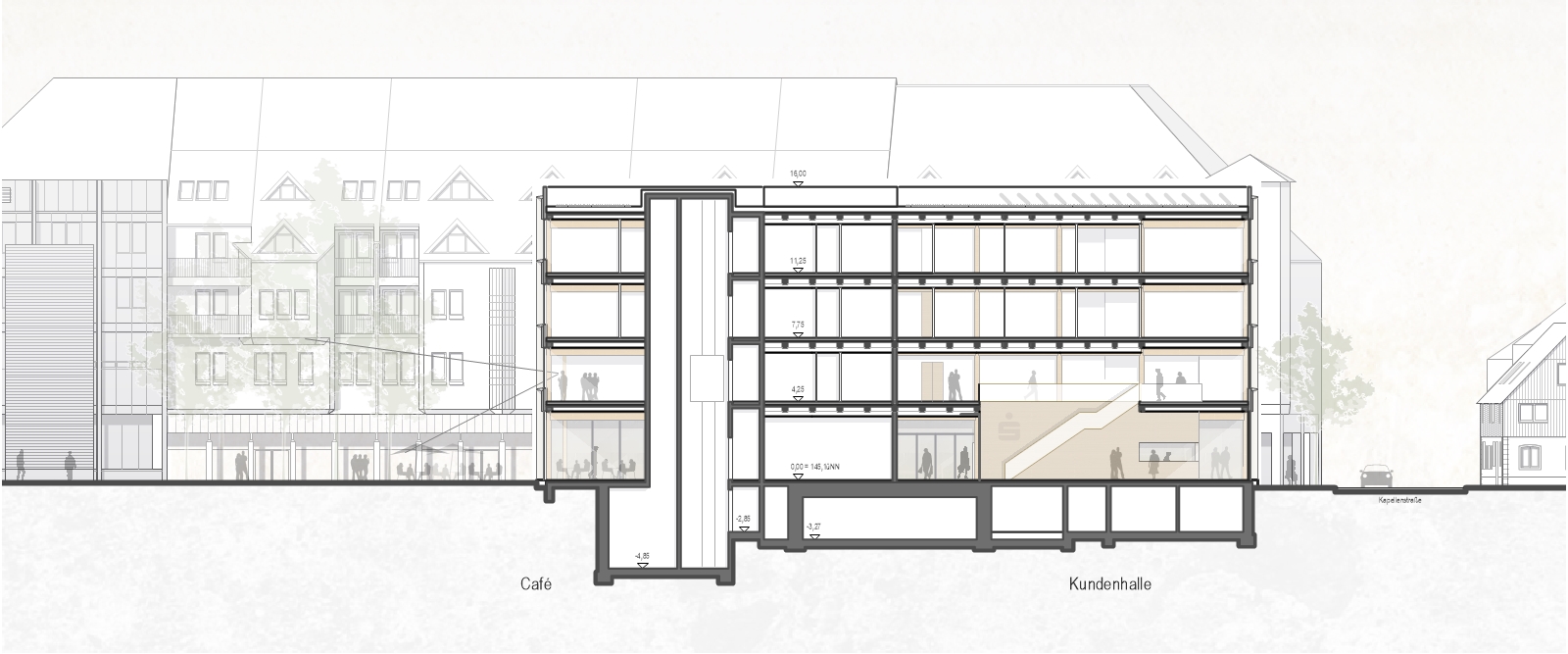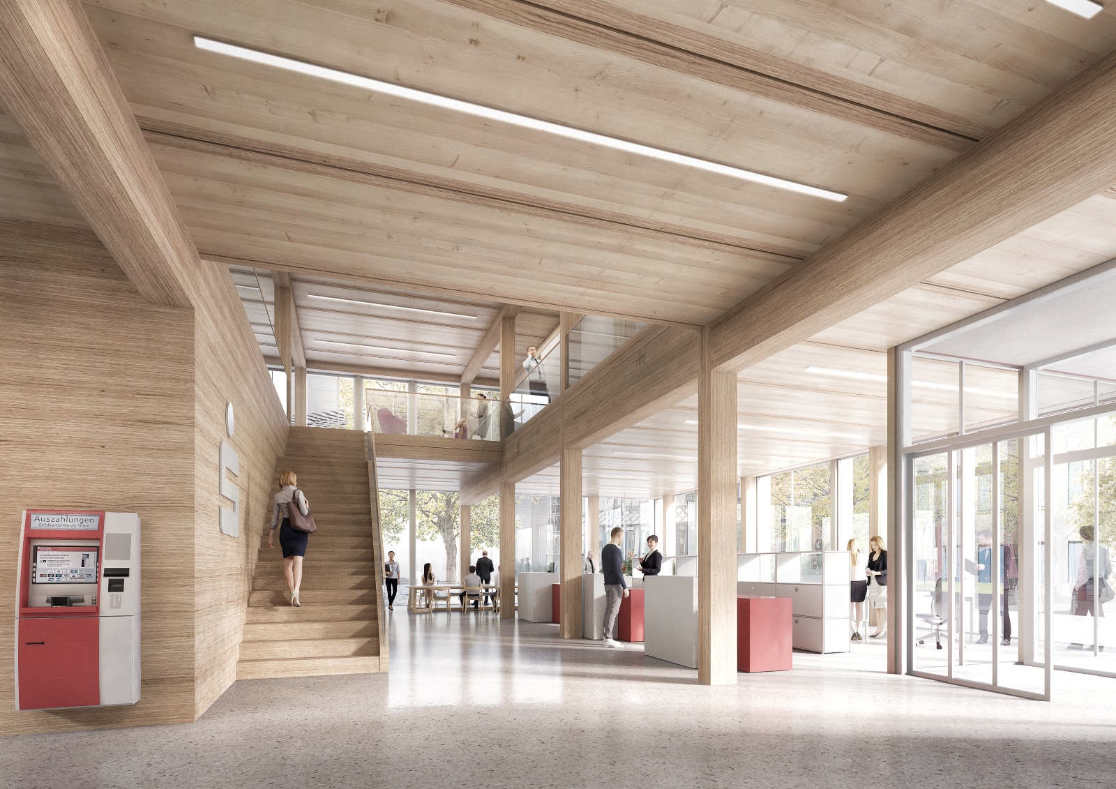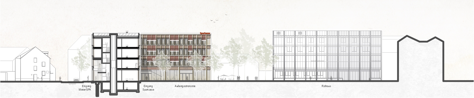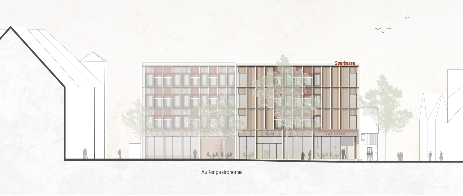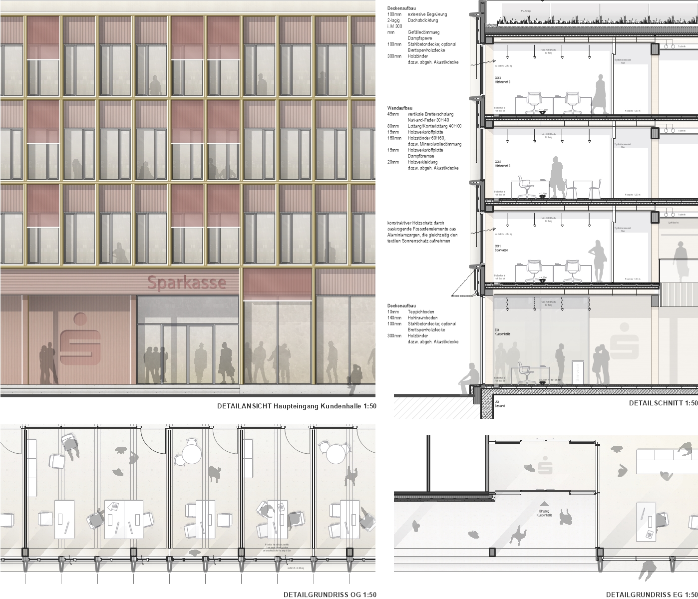 Betritt man die Kundenhalle über den SB-Bereich führt gegenüber der Servicepoints eine breite einläufige Treppe als einladende Geste direkt in das Kundenzentrum. Wir haben bewusst nur die geforderten zwei Beratungsräume im EG platziert, um soviel „öffentlichen Raum" wie möglich in der Kundenhalle zu schaffen. Die Halle kann sich so zusammen mit der Nachbarschaftsfläche über die Fassaden besser zum Stadtraum präsentieren. Das Erdgeschoss wird dadurch von Büroräumen freigehalten, die sich zum öffentlichen Raum eher abschotten, und die Arbeits- und Beratungsplätze wandern ins 1. Obergeschoss. Nur der Hauptzugang und die Kundenhalle der Sparkasse mit ihren öffentlichen Funktionen verbleiben im Erdgeschoss. Somit werden zum einen gut vermietbare Ladenflächen im Erdgeschoss für die Sparkasse generiert, zum anderen zusätzliche Geschäfts- und Gastronomieflächen für den öffentlichen Raum geschaffen. In der Fläche des Mietbereichs 2 könnte so später auch eine Ladenfläche entstehen. Die Erschließungskerne, die durch das zu erhaltene Untergeschoss vorgegebene waren, wurden übernommen. Dabei haben wir den schon angelegten Gebäudetypus eines Dreibundes mit der innenliegenden Erschließung klarer ausgearbeitet und die Rücksprünge im Baukörper gefüllt. Die bisher frei im Grundriss platzierten WC-Anlagen sind den zwei Erschließungskernen zugeordnet. So ließen sich bei Bedarf pro Geschoss bis zu 4 Einheiten verschiedenster Größe erschließen oder auch nur eine große zusammenhängende Fläche, die sich nach Belieben einteilen lässt mit den entsprechenden Fluchtweglängen. Die Struktur ist äußerst flexibel. Von Zellenbüros über Kombibüros bis zur offenen Arbeitslandschaft kann alles angelegt werden. Das Bürorastermaß von 1,50 m unterstützt diese Flexibilität und ist ideal für einen Beraterarbeitsplatz, der aus zwei Achsen besteht und damit im Lichten 2,90m misst. Das Gebäude soll in Holzhybridbauweise konstruiert werden, Stützen und Deckenelemente vorfabriziert. Dabei bestehen die wesentlichen tragenden Teile aus Holz, die entsprechend der baurechtlichen Vorschriften hochfeuerhemmend ausgebildet werden. Die Spannweiten der Decken liegen bei für Holz wirtschaftlichen 7 m. Aufgrund der Schwingungen, des Schallschutzes und zur thermischen Nutzung der Gebäudemasse sind vorfabrizierte Holz-Beton-Verbunddecken vorgesehen, wobei auch eine reine Holzkonstruktion mit einem Druckbereich aus einer Brettsperrholzdecke angedacht werden könnte. Die Erschließungskerne werden zur Aussteifung aus Stahlbeton erstellt. Die bei deren Überbauung nachzuweisende Retentionsfläche, liegt in einem Hohlraum unter der überbauten Fläche, wohin das Wasser bei einem Hochwasserereignis (HQ 100) gezielt abgeleitet werden kann. Die Fassade soll die nachhaltige Holzkonstruktion außen sichtbar machen und damit auch das nachhaltige Wirtschaften der Sparkasse als Selbstverständnis transportieren. Die Farbe rot gilt dabei als wichtiges Markenzeichen der Sparkasse neben dem Schriftzug und dem Logo. Deshalb wählen wir neben Holz-Alu-Fensterelementen eine rot lasierte Holzschalung als Außenfassade. Dabei ist von entscheidender Bedeutung, dass ein konstruktiver Holzschutz vorhanden ist. Um die Fassade dauerhaft vor den Witterungseinflüssen zu schützen, sehen wir tiefe Aluzargen vor, die zudem den außenliegenden auch in Rot gehaltenen textilen Sonnenschutz aufnehmen und im Brandfall als Brandriegel dienen. Die rote Holzschalung ist nur im Sturzbereich vorgesehen, dass kein Spritzwasser auf das Holz einwirken kann und sich unschöne Verfärbungen bilden könnten. Somit ist trotz der Verwendung von Holz in der Außenfassade eine dauerhafte Ansehnlichkeit gewährleistet. Für die Wärme– und Kälteerzeugung und zur Stromversorgung könnte ein BHKW zum Einsatz kommen unterstützt durch Photovoltaikmodule auf dem Dach. Die Warmwasseraufbereitung in den WC-Einheiten erfolgt dezentral mit Durchlauferhitzer. Eine mechanische Lüftung mit Wärmerückgewinnung und Heiz- Kühldecken sorgen in allen Jahreszeiten für ein angenehmes Raumklima. Zur Installationsführung von Elektroleitungen wird das Deckensystem oben mit ein Hohlraumboden ergänzt. Die Lüftungsleitungen, Heiz- und Kühlleitungen werden in der Konstruktionsebene geführt, die Heiz-und Kühldeckenelemente mit Akustikwirkung dazwischen gehängt.