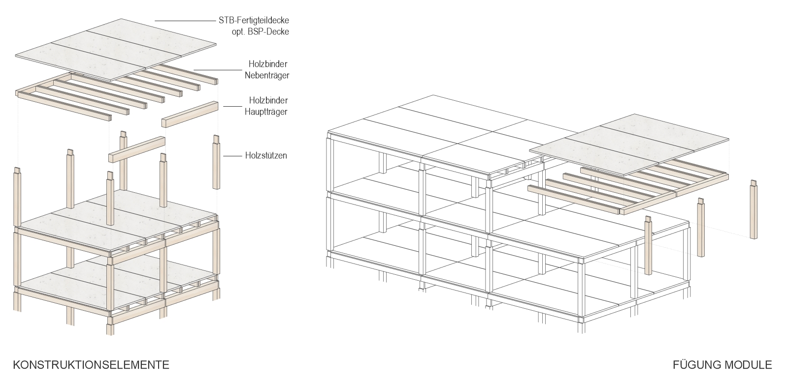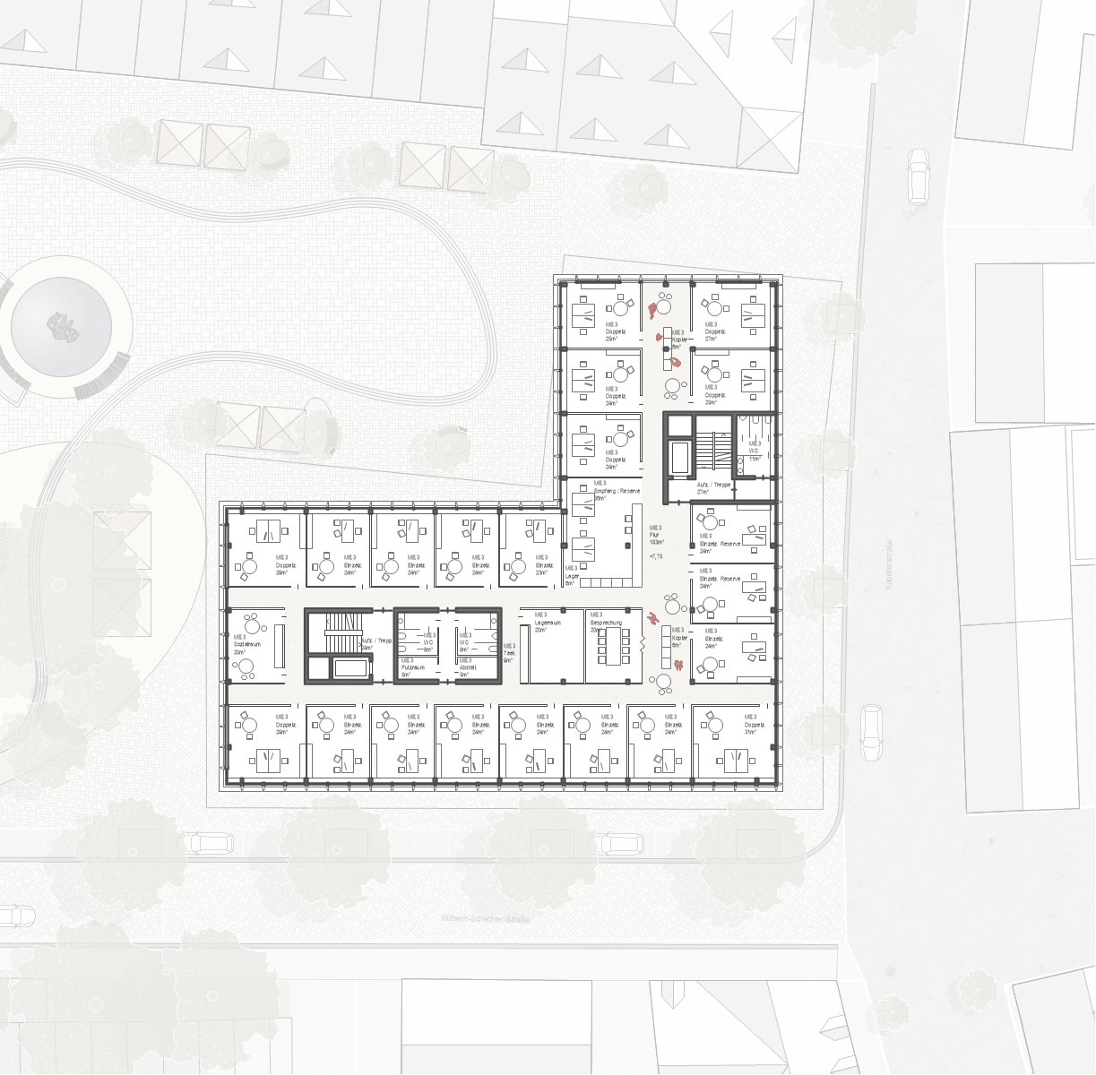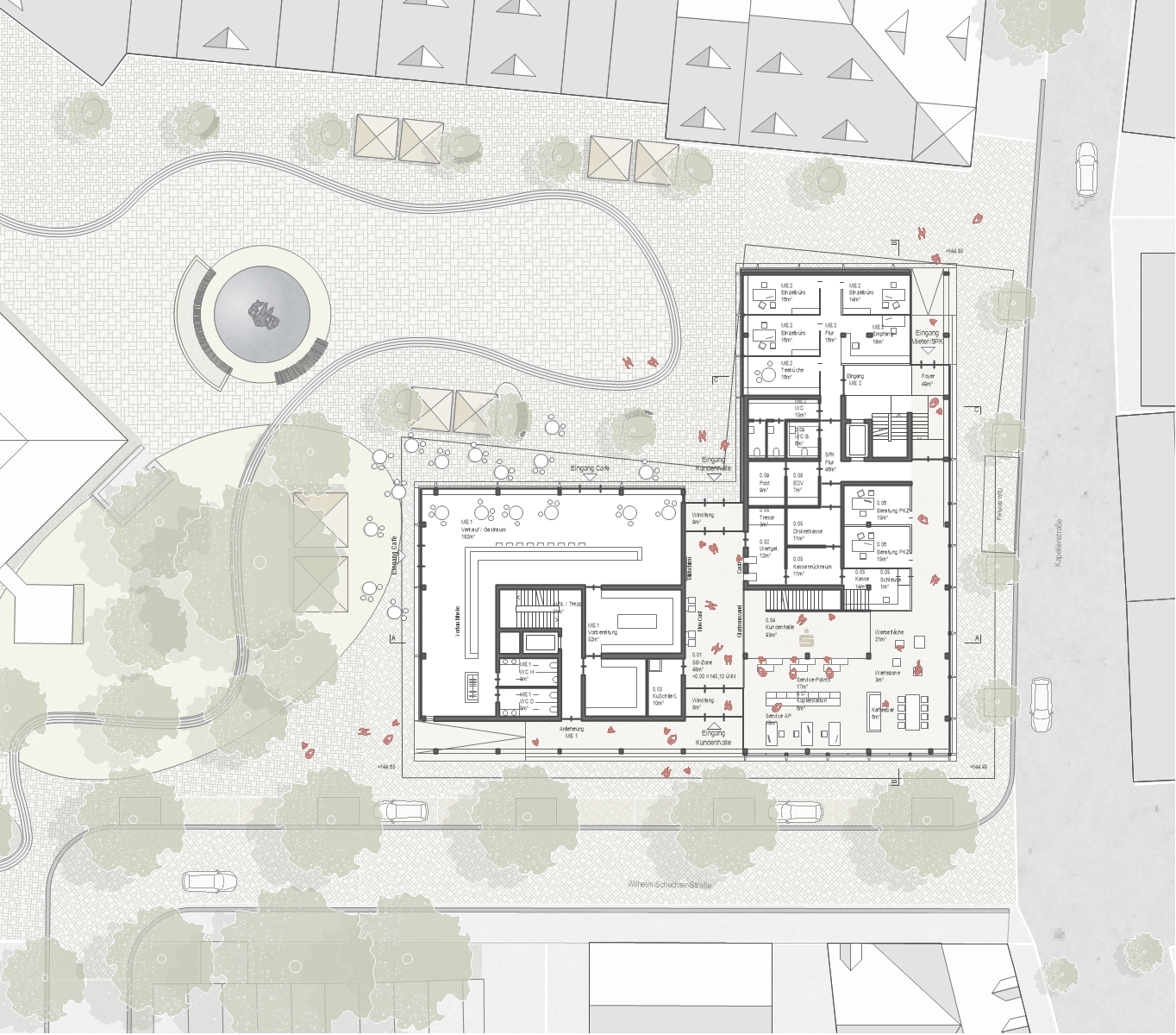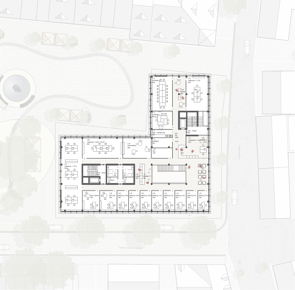 Betritt man die Kundenhalle über den SB-Bereich führt gegenüber der Servicepoints eine breite einläufige Treppe als einladende Geste direkt in das Kundenzentrum. Wir haben bewusst nur die geforderten zwei Beratungsräume im EG platziert, um soviel „öffentlichen Raum" wie möglich in der Kundenhalle zu schaffen. Die Halle kann sich so zusammen mit der Nachbarschaftsfläche über die Fassaden besser zum Stadtraum präsentieren. Das Erdgeschoss wird dadurch von Büroräumen freigehalten, die sich zum öffentlichen Raum eher abschotten, und die Arbeits- und Beratungsplätze wandern ins 1. Obergeschoss. Nur der Hauptzugang und die Kundenhalle der Sparkasse mit ihren öffentlichen Funktionen verbleiben im Erdgeschoss. Somit werden zum einen gut vermietbare Ladenflächen im Erdgeschoss für die Sparkasse generiert, zum anderen zusätzliche Geschäfts- und Gastronomieflächen für den öffentlichen Raum geschaffen. In der Fläche des Mietbereichs 2 könnte so später auch eine Ladenfläche entstehen. Die Erschließungskerne, die durch das zu erhaltene Untergeschoss vorgegebene waren, wurden übernommen. Dabei haben wir den schon angelegten Gebäudetypus eines Dreibundes mit der innenliegenden Erschließung klarer ausgearbeitet und die Rücksprünge im Baukörper gefüllt. Die bisher frei im Grundriss platzierten WC-Anlagen sind den zwei Erschließungskernen zugeordnet. So ließen sich bei Bedarf pro Geschoss bis zu 4 Einheiten verschiedenster Größe erschließen oder auch nur eine große zusammenhängende Fläche, die sich nach Belieben einteilen lässt mit den entsprechenden Fluchtweglängen. Die Struktur ist äußerst flexibel. Von Zellenbüros über Kombibüros bis zur offenen Arbeitslandschaft kann alles angelegt werden. Das Bürorastermaß von 1,50 m unterstützt diese Flexibilität und ist ideal für einen Beraterarbeitsplatz, der aus zwei Achsen besteht und damit im Lichten 2,90m misst. Das Gebäude soll in Holzhybridbauweise konstruiert werden, Stützen und Deckenelemente vorfabriziert. Dabei bestehen die wesentlichen tragenden Teile aus Holz, die entsprechend der baurechtlichen Vorschriften hochfeuerhemmend ausgebildet werden. Die Spannweiten der Decken liegen bei für Holz wirtschaftlichen 7 m. Aufgrund der Schwingungen, des Schallschutzes und zur thermischen Nutzung der Gebäudemasse sind vorfabrizierte Holz-Beton-Verbunddecken vorgesehen, wobei auch eine reine Holzkonstruktion mit einem Druckbereich aus einer Brettsperrholzdecke angedacht werden könnte. Die Erschließungskerne werden zur Aussteifung aus Stahlbeton erstellt. Die bei deren Überbauung nachzuweisende Retentionsfläche, liegt in einem Hohlraum unter der überbauten Fläche, wohin das Wasser bei einem Hochwasserereignis (HQ 100) gezielt abgeleitet werden kann. Die Fassade soll die nachhaltige Holzkonstruktion außen sichtbar machen und damit auch das nachhaltige Wirtschaften der Sparkasse als Selbstverständnis transportieren. Die Farbe rot gilt dabei als wichtiges Markenzeichen der Sparkasse neben dem Schriftzug und dem Logo. Deshalb wählen wir neben Holz-Alu-Fensterelementen eine rot lasierte Holzschalung als Außenfassade. Dabei ist von entscheidender Bedeutung, dass ein konstruktiver Holzschutz vorhanden ist. Um die Fassade dauerhaft vor den Witterungseinflüssen zu schützen, sehen wir tiefe Aluzargen vor, die zudem den außenliegenden auch in Rot gehaltenen textilen Sonnenschutz aufnehmen und im Brandfall als Brandriegel dienen. Die rote Holzschalung ist nur im Sturzbereich vorgesehen, dass kein Spritzwasser auf das Holz einwirken kann und sich unschöne Verfärbungen bilden könnten. Somit ist trotz der Verwendung von Holz in der Außenfassade eine dauerhafte Ansehnlichkeit gewährleistet. Für die Wärme– und Kälteerzeugung und zur Stromversorgung könnte ein BHKW zum Einsatz kommen unterstützt durch Photovoltaikmodule auf dem Dach. Die Warmwasseraufbereitung in den WC-Einheiten erfolgt dezentral mit Durchlauferhitzer. Eine mechanische Lüftung mit Wärmerückgewinnung und Heiz- Kühldecken sorgen in allen Jahreszeiten für ein angenehmes Raumklima. Zur Installationsführung von Elektroleitungen wird das Deckensystem oben mit ein Hohlraumboden ergänzt. Die Lüftungsleitungen, Heiz- und Kühlleitungen werden in der Konstruktionsebene geführt, die Heiz-und Kühldeckenelemente mit Akustikwirkung dazwischen gehängt.