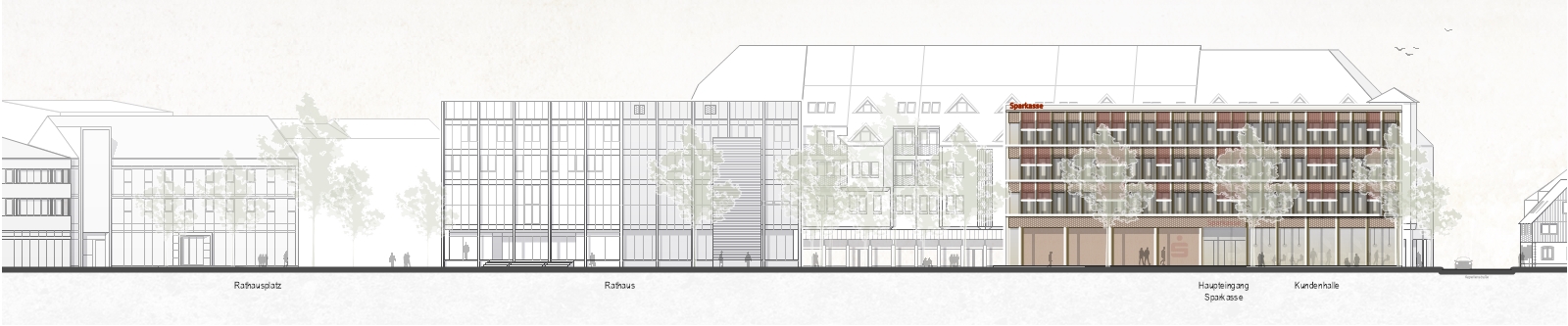 Das Rathaus dominiert den gesamten Platzraum bestehend aus Rathausplatz und Marktplatz und müsste eigentlich wegen seiner zentralen Lage ein offenes von allen Seiten zugängiges Erdgeschoss haben. Unglücklicher Weise richtet sich aber der Hauptzugang des quadratischen Baukörpers nach Norden zur Hauptstraße und hinterlässt für den öffentlichen Raum drei vor allem geschlossene und damit unattraktive Seiten. Das Gebäude der Sparkasse bildet den südwestlichen Abschluss des Rathaus- bzw. Marktplatzes. Mit seiner winkelförmigen Ausbildung wird an dieser Stelle ein Platz im Platz geschaffen. Da in der inneren Ecke des Winkels kein Zu- oder Durchgang liegt, entsteht eine Art gefangener städtischer Raum hinter dem Rathaus. Hier endet eine wichtige stadträumliche Fußwegeverbindung wie in einer Sackgasse. Sie führt vom Parkplatz der „Achern Passage" über die Ratskellerstraße direkt zum Marktplatz, der bisher eher der „hinteren Rathausplatz" ist. Um diese missliche städtebauliche Situation zu lösen, müsste sich zum einen, wie schon beschrieben, das Erdgeschoss des Rathauses nach allen Seiten offener präsentieren, und zum anderen der gefangene Platzraum aufgelöst werden. Nach dieser städtebaulichen Analyse richtet sich unser Entwurf aus. Dabei spielt die Platzierung der Kundenhalle der Sparkasse und des Cafés mit ihren Zugängen die entscheidende Rolle. In dem wir den SB-Bereich der Sparkasse als Durchgang entwerfen und damit einen Zugang in die innere Ecke des Platzraumes verlegen, schaffen wir eine wichtige Verbindung im städtischen Wegenetz. Der SB-Bereich wir zum öffentlichen Raum und führt die Fußgänger direkt zur Kundenhalle. Stadträumlich wird der gefangenen Platzraum mit diesem Durchgang „befreit". Betrachtet man den Durchgang von der Wilhelm-Schechter-Straße wird er zusammen mit der eingeführten Arkade zum Haupteingang des Kundenzentrum. Durch die Verlegung des Hauteingangs vom Platz in den Straßenraum entfällt auch das Gefühl, der Zugang liege hinter dem Rathaus in zweiter Reihe. An dieser für den öffentlichen Stadtraum wichtigen Stelle, der Gebäudeecke gegenüber der westlichen Rückseite des Rathauses, haben wir das Café gelegt. Es belebt jetzt mit seiner Außenbestuhlung den bisher unattraktiven Ort. In der Kapellenstraße liegt mit einem großzügigen Foyer der Zugang zu den oberen Geschossen des Sparkassengebäudes. Auch hier akzentuiert eine Arkade den Eingang. Die Kundenhalle verbindet beiden Erschließungen und ist damit nach allen Seiten im Stadtraum bestens angebunden.