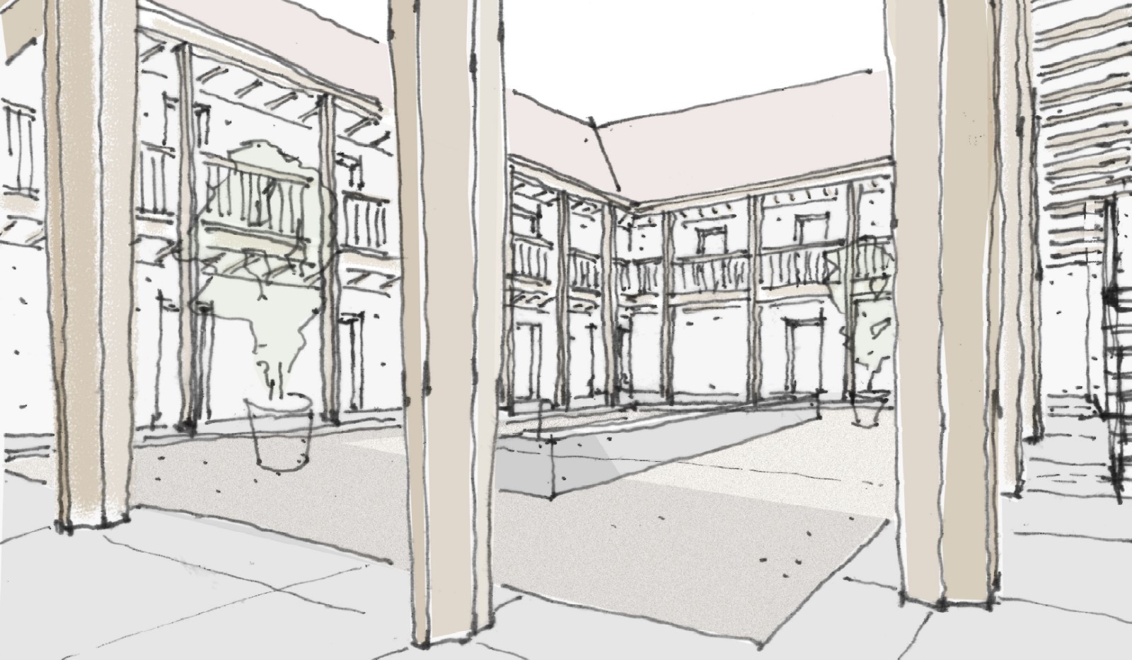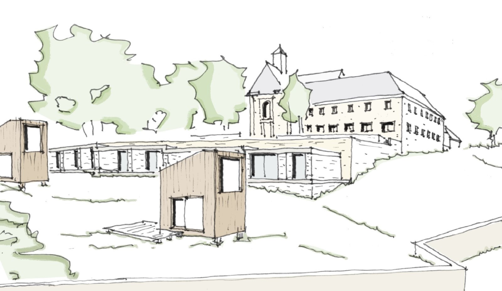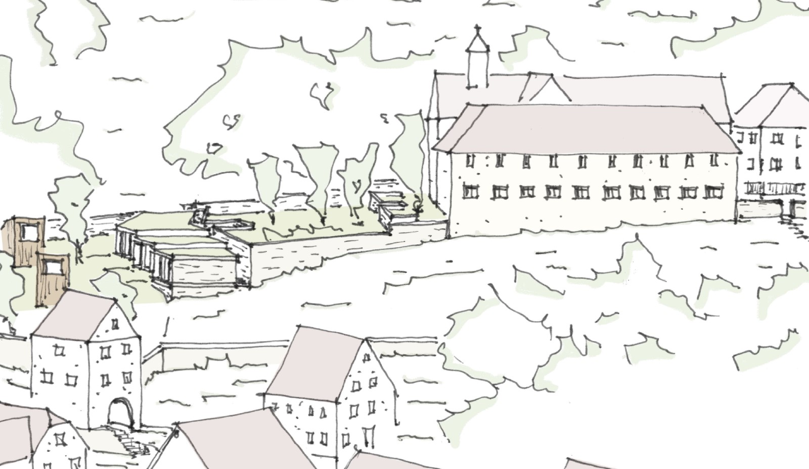 Bei der genauen Betrachtung der einzelnen Bauteile und der Außenanlagen haben wir etliche Raumpotentiale ausgemacht, die die innere Organisation erleichtern und auch die Möglichkeit zur Erweiterung bieten. So sehen wir im ehemaligen Wirtschaftshof Raum für ein eingeschossiges Empfangs- und Restaurantgebäude mit Dachterrasse und atemberaubenden Blick auf die Großcomburg. Im Klosterhof sehen wir anstelle des nicht mehr existenten Kreuzgangs eine Laubengangerschließung. Potential für Erweiterungen bietet der Klostergarten und die hohen beeindruckenden Trockenmauern. Dabei ist die Voraussetzung für einen Erweiterung, dass sie nicht in Konkurrenz mit dem Bestand tritt und keine neue Silhouette in Richtung Großcomburg entsteht. Im unteren Bereich des Gartens, einer Streuobstwiese, könnten kleine Holz-Folies eingestellt werden. Ein Holz-Folie ist eine Suite mitten im Garten mit Doppelbett und Couch und bietet Raum für bis zu drei Personen oder Eltern mit zwei kleinen Kindern. Ein weiterer Bettentrakt könnte direkt an die untere hohe Trockenmauer angebaut werden. Beide Übernachtungsmöglichkeiten würden über eine eigene kleine Terrasse verfügen.