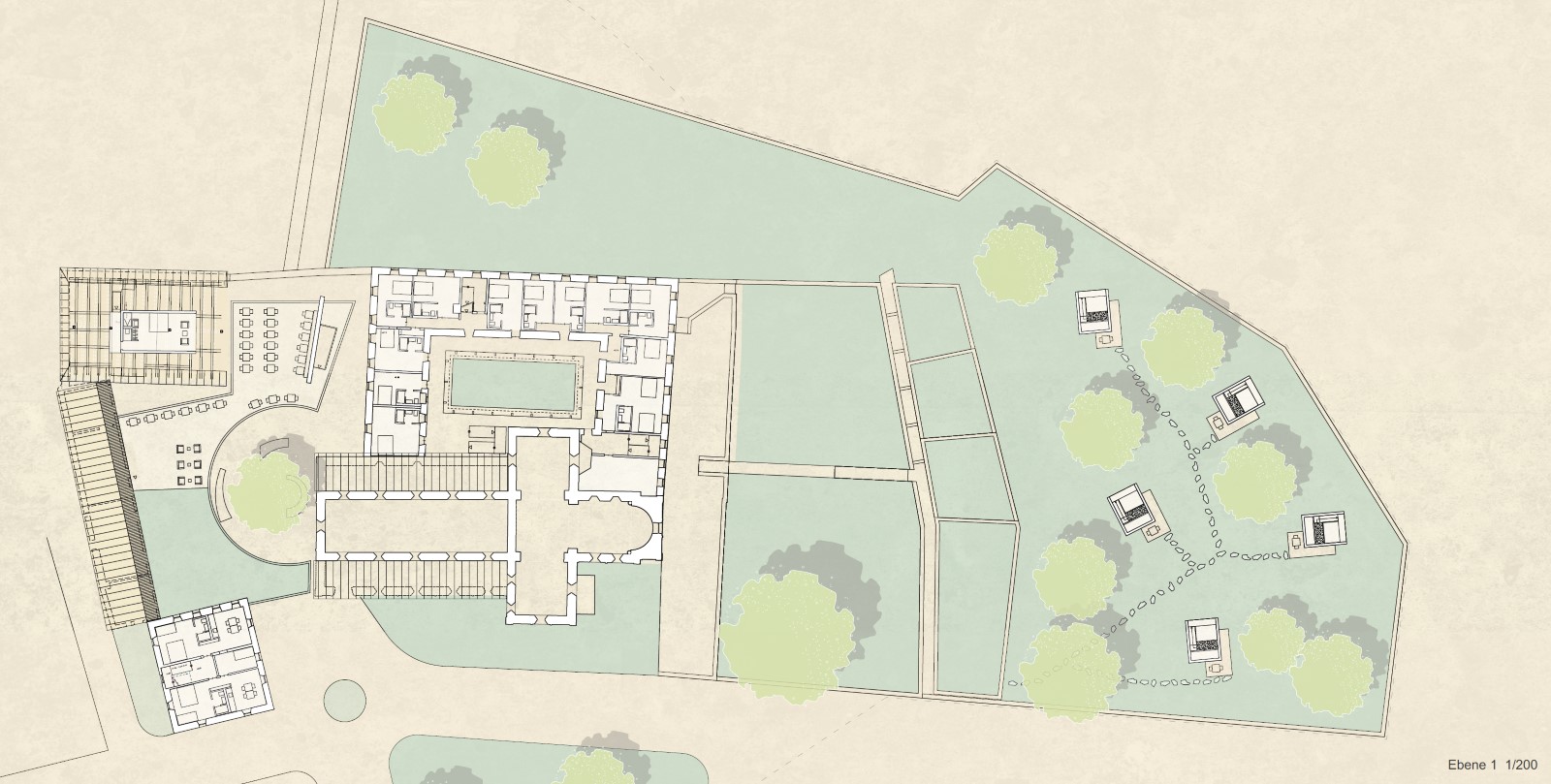 Bei der Nutzungsverteilung im Bestand haben wir der Grundstruktur der einzelnen Gebäude eine hohe Priorität eingeräumt, um unnötige oder für den Denkmalschutz gar schädliche Umbauten zu vermeiden. Im Konventgebäude können mit Hilfe eines eingestellten Laubengangs zur Erschließung gut verträglich 20 Doppelzimmer und 2 Appartements mit den notwendigen Nebenräumen eingebaut werden, im Offiziantengebäude weitere 5 Appartements mit kleiner Küche. Im Schuppen werden die Nebenräume und die Küche untergebracht. Die Scheuer bleibt in Ihrer nicht gedämmten Struktur erhalten. Hier werden temperierte Boxen eingestellt, die auch im Winter genutzt werden können und sich im Sommer in den „Scheunenraum" erweitern lassen. Die Kirche bleibt geweiht und der Öffentlichkeit zugänglich und kann im Hotelkonzept als Hochzeitskirche genutzt werden.