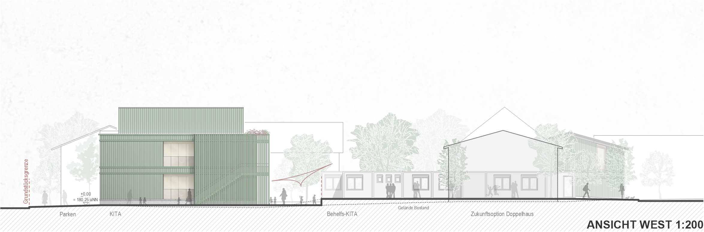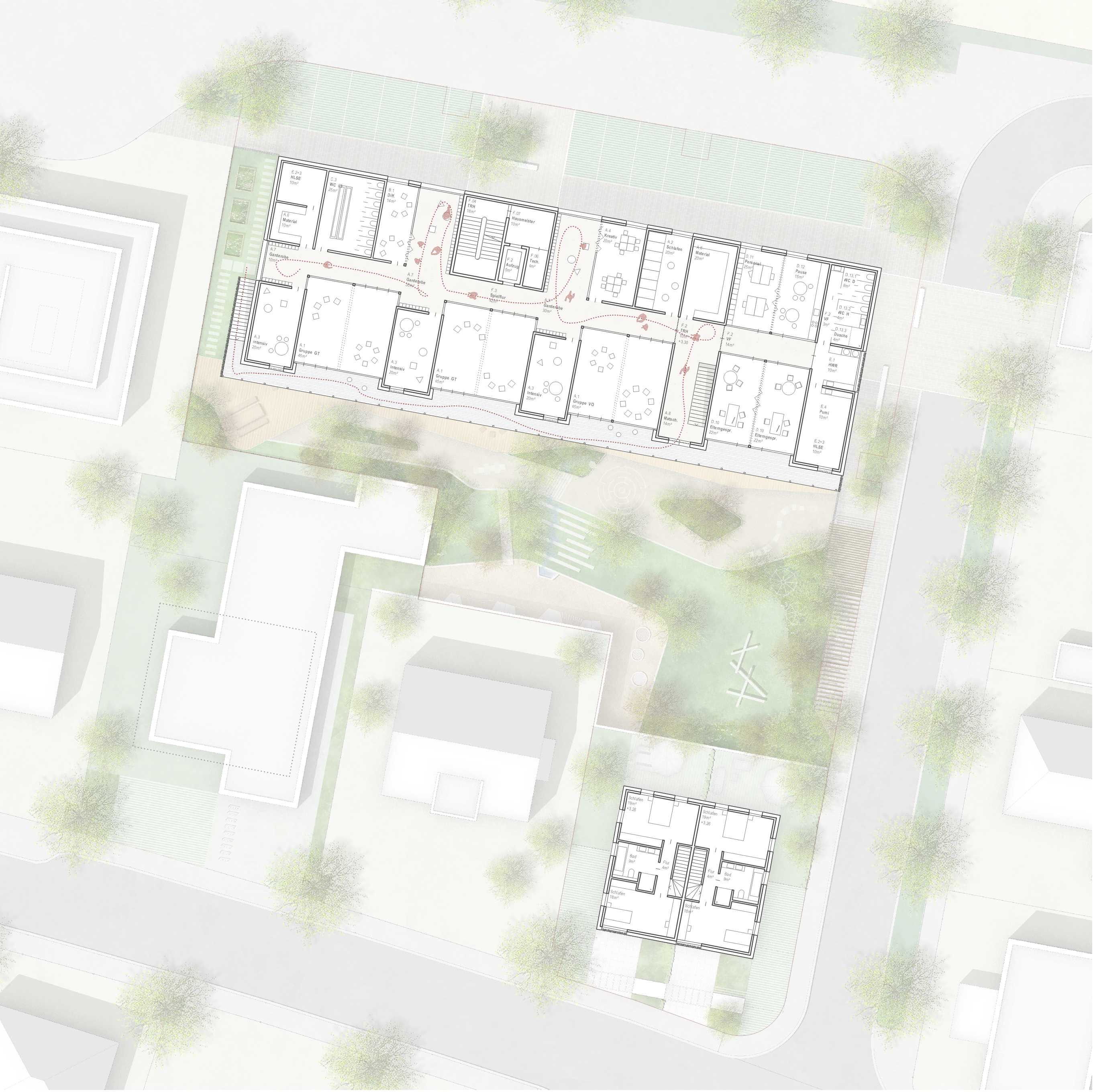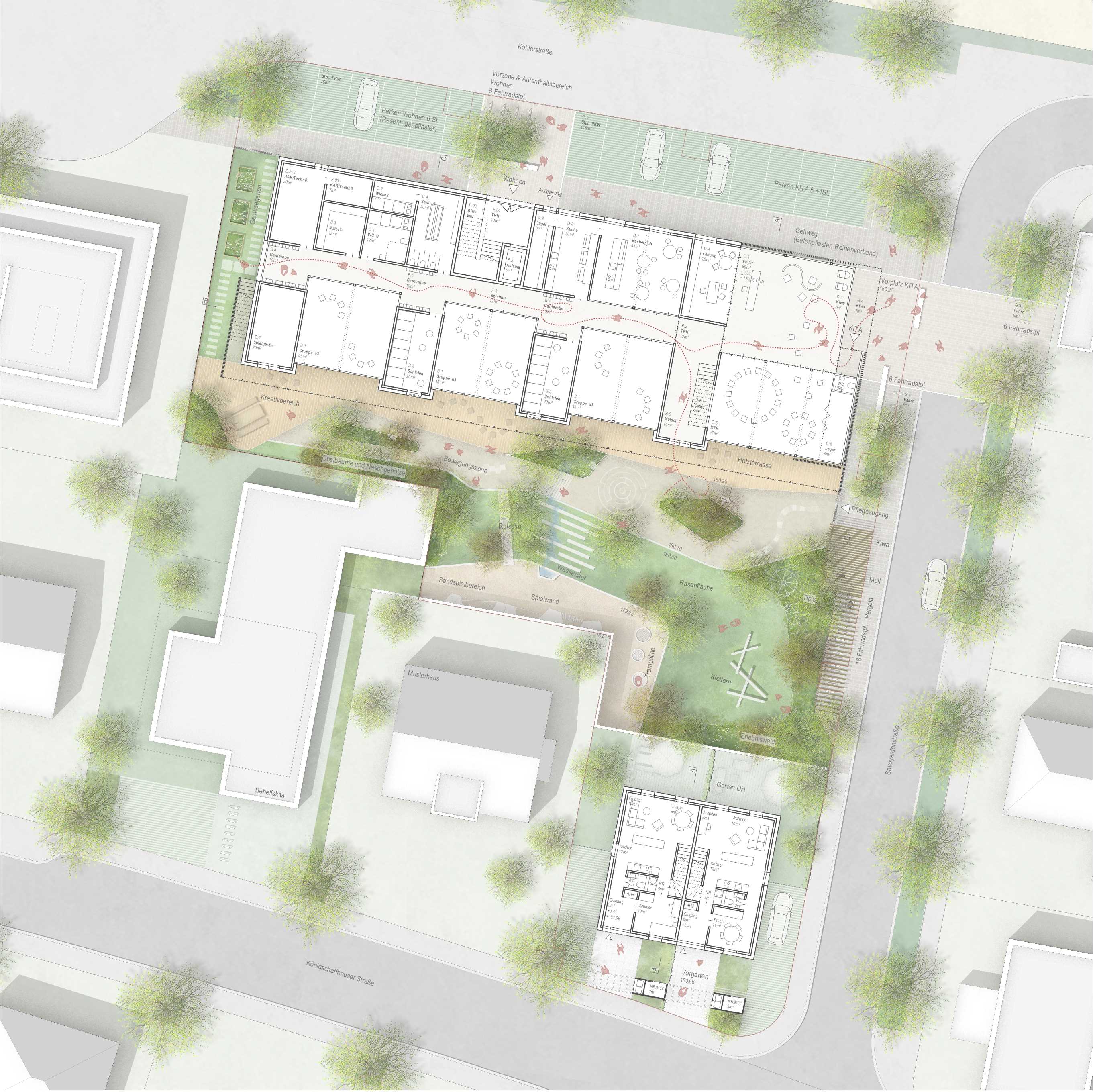 Der Übergang in den KinderGarten ist fließend. Entweder direkt von den Gruppenräumen über großzügige Öffnung oder punktuell über eine Schleuse gelangen die Kinder im Erdgeschoss in den Außenspielbereich. Vor den Gruppenräumen im Obergeschoss liegt ein durchgehender Laubengang, der über eine Außentreppe direkt ins Freie führt. Nebenbei dient er als erster Fluchtweg. Der Laubengang funktioniert aber durch die Ausbildung von kleinen Nischen auch als Spielbereich und kann den einzelnen Gruppenräumen zugeschlagen werden. Der KinderGarten soll Raum für Naturerlebnisse und kreative Auszeit im Freien bieten. Hierfür werden großzügige zusammenhängende Spielbereiche für alle Altersgruppen geschaffen, die durch verschiedene Ebenen, welche die bestehenden Geländehöhen aufnehmen, entstehen. Eingefriedet wird der Spielbereich von einem Zaun, der sich entlang der Ostfassade nach Norden zieht. Hier entsteht der Vorplatz des Kindergarteneingangs, der als offener, vielfältig nutzbarer Platzraum gestaltet wird. Dieser zieht sich bis über die andere Straßenseite und hat zugleich eine Signalwirkung für die Autofahrer. Folgt man dem Zaun nach Süden, so geht dieser über in ein Müllhaus, eine Abstellfläche für Kinderwägen sowie Fahrradständer, welche unter einer Pergola untergebracht sind.