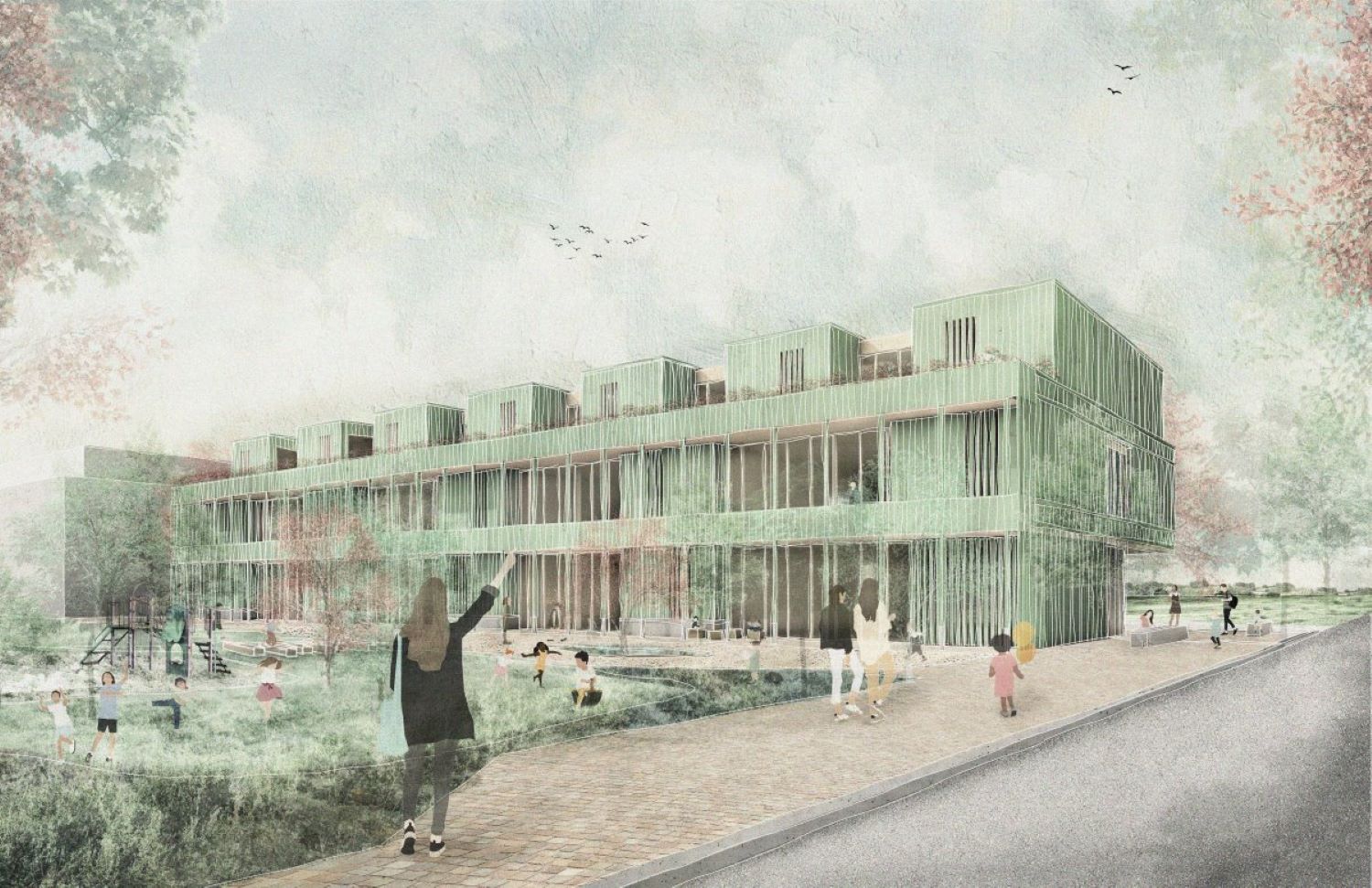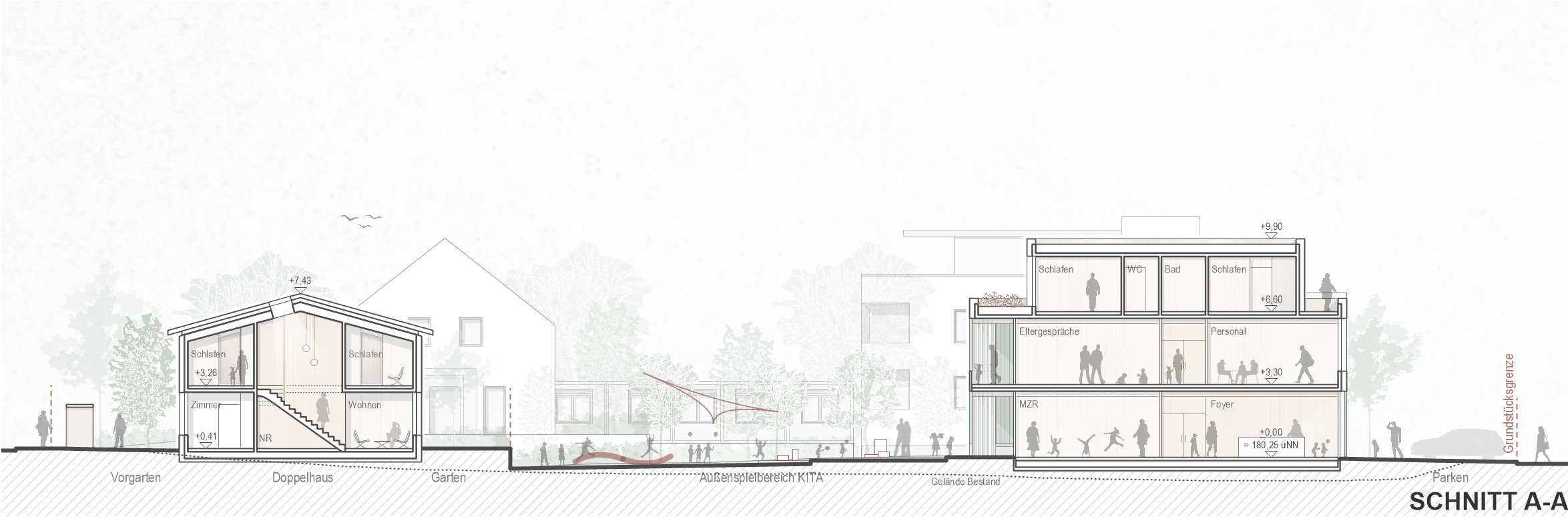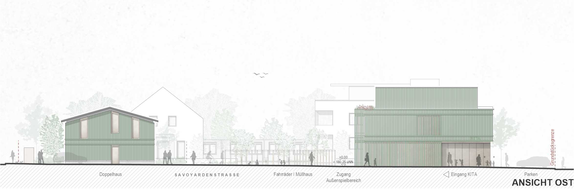 Der Übergang in den KinderGarten ist fließend. Entweder direkt von den Gruppenräumen über großzügige Öffnung oder punktuell über eine Schleuse gelangen die Kinder im Erdgeschoss in den Außenspielbereich. Vor den Gruppenräumen im Obergeschoss liegt ein durchgehender Laubengang, der über eine Außentreppe direkt ins Freie führt. Nebenbei dient er als erster Fluchtweg. Der Laubengang funktioniert aber durch die Ausbildung von kleinen Nischen auch als Spielbereich und kann den einzelnen Gruppenräumen zugeschlagen werden. Der KinderGarten soll Raum für Naturerlebnisse und kreative Auszeit im Freien bieten. Hierfür werden großzügige zusammenhängende Spielbereiche für alle Altersgruppen geschaffen, die durch verschiedene Ebenen, welche die bestehenden Geländehöhen aufnehmen, entstehen. Eingefriedet wird der Spielbereich von einem Zaun, der sich entlang der Ostfassade nach Norden zieht. Hier entsteht der Vorplatz des Kindergarteneingangs, der als offener, vielfältig nutzbarer Platzraum gestaltet wird. Dieser zieht sich bis über die andere Straßenseite und hat zugleich eine Signalwirkung für die Autofahrer. Folgt man dem Zaun nach Süden, so geht dieser über in ein Müllhaus, eine Abstellfläche für Kinderwägen sowie Fahrradständer, welche unter einer Pergola untergebracht sind.