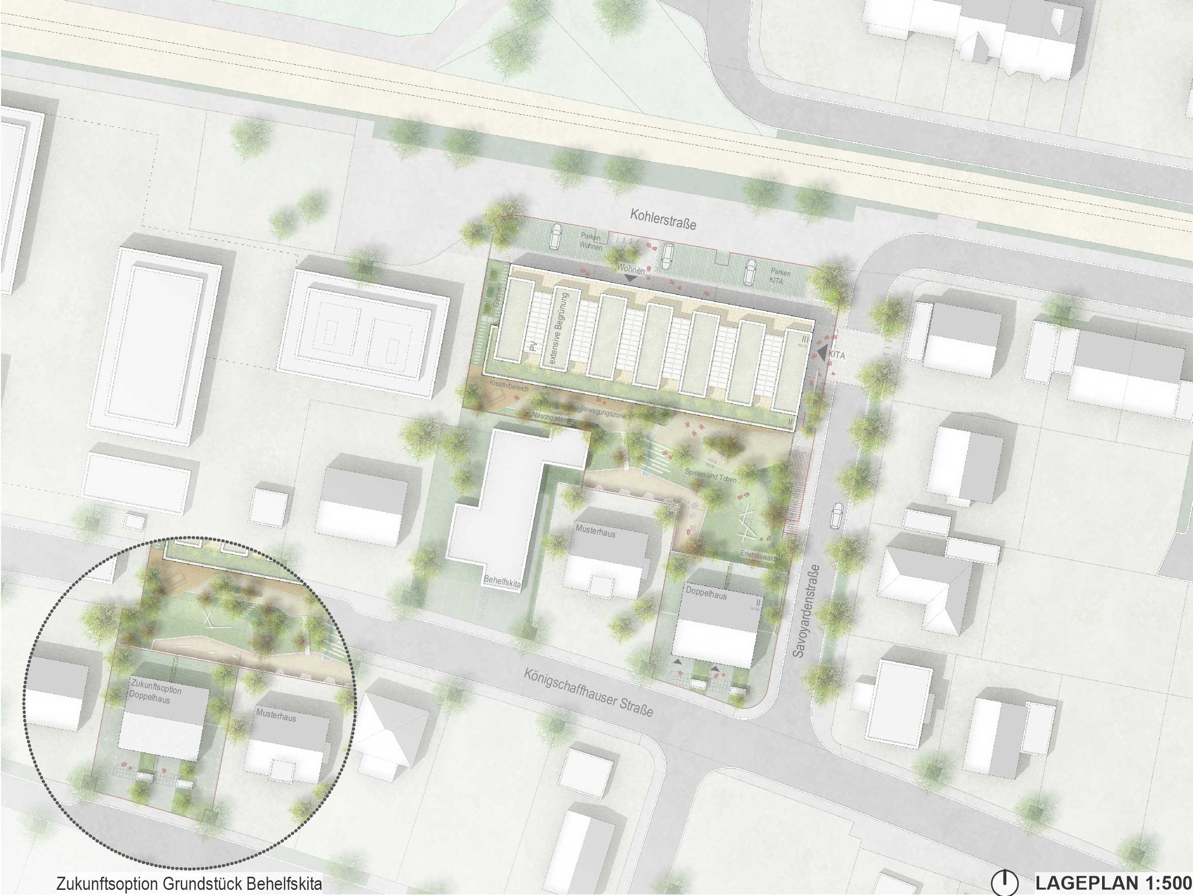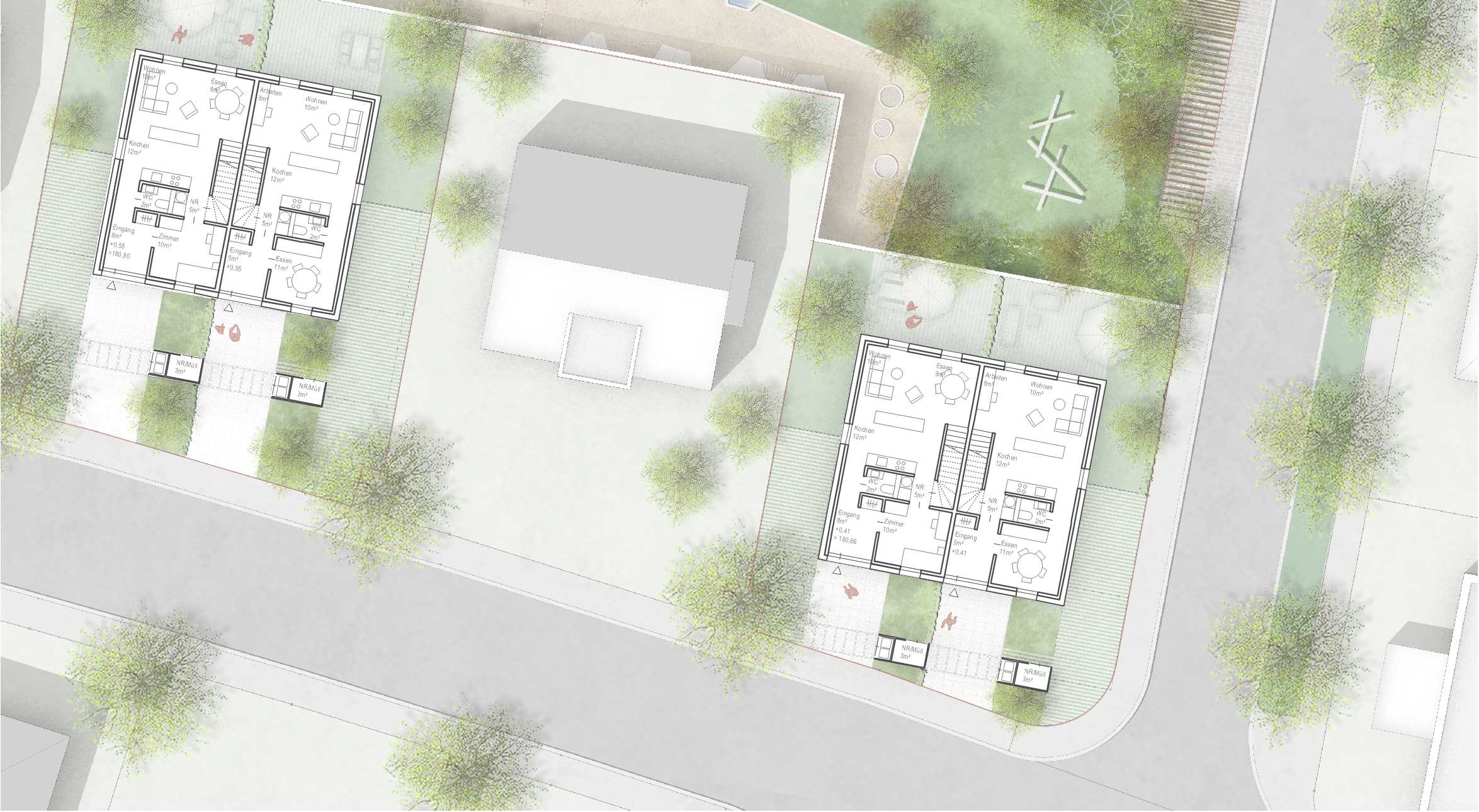 In dieser sehr schwierigen städtebaulichen Umgebung schaffen wir mit unseren drei neuen Gebäuden eine klare Struktur, die die Lücken füllt und an dieser Stelle des Gebiets ordnend eingreift. Die Grundüberlegung dabei ist einfach. Mit den zwei Doppelhäusern links und rechts des Musterhauses, nutzen wir die kleinen Restgrundstücke bestens aus und schaffen eine Abfolge von gleichen Haustypen mit Satteldach, die in ihrer Einheit den Straßenraum beruhigen, nachdem das Provisorium der Behelfskita nach wenigen Jahren wieder verschwindet. Im Rücken dieser Häuser entsteht ein langes gut zu nutzendes Grundstück für das KinderGartenWohnHaus.