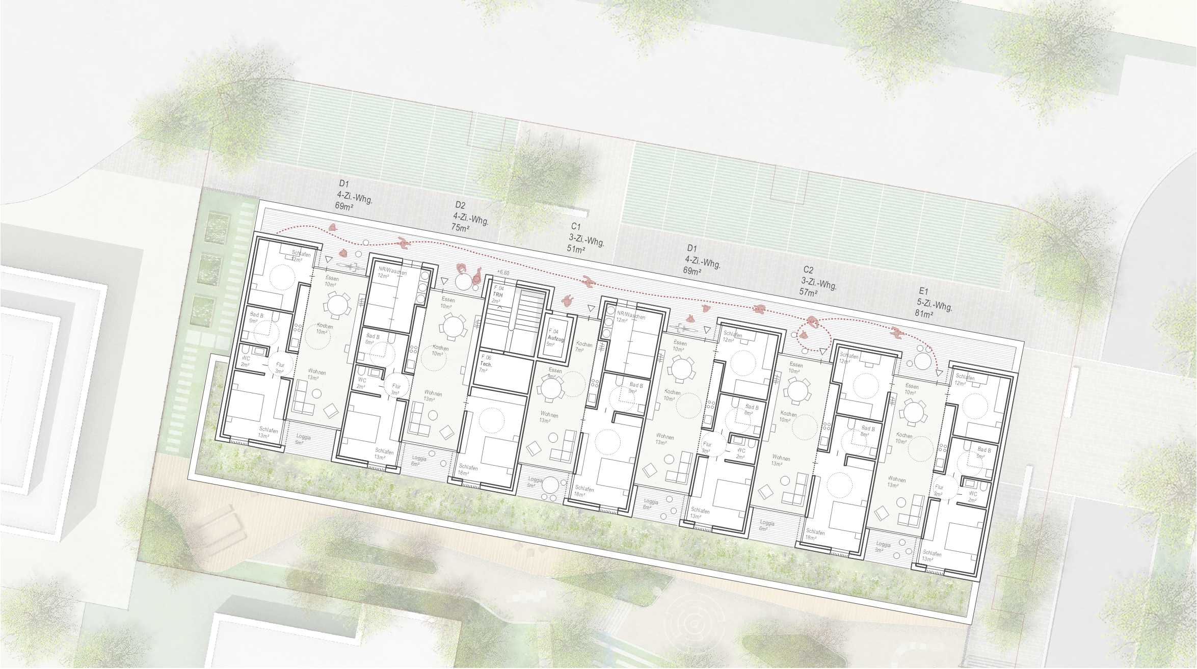 Das WohnHaus liegt im 2. Obergeschoss und wird mit einem Laubengang erschlossen, der sich vor den Wohnungseingängen weitet und dort einen kleinen halböffentlichen Vorbereich schafft. Ein Treppenhaus dient der alleinigen vertikalen Erschließung der Wohnungen. Der Aufzug wird, durch eine Schlüsselschaltung organisiert, auch von der Kita genutzt. Die Wohnungsgrundrisse bestehen aus Zimmer-Bad-Modulen und Wohnraum-Modulen, die im Wechsel aufeinander folgen. So entsteht ein struktureller Wohnungsbaugrundriss, der alle Wohnungsgrößen zulässt und seriell günstig erstellt werden kann. Den Wohnraum-Modulen angefügt sind Loggien, die Privatheit im Außenraum bieten. Den Loggien vorgelagert ist ein langes Hochbeet, das auf dem Dach des Kindergartenlaubengangs bepflanzt werden kann. Die Abstellräume sind bewusst auf der gleichen Ebene der Wohnung platziert und vom Laubengang erschlossen. Dadurch entfällt eine aufwendige Unterkellerung.
