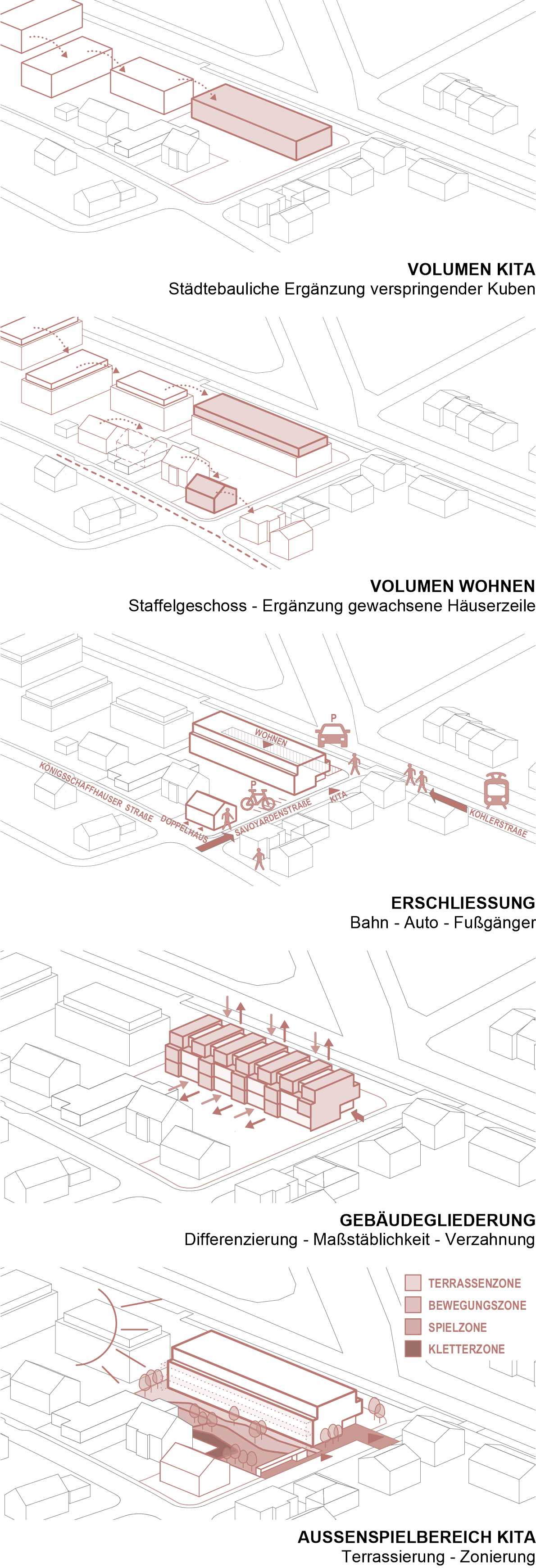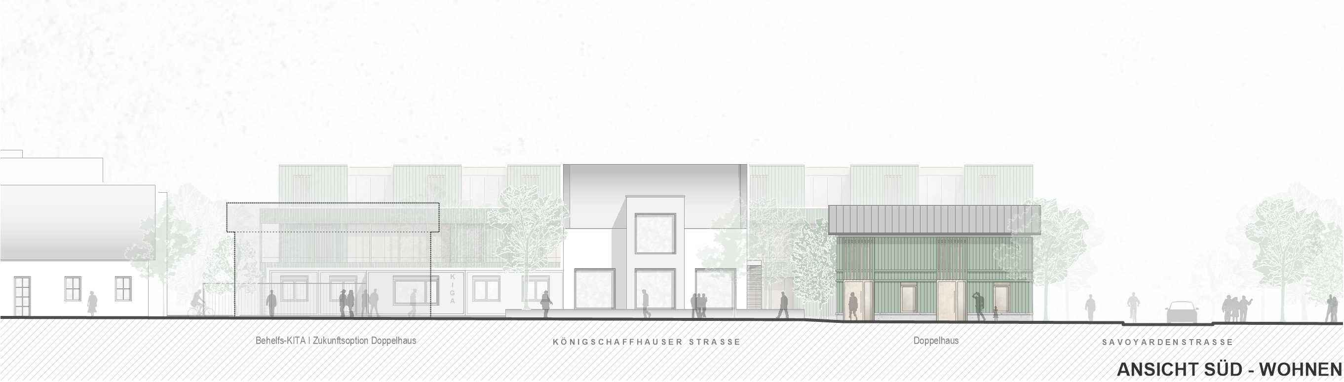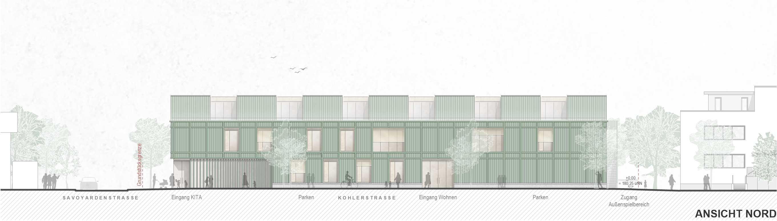 Unsere städtebauliche Lösung ist dann auch ein langes Haus, das sich an die straßenseitige Grundstücksgrenze schmiegt und damit viel Platz für den Außenspielbereich lässt. Der Eingang des Kindergartens orientiert sich zur Savoyardenstraße. Die Wohnungen werden über die Kohlerstraße erschlossen. Durch die Stellung des Baukörpers längs zur Kohlerstraße und zur S-Bahn-Trasse wirkt er zum einen als Lärmschutz für den Außenspielbereich, zum anderen schiebt er sich vor die Stellplätze, die sich dann wie selbstverständlich entlang der Kohlerstraße aufreihen. Dadurch kann auf eine teure Tiefgarage verzichtet werden.