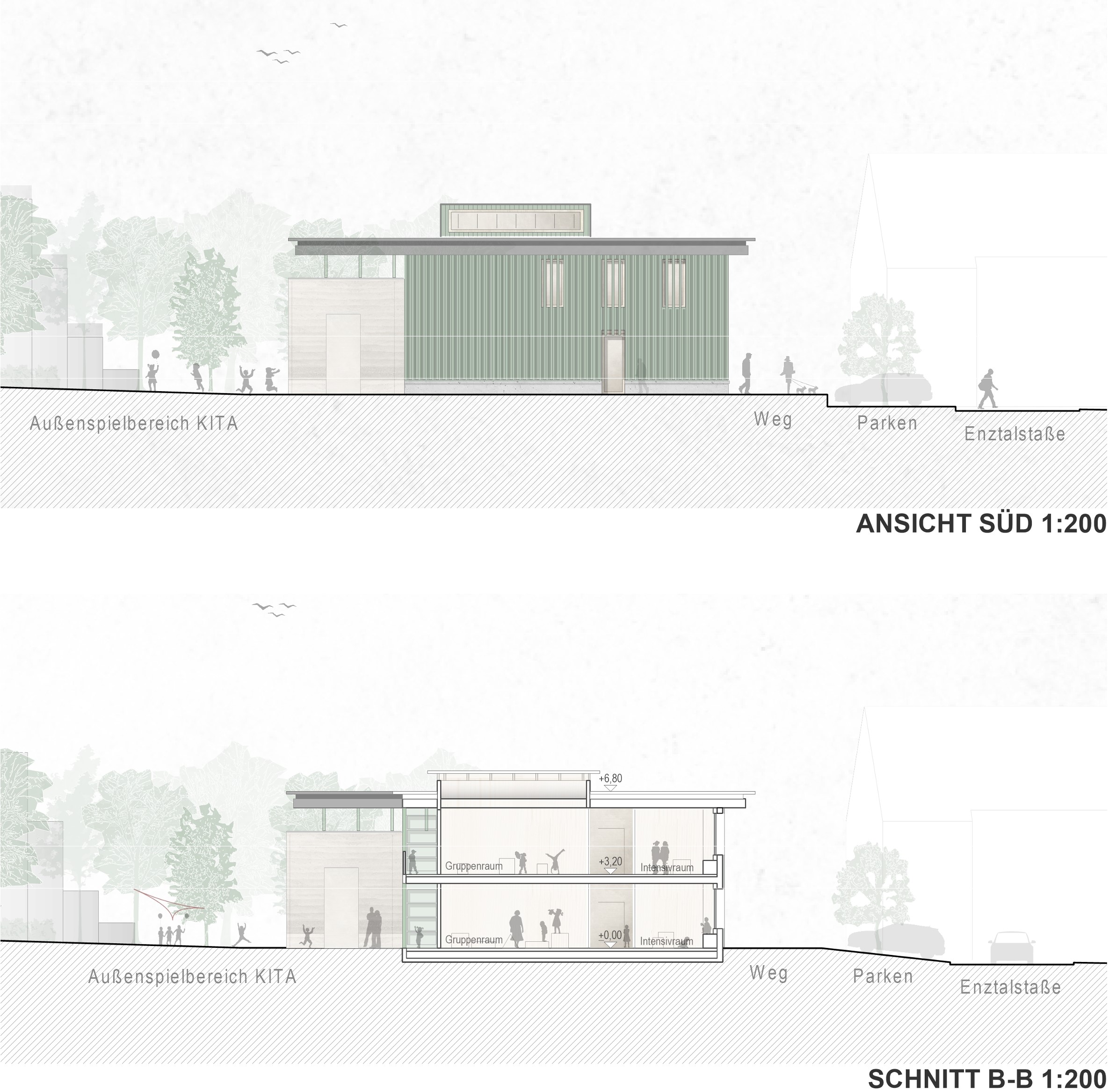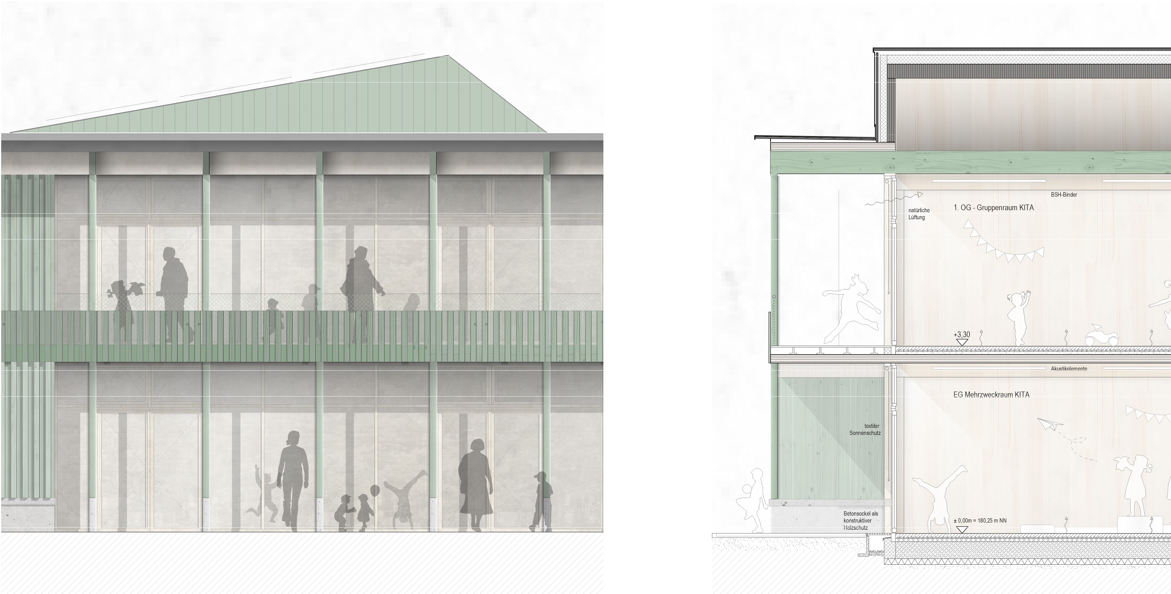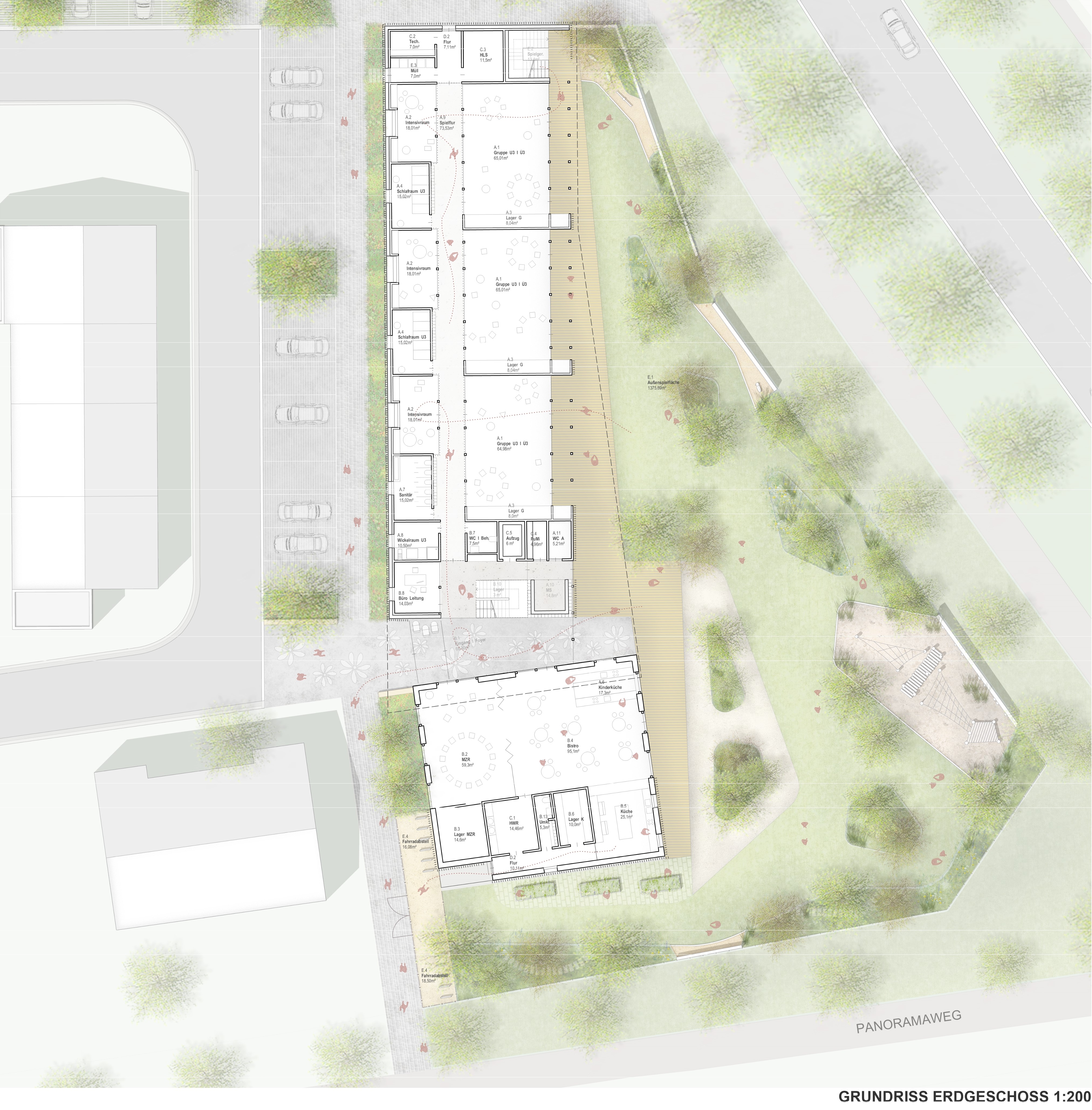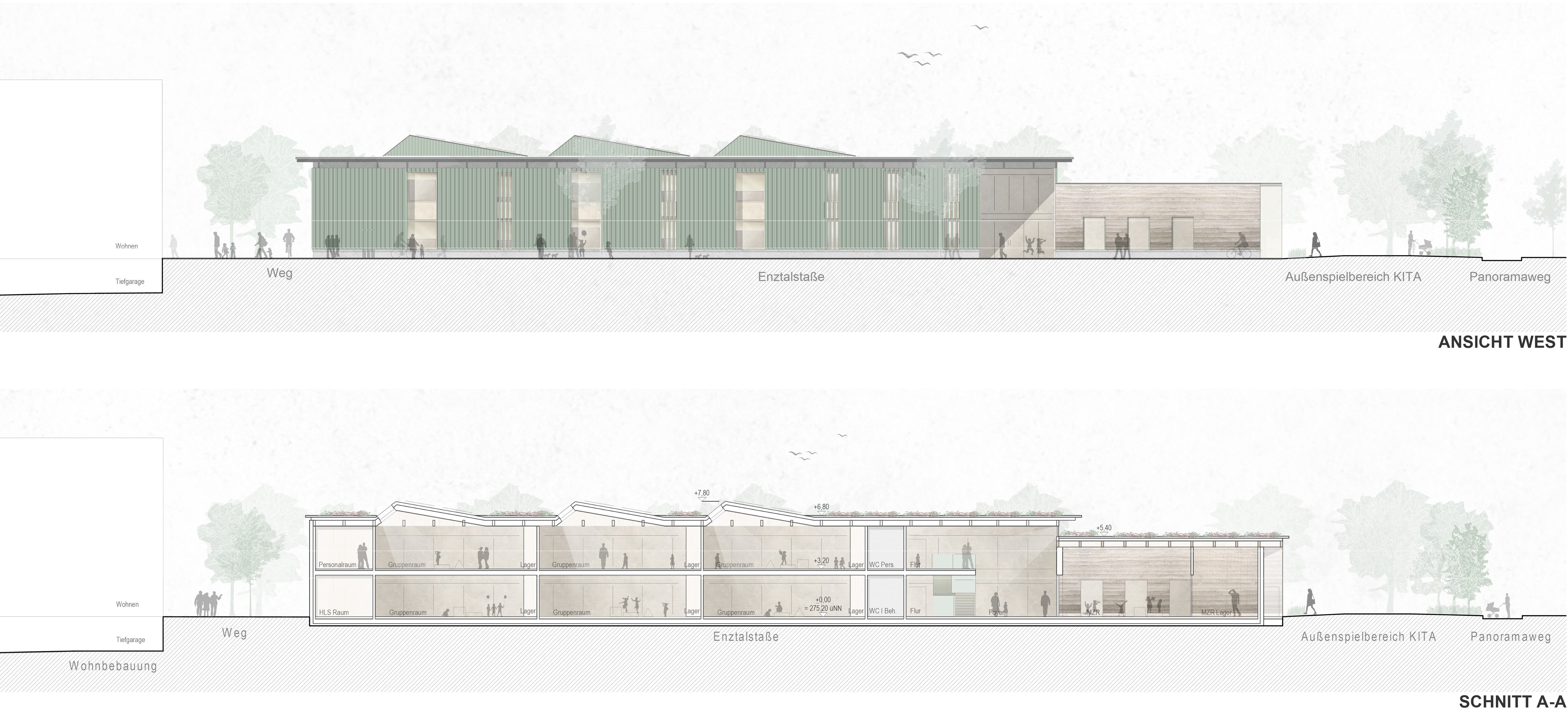 Ortszentrum – Rück II" von Waldbronn und schließt es Richtung Stuttgarter Straße ab. Im Kern des Baugebiets liegen 2-geschossige Doppel- und Reihenhäuser, die der Bestandstruktur des anschließenden Ortsteils Reichbach entsprechen. Den nördlichen Abschluss bildet ein Band aus 3-geschossigen Mehrfamilienhäusern. An diese dichtere Baustruktur, deren Abschluss im Ideenteil bearbeitet werden soll, grenzt das Grundstück mit seiner Schmalseite. Zwischen Kern- und Randbereich liegt eine aufgeweitete Erschließungsstraße mit Bäumen und straßenbegleitenden Parkmöglichkeiten.Grundsätzlich behalten wir die bisher angelegte Trennung der beiden Baustrukturen durch die aufgeweitete Erschließungsstraße bei. Sie endet auf einem kleinen Plätzchen, das auf den Fuß-und Radweg überleitet, der entlang der Stuttgarter Straße verläuft. Den Abschluss der verdichteten Struktur bilden im Ideenteil drei Baukörper. Sie stehen in Nord-Südrichtung und formulieren mit ihren Schmalseiten den Übergang zur kleinteiligeren Doppel- und Reihenhausstruktur. Zwischen den Baukörpern entstehen sehr private Wohnhöfe. Mit der markanten Ausformung reagieren sie zum einen auf Ausblicke und Durchblicke und setzen zum anderen einen zeichenhaften Abschluss für das Baugebiet. Der Kindergarten sitzt ganz selbstverständlich am Kopf der Baustruktur. Der Längsbau ragt über die Bauflucht der Albgaustraße und markiert das Ende der Straße. Der Anbau nimmt die Richtung der Bebauung entlang der Enztalstraße auf. Am Fügepunkt beider Baukörper befindet sich der Haupteingang. Wir haben den Haupteingang ganz bewusst in diese Ecke gelegt, um an das übergeordnete Rad- und Fußwegenetz anzuknüpfen. Außerdem liegt der Eingang geschützt vor dem Autoverkehr. Zu Fuß oder mit dem Fahrrad gelangen die Kinder über den „Panoramaweg", der die Ortsteile wie ein Rückgrat miteinander verbindet, direkt zum Eingang, ohne eine Autostraße zu queren. Gestärkt wird die Achse durch die geplante Fahrrad- und Fußgängerbrücke. Über einen Vorplatz mit angrenzenden Fahrradstellplätzen betreten die Kinder das Gebäude. Im Gebäude erwartet die Kinder ihre eigene kleine Stadt. Vom zentralen Platz, dem Foyer, führt ein Weg, einer Gasse ähnlich, durch die Kinderstadt. Mal schmaler werdend, mal breiter werdend verbindet die Gasse die Gruppen mit Ihren Vorplätzen. Die Schlafbereiche liegen dabei wie kleine introvertierte Häuschen auf dem Weg. Durch die gute Proportion der Gruppenmodule ergibt sich ein sehr gut nutzbarer Innenraum, damit sich die Kinder geborgen fühlen und Raum zum Spielen haben. Gleichzeitig gibt die klare modulare Aufteilung der Gruppen dem Grundriss Struktur und verleiht dem Innenraum die nötige Ruhe und Übersichtlichkeit. Auf der anderen Seite gelangt man in das Bistro und die Kinderküche. Über die Treppe gelangen die Kinder ins Obergeschoss, in welchem die Erschließung mit Ihren Aufweitungen in gleicher Weise wie das Erdgeschoss zur Belebung dieser kleinen Kinderstadt beiträgt. Der Übergang in den Kindergarten ist fließend. Entweder direkt von den Gruppenräumen über großzügige Öffnungen oder punktuell über die dem Foyer zugeordnete Schleuse gelangen die Kinder im Erdgeschoss in den Außenspielbereich. Vor den Gruppenräumen im Obergeschoss liegt ein durchgehender Laubengang, der über eine Außentreppe direkt ins Freie führt. Nebenbei dient er als erster Fluchtweg. Der Laubengang funktioniert aber auch als Spielbereich und kann den einzelnen Gruppenräumen zugeschlagen werden. Der Kindergarten soll Raum für Naturerlebnisse und kreative Auszeit im Freien bieten. Hierfür werden großzügige zusammenhängende Spielbereiche für alle Altersgruppen geschaffen, die durch verschiedene Ebenen, welche die bestehenden Geländehöhen aufnehmen, entstehen. Ein Haus ganz aus Holz soll es werden, bestehend aus tragenden, unverkleideten Brettsperrholzwänden und -decken und Linoleumböden. Durch die immer gleichen Raummodule von Gruppen- und Nebenräumen, ist eine Holz-Modulbauweise möglich. Die Außenwandverkleidung besteht aus einer einfachen Bretterschalung, die über die Fenster der Schlafräume auf Lücke gesetzt wird und vor direktem Einblick schützt. Der außenliegende Sonnenschutz und der Laubengang schützen vor Überhitzung im Sommer. Das Dach wird begrünt und mit Photovoltaikelementen bestückt und dient mit seiner weiten Auskragung dem Sonnenschutz und als Wetterschutz für die Holzfassaden. Die Bauweise der Kita zeichnet sich durch kreislaufgerechtes Bauen und die Verwendung nachhaltiger Materialien aus. So entsteht ein Längsbau in Holzbauweise, der durch den Einsatz von wiederverwerteten und in Zukunft wiederverwertbaren Holzbaustoffen dem Anspruch des zirkulären Bauens gerecht wird. Die Umfassungswände des Anbaus im Süden werden in Stampflehm-Bauweise errichtet. Die Verwendung dieses Materials vereint die architektonisch-ästhetischen Qualitäten mit den raumklimatischen und ökologischen Vorteilen. Der regional bezogene Baustoff ist langlebig und beliebig wiederverwendbar. Die monolithischen Wände speichern Wärme und sorgen für angenehme Raumtemperaturen. Durch ihre Diffusionsoffenheit und Sorptionsfähigkeit regulieren die Lehmbauwände selbstständig die Raumluft und schaffen ein gesundes Raumklima für die Kinder.