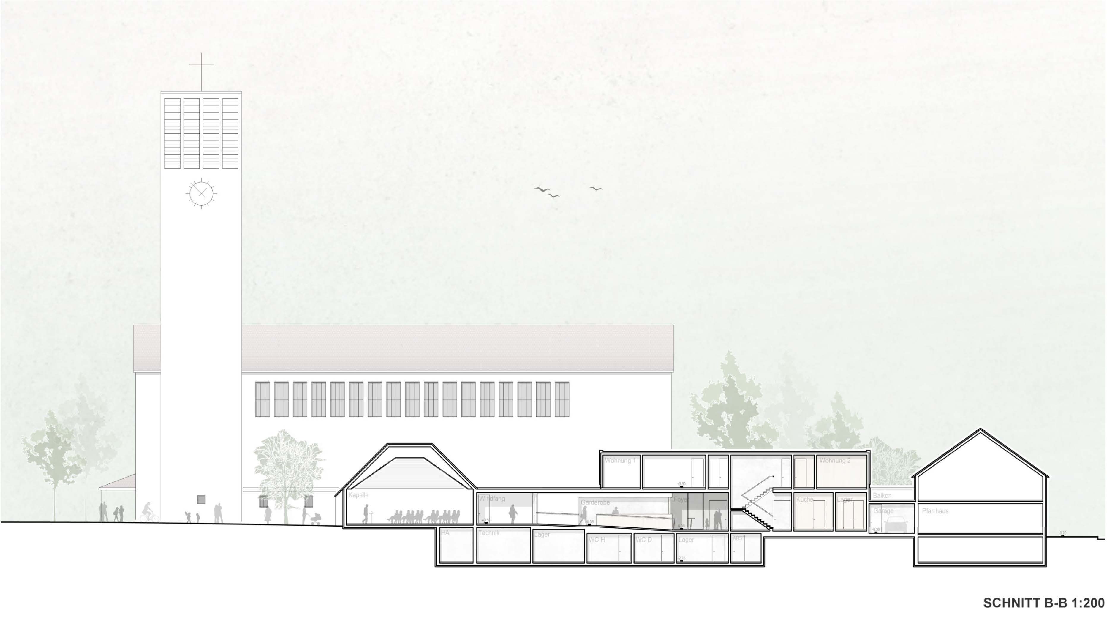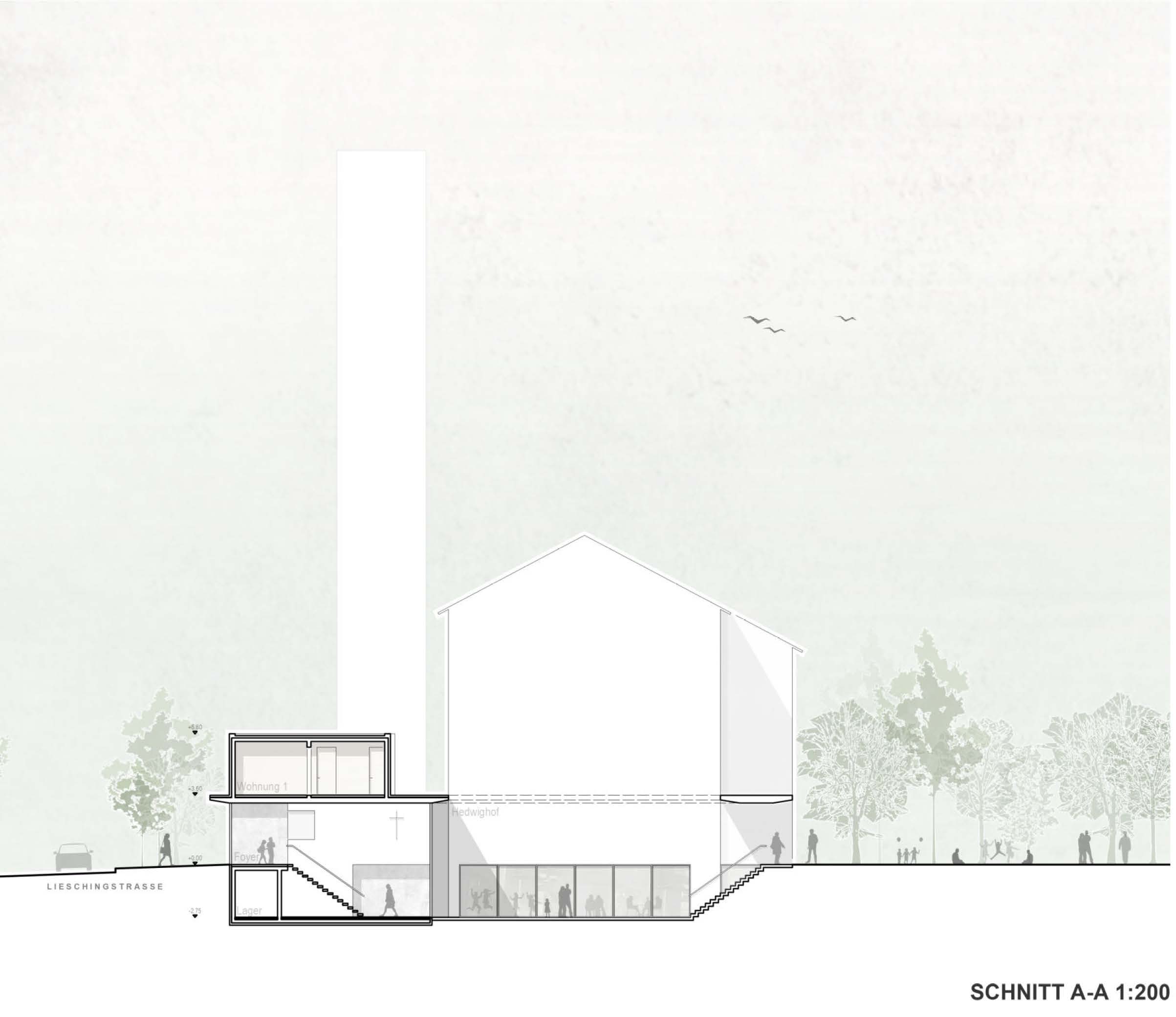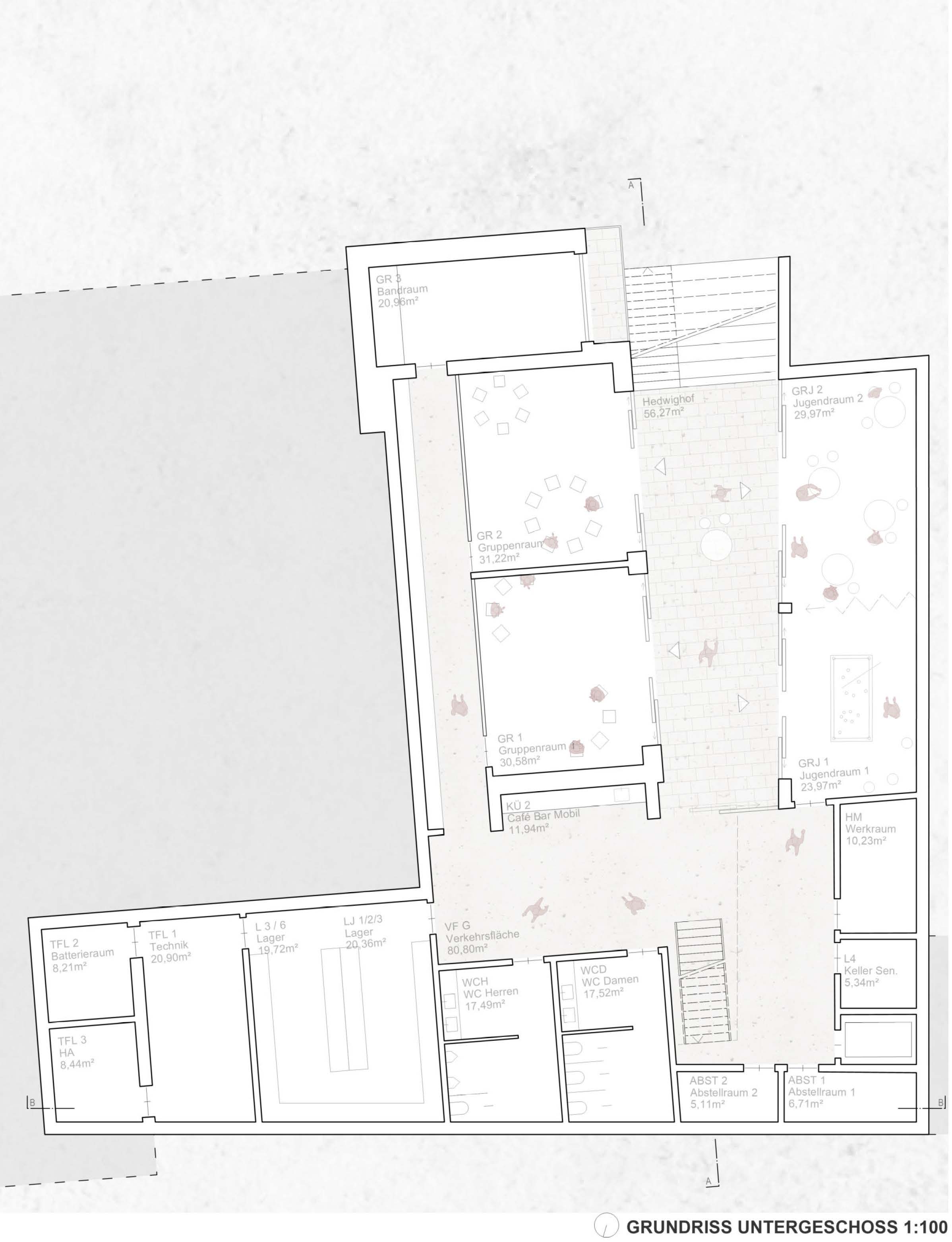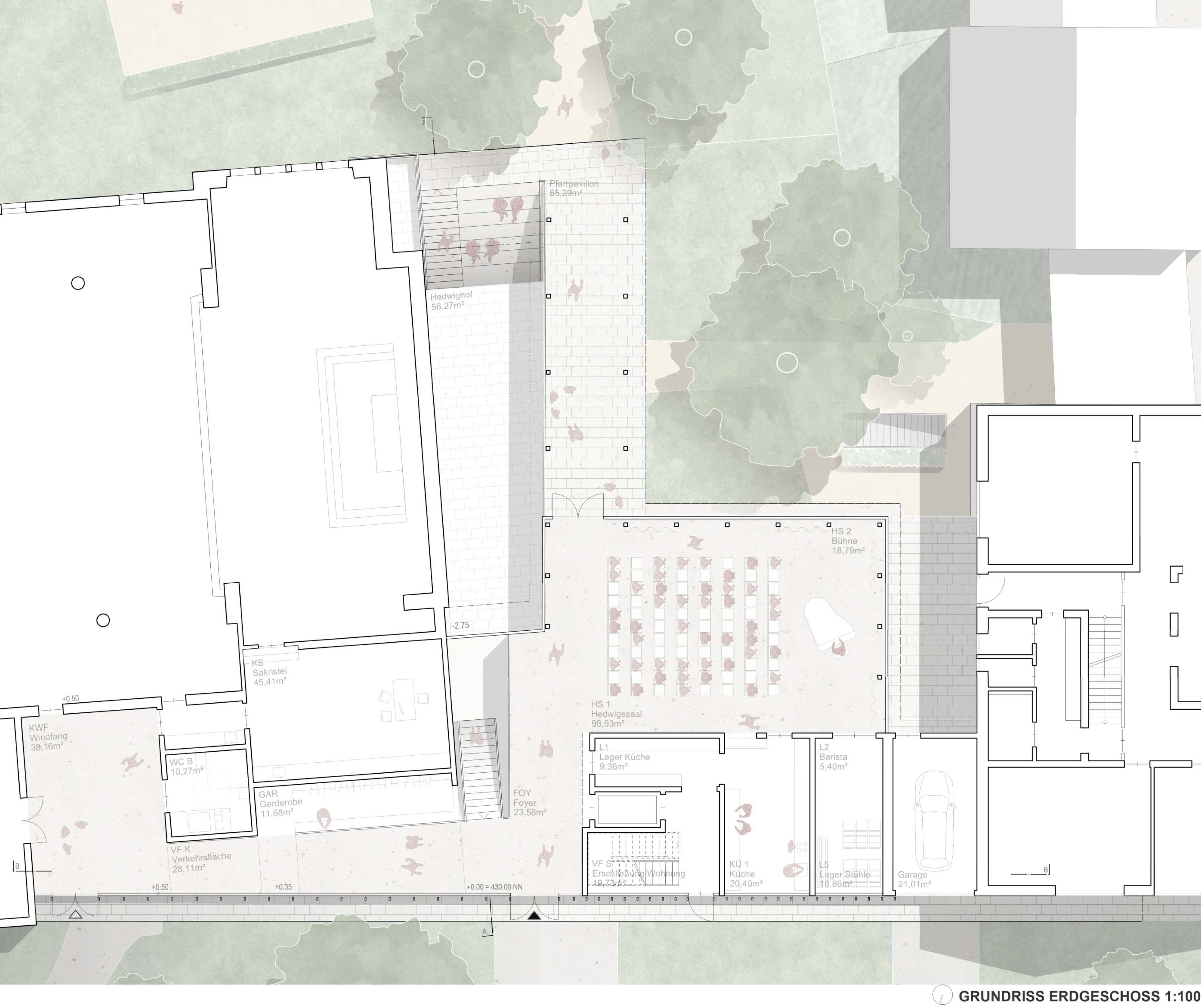 Das vorgesehene Raumprogramm wird in drei Geschossen organisiert und in Form kleinerer Volumen unter oder auf das Pavillondach gesetzt. Der freie Raum, der zwischen den Volumen entsteht, kann polyvalent genutzt werden. Windfang, Foyer, Hedwigsaal und der tiefer liegende Hedwighof sind in diese Potentialflächen eingegliedert, die den sich verändernden Nutzungsanforderungen der Gemeinde heute und in Zukunft dienen sollen. Hierbei spielt der neue Hedwigsaal im Erdgeschoss eine entscheidende Rolle.Zur Straßenseite orientieren sich die dienenden Räume als Rücken, um dem Saal eine freie Sicht und eine direkte Verbindung über eine großflächig verglaste Südfassade zum ruhigen Pfarrgarten zu ermöglichen. Der Saal kann vollständig zum Foyer geöffnet und dem Raumkontinuum zugeschlagen werden. Um eine ausreichende Flexibilität sicherzustellen schlagen wir die Verwendung einer mobilen Bühne vor, die mit Modulen im angrenzenden Stuhllager verstaut werden kann.Im ehemaligen Hedwigsaal im Untergeschoss finden zwei Gruppenräume Platz, die vom Foyer über eine großzügige Treppe direkt erschlossen sind. Die Gruppenräume werden über den Hedwighof belichtet, die Jugendräume sind ebenfalls am Hedwighof angeordnet. So entsteht im Untergeschoss ein Cluster von Versammlungsräumen in einer beruhigten Lage, die durch den Hof als Kommunikationsfläche bereichert werden. Am Südende des Hofs führt eine Freitreppe mit Sitzstufen in den Pfarrgarten. Durch den Umbau wird das schon vorhandene Potential des Pfarrgartens ausgeschöpft und es entsteht ein vielseitig nutzbarer Außenraum. Nach dem Gottesdienst kann Kaffee unter dem Pavillondach ausgeschenkt werden, Kinder und Jugendliche können zwischen Hof und Garten spielen und Veranstaltungen im Hedwigsaal können an der frischen Luft ausklingen.