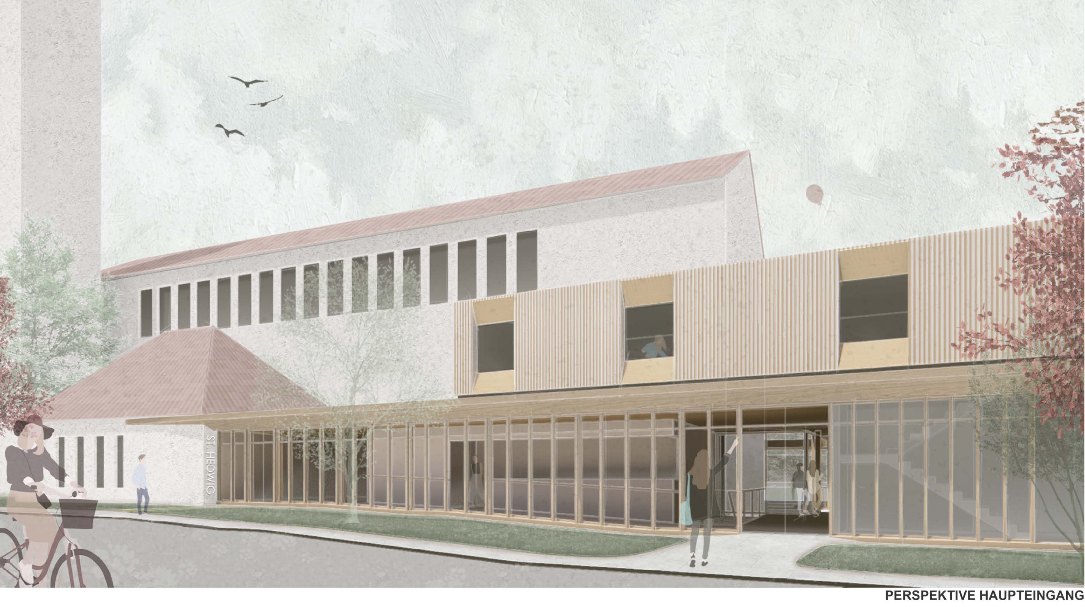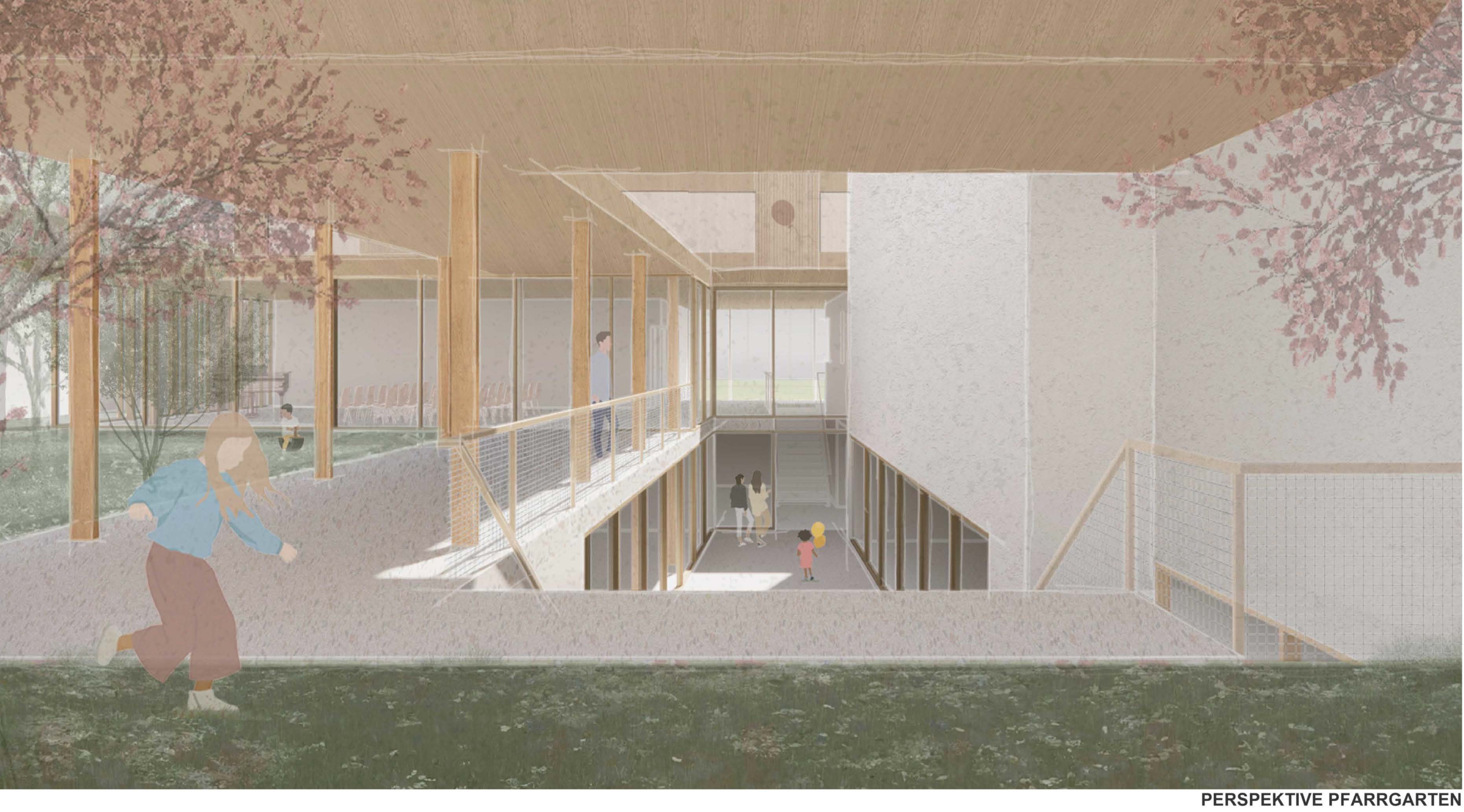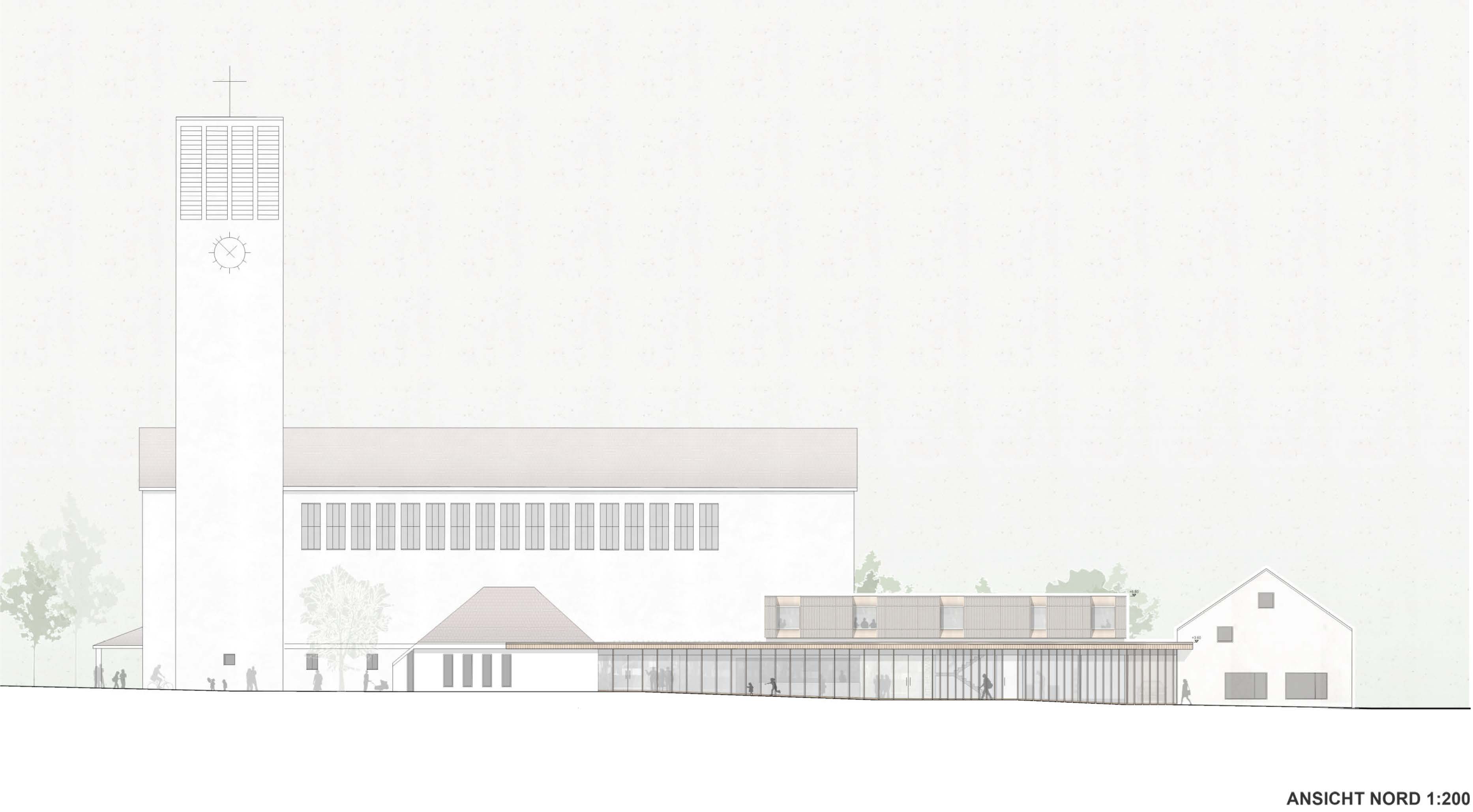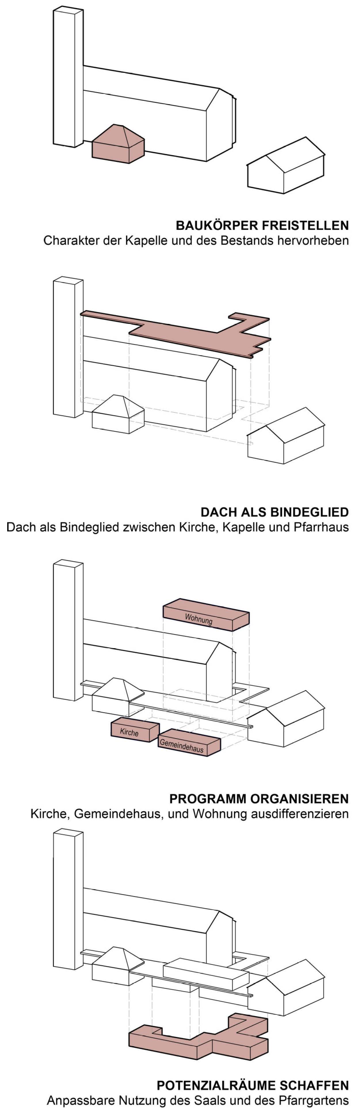 Das vorgesehene Raumprogramm wird in drei Geschossen organisiert und in Form kleinerer Volumen unter oder auf das Pavillondach gesetzt. Der freie Raum, der zwischen den Volumen entsteht, kann polyvalent genutzt werden. Windfang, Foyer, Hedwigsaal und der tiefer liegende Hedwighof sind in diese Potentialflächen eingegliedert, die den sich verändernden Nutzungsanforderungen der Gemeinde heute und in Zukunft dienen sollen. Hierbei spielt der neue Hedwigsaal im Erdgeschoss eine entscheidende Rolle.Zur Straßenseite orientieren sich die dienenden Räume als Rücken, um dem Saal eine freie Sicht und eine direkte Verbindung über eine großflächig verglaste Südfassade zum ruhigen Pfarrgarten zu ermöglichen. Der Saal kann vollständig zum Foyer geöffnet und dem Raumkontinuum zugeschlagen werden. Um eine ausreichende Flexibilität sicherzustellen schlagen wir die Verwendung einer mobilen Bühne vor, die mit Modulen im angrenzenden Stuhllager verstaut werden kann.Im ehemaligen Hedwigsaal im Untergeschoss finden zwei Gruppenräume Platz, die vom Foyer über eine großzügige Treppe direkt erschlossen sind. Die Gruppenräume werden über den Hedwighof belichtet, die Jugendräume sind ebenfalls am Hedwighof angeordnet. So entsteht im Untergeschoss ein Cluster von Versammlungsräumen in einer beruhigten Lage, die durch den Hof als Kommunikationsfläche bereichert werden. Am Südende des Hofs führt eine Freitreppe mit Sitzstufen in den Pfarrgarten. Durch den Umbau wird das schon vorhandene Potential des Pfarrgartens ausgeschöpft und es entsteht ein vielseitig nutzbarer Außenraum. Nach dem Gottesdienst kann Kaffee unter dem Pavillondach ausgeschenkt werden, Kinder und Jugendliche können zwischen Hof und Garten spielen und Veranstaltungen im Hedwigsaal können an der frischen Luft ausklingen.