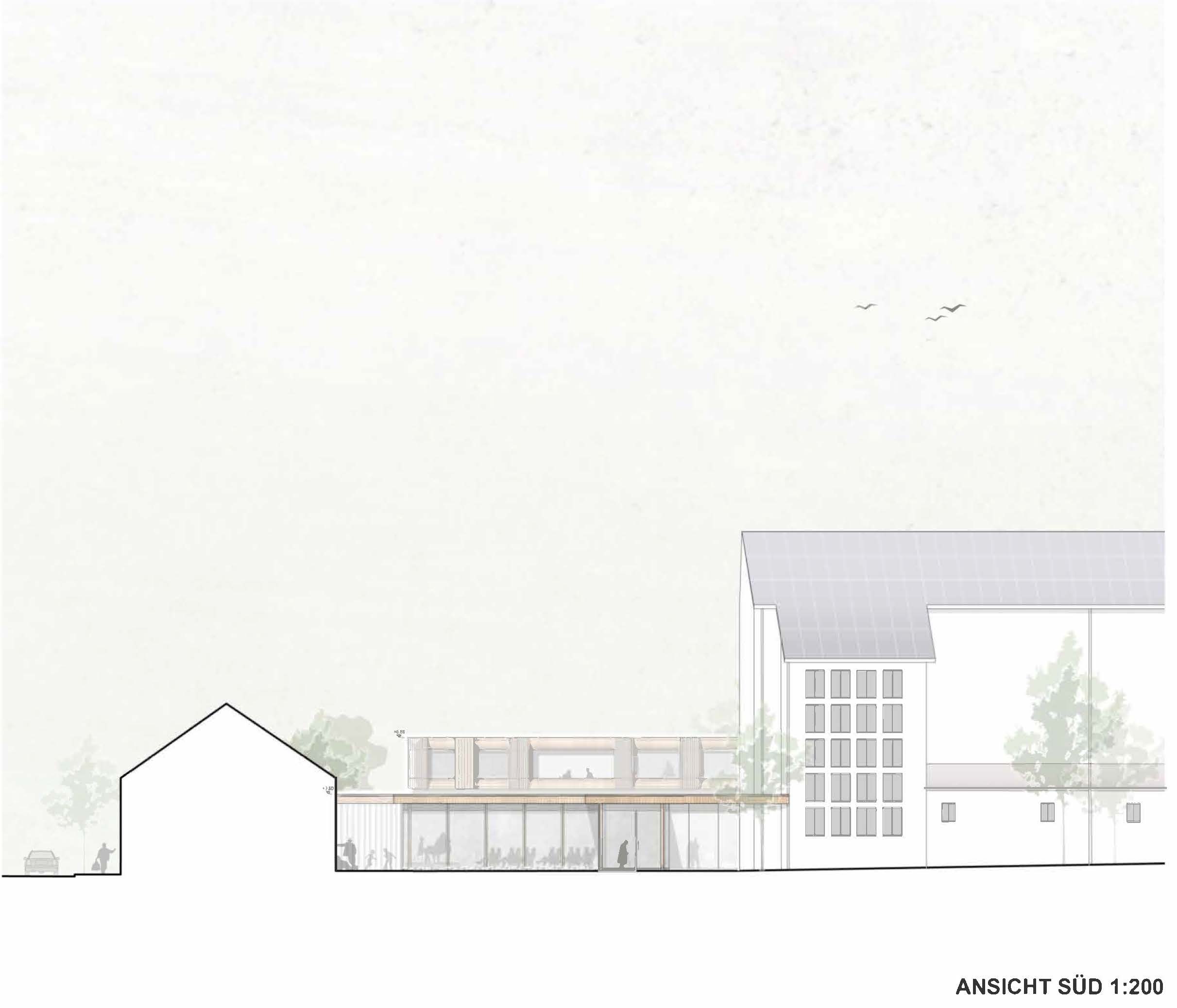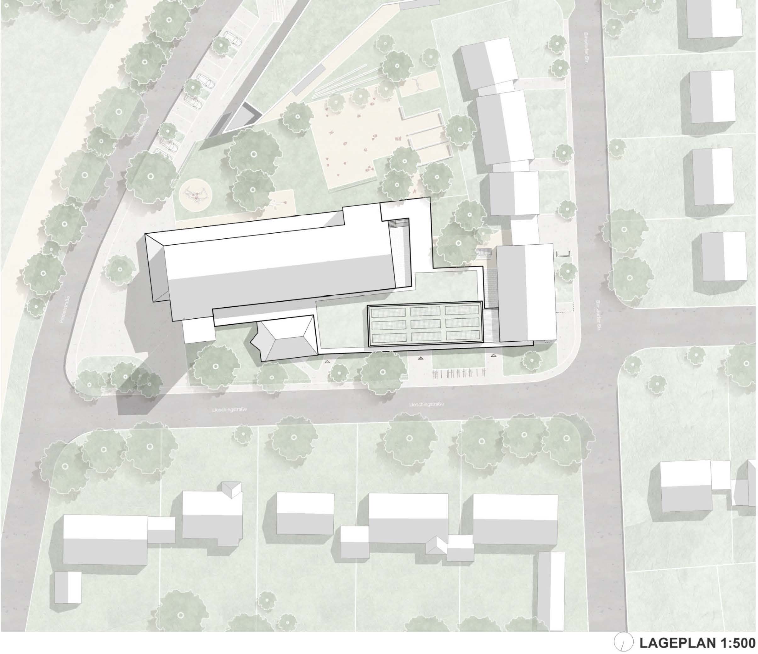 Das Gebäudeensemble der katholischen Gemeinde St. Hedwig steht als wichtiger Stadtbaustein am westlichen Eingang des Wohnquartiers in Stuttgart-Möhringen und soll durch die vorgeschlagene bauliche Erneuerung und Ergänzung eine einladende und schlüssige Erweiterung der vorhandenen Bausubstanz erzielen. Kapelle, Kirche und Pfarrhaus bilden ein heterogenes und programmatisch differenziertes Ensemble, die bei unserem Entwurf freigestellt werden und als eigenständige Baukörper auftreten, wobei der geplante Neubau als flacher Pavillon ausformuliert wird, dessen Dach als Bindeglied die einzelnen Bestandsbaukörper miteinander verbindet. Durch die Ergänzung der Kapelle zum geometrisch vollwertigen Walmdach wird die markante Geometrie der Zeltdecke in der Kubatur abgebildet. Die prägnante, horizontale Dachlinie des Neubaus verbindet sowohl die Kapelle und die Kirche mit dem Pfarrhaus als auch die Straße mit dem Pfarrgarten. Der Hedwighof entsteht als tiefer gelegter Pufferraum zwischen Kirche und Neubau in der Verlängerung des Pfarrgartens und ermöglicht so die Belichtung und den Freiraumbezug des Untergeschosses.