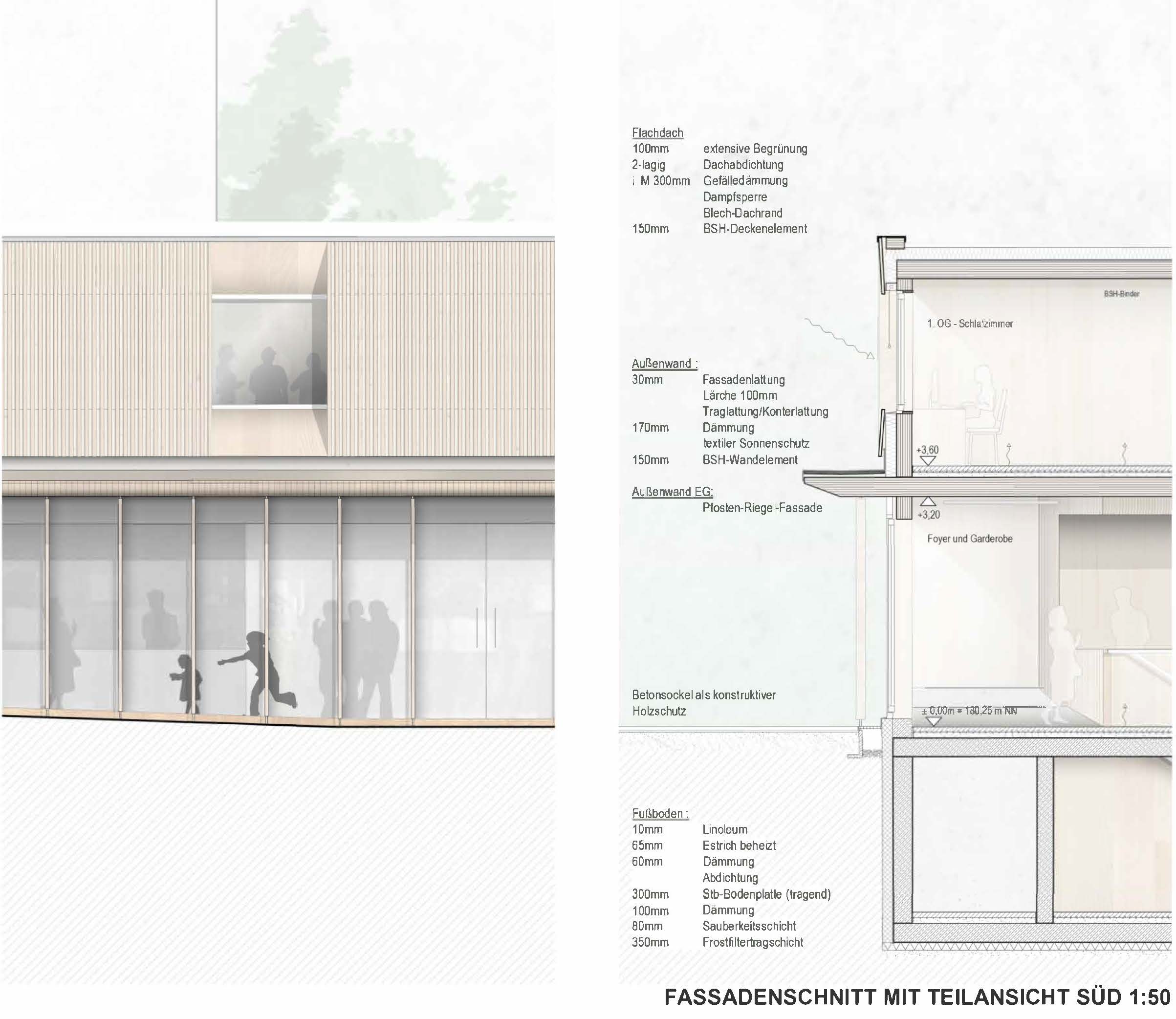 Die Leichtigkeit des Pavillon-Neubaus wird durch eine nachhaltige Holz-Bauweise betont. Die tragenden Brettsperrholzwände und -decken werden im Obergeschoss mit einer einfachen Brettschalung verkleidet während eine Pfostenriegelkonstruktion im Erdgeschoss den Innen- und Außenraum verbindet und Offenheit ausstrahlt. Durch den Dachüberstand wird die Verglasung verschattet und so vor Überhitzung im Sommer geschützt. Durch eine Überströmung im Foyer kann Zuluft in das Untergeschoss geführt und über den Hedwighof wieder abgeleitet werden. So können die Gemeindehausnutzungen im Sinne des Low-Tec-Gedanken einfach temperiert werden. Die Energiegewinnung durch Geothermie und Wärmepumpe wird zusätzlich durch das Aufbringen einer PV-Anlage auf dem Dach unterstützt, die Fußbodenheizung sowie die elektrischen Anlagen können so zuverlässig klimaneutral betrieben werden. Durch den Batterieraum in Untergeschoss wird der Eigennutzungsgrad des Stroms deutlich erhöht. Insgesamt soll die nachhaltige und energieeffiziente Bauweise der Erweiterung den uneingeschränkten Betrieb auf umweltschützende Weise sicherstellen und der sozialen Verantwortung gerecht werden.