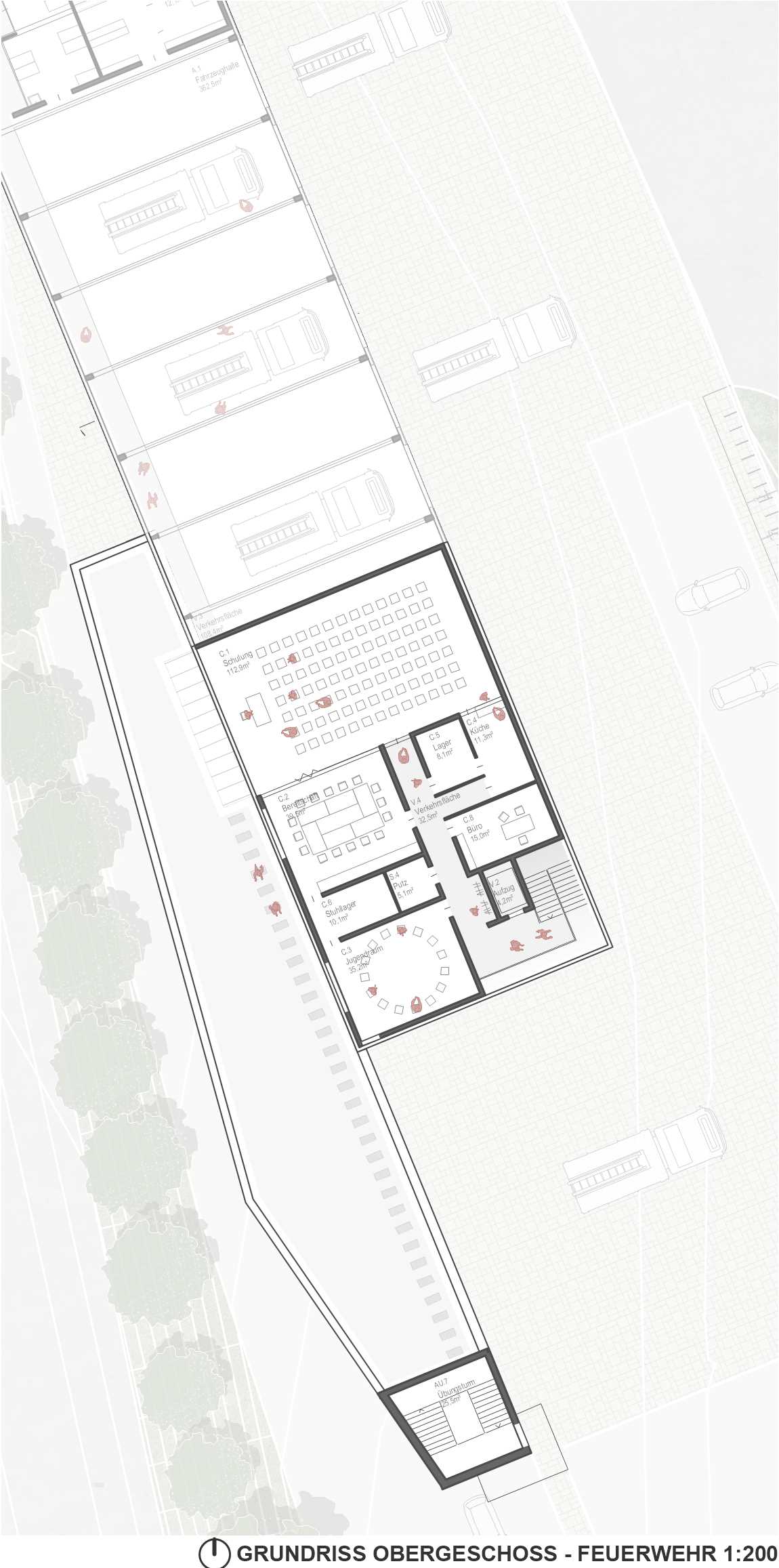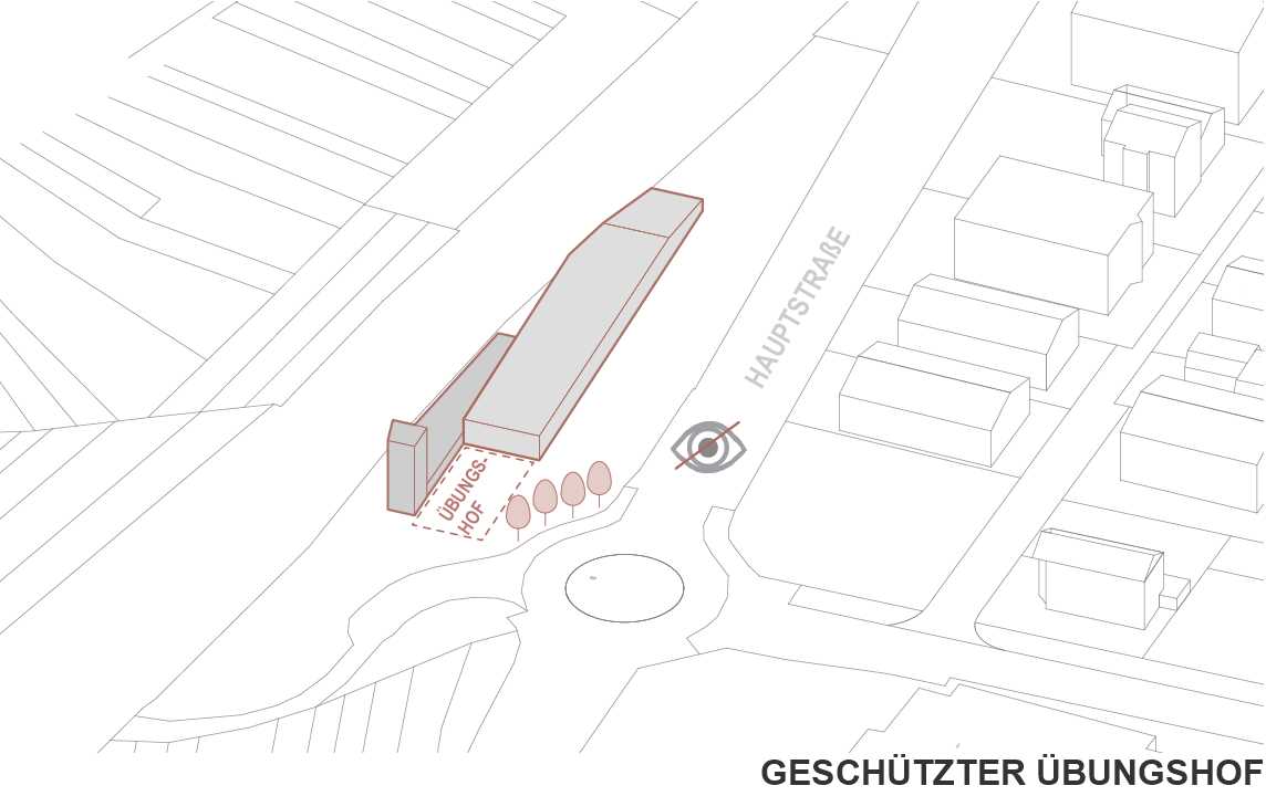 Durch das Versetzen der beiden Baukörper entsteht ein Zweiseiten-Hof, der mehrere Funktionen hat: Übungshof, Eingangshof, Besucherparkplatz, Hof für Feuerwehrfeste, Turmplatz als städtebauliches Zeichen am Kreisel. Die 22 notwendigen Parkplätze sind in zwei Paketen um den Übungshof angeordnet, um die Wege zum Alarmeingang möglichst kurz zu halten. Die 6 Besucherparkplätze liegen auf dem Übungshof, um keine zusätzliche Versiegelung zu schaffen. Das Feuerwehrhaus ist über einen Fuß- und Radweg an das Dorf angebunden. Die überdachten Fahrradabstellplätze liegen dabei auf dem Weg zum Eingang.