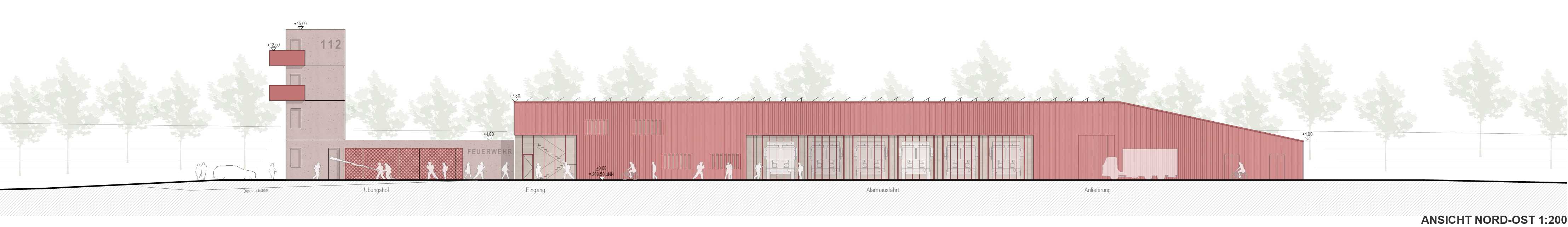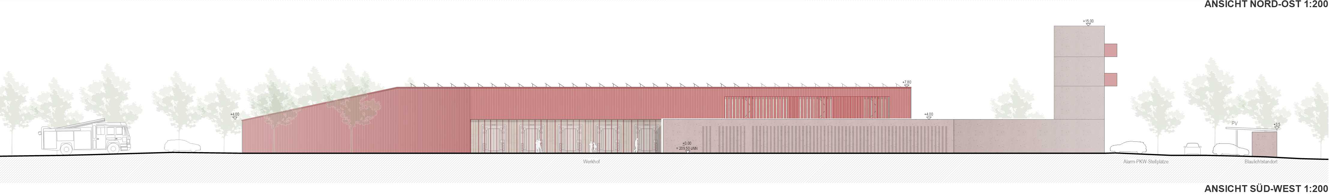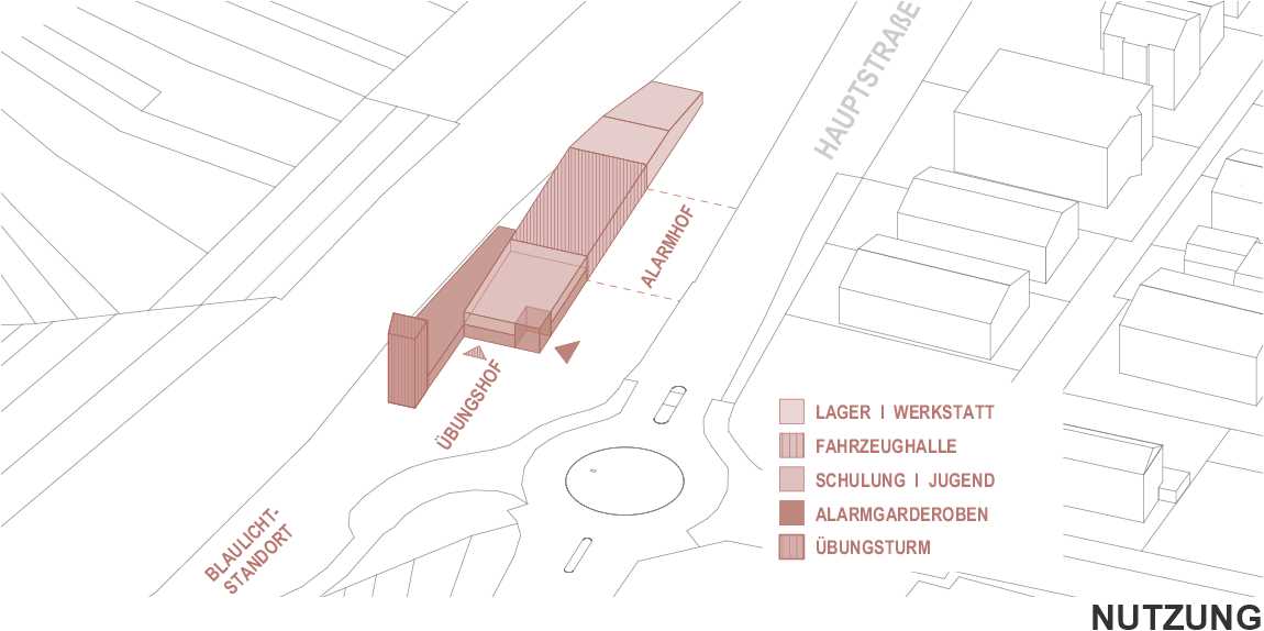 Wegen der schmalen Grundstücksform, der Einschränkungen durch die Hochspannungsleitungen und dem Abstandsgebot zur Landstraße ergibt sich zwangsläufig eine lineare Anordnung der einzelnen Funktionsbereiche. Um trotzdem einen kompakten Baukörper zu entwickeln, haben wir die Verwaltungs- und Veranstaltungseinheit in einem Obergeschoss angeordnet und die überhohe Fahrzeughalle über dem dazugehörigen Lager hin zu dem übrigen Werksatt- und Lagerbereich abgeflacht. Das ergibt insgesamt einen langen dynamischen Baukörper, der sich neben der Landstraße auftut. Dabei setzt sich das Feuerwehrhaus aus zwei Baukörpern zusammen, einem zweigeschossigen aus Holz, der sich wie oben beschrieben zu einem Geschoss abflacht, und einem eingeschossigen beigestellten Baukörper aus Beton, der sich am Ende Richtung Kreisel zum Turm entwickelt. Dabei richtet sich die Höhe des Übungsturms nach der Forderung einer Anleiterhöhe von 12,50 m. Die beiden Baukörper sind gegeneinander verschoben und markieren zwei Seiten des Übungshofs. Dabei übernimmt die nördliche zweigeschossige Hofbegrenzung die Rolle einer Blickschutzwand in Richtung Landstraße, um eine Ablenkung der Verkehrsteilnehmer bei Übungen zu vermeiden.