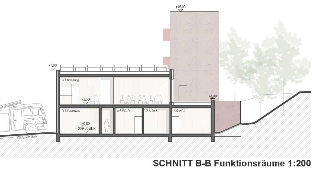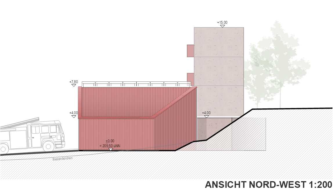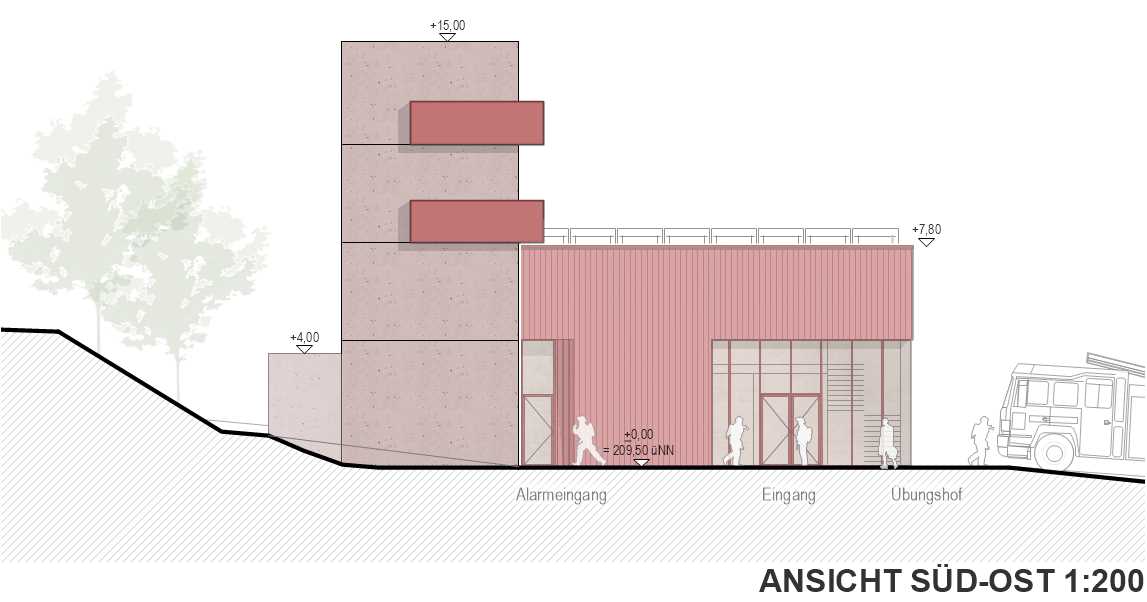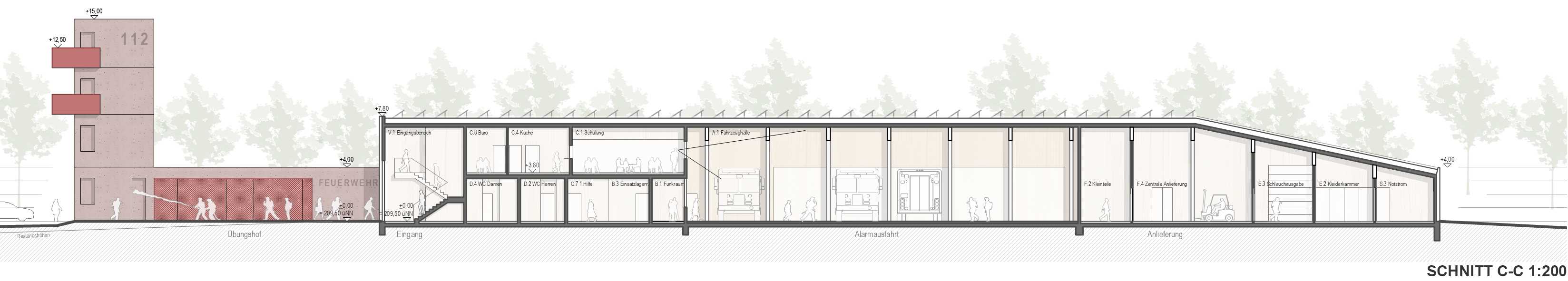 Wegen der schmalen Grundstücksform, der Einschränkungen durch die Hochspannungsleitungen und dem Abstandsgebot zur Landstraße ergibt sich zwangsläufig eine lineare Anordnung der einzelnen Funktionsbereiche. Um trotzdem einen kompakten Baukörper zu entwickeln, haben wir die Verwaltungs- und Veranstaltungseinheit in einem Obergeschoss angeordnet und die überhohe Fahrzeughalle über dem dazugehörigen Lager hin zu dem übrigen Werksatt- und Lagerbereich abgeflacht. Das ergibt insgesamt einen langen dynamischen Baukörper, der sich neben der Landstraße auftut. Dabei setzt sich das Feuerwehrhaus aus zwei Baukörpern zusammen, einem zweigeschossigen aus Holz, der sich wie oben beschrieben zu einem Geschoss abflacht, und einem eingeschossigen beigestellten Baukörper aus Beton, der sich am Ende Richtung Kreisel zum Turm entwickelt. Dabei richtet sich die Höhe des Übungsturms nach der Forderung einer Anleiterhöhe von 12,50 m. Die beiden Baukörper sind gegeneinander verschoben und markieren zwei Seiten des Übungshofs. Dabei übernimmt die nördliche zweigeschossige Hofbegrenzung die Rolle einer Blickschutzwand in Richtung Landstraße, um eine Ablenkung der Verkehrsteilnehmer bei Übungen zu vermeiden.