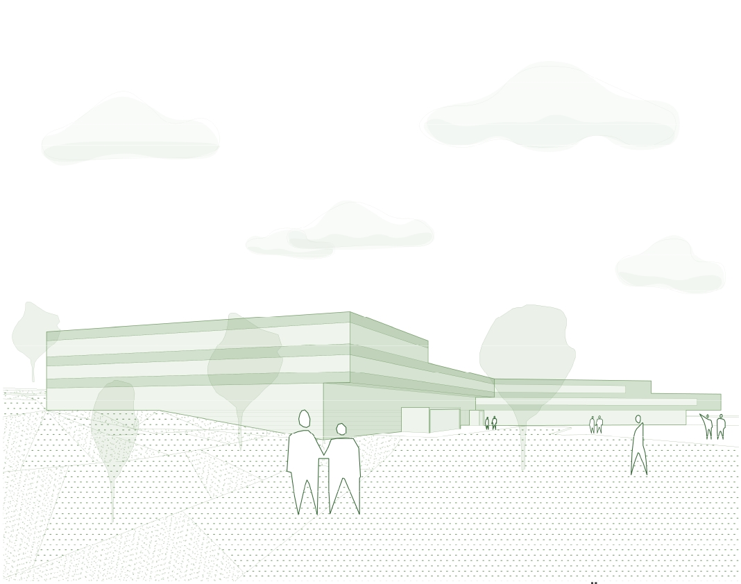 Der Erweiterungsbau soll im besten Sinn ein hybrides Gebäude werden, eine Mischung aus Beton und Holz. Jeder Baustoff übernimmt dabei die Aufgaben, die sich damit am besten lösen lassen. Das teilweise im Hang eingegrabene Sockelgeschoss wird aus Beton konstruiert, ebenso die auskragende Decke über dem 1.OG. Sie nimmt an dieser Stelle die Bestandslinie auf und setzt die Geste des großzügigen Eingangsbereichs fort. Dazwischen und darüber wird ein Holzskelett implementiert.