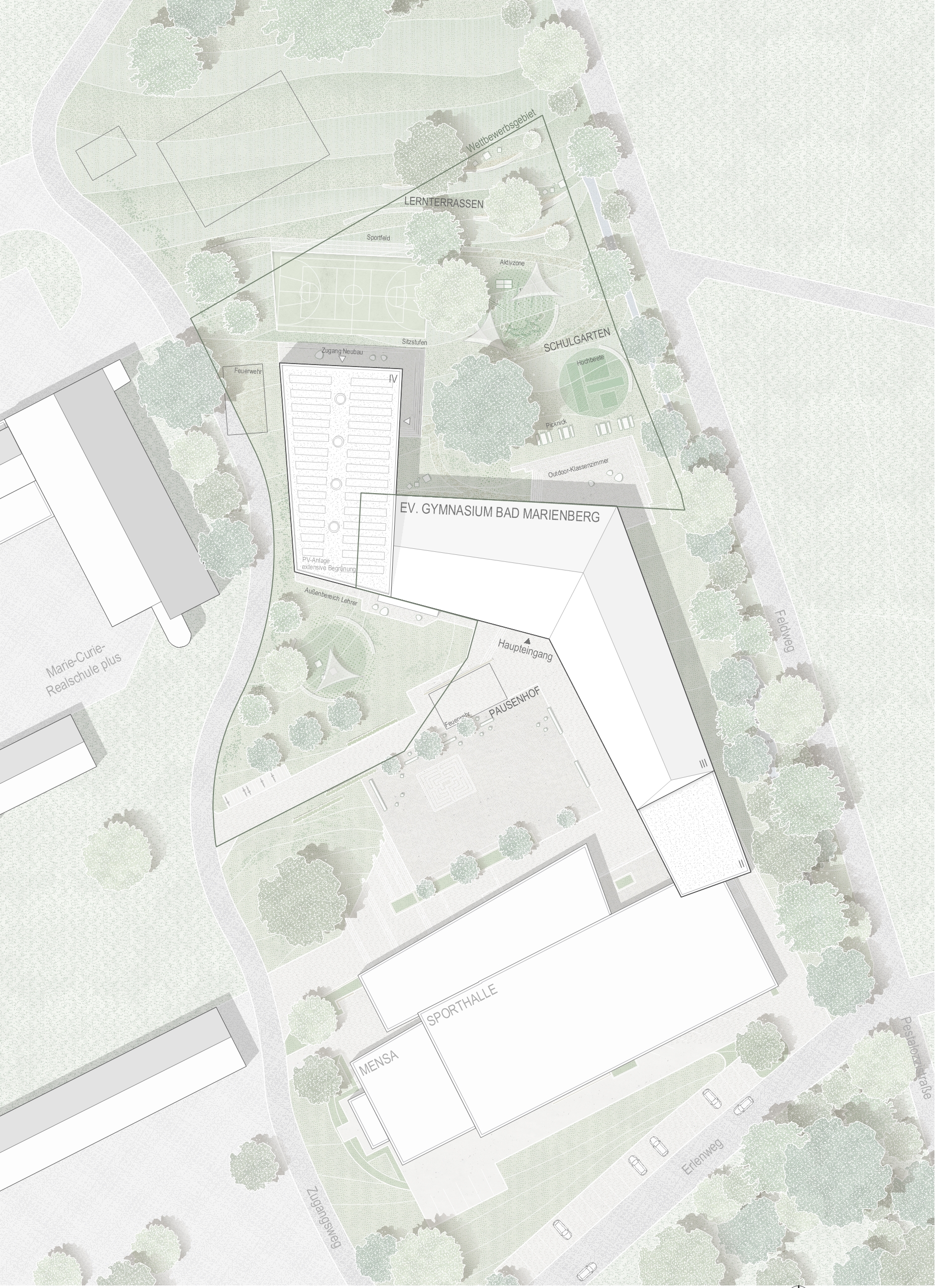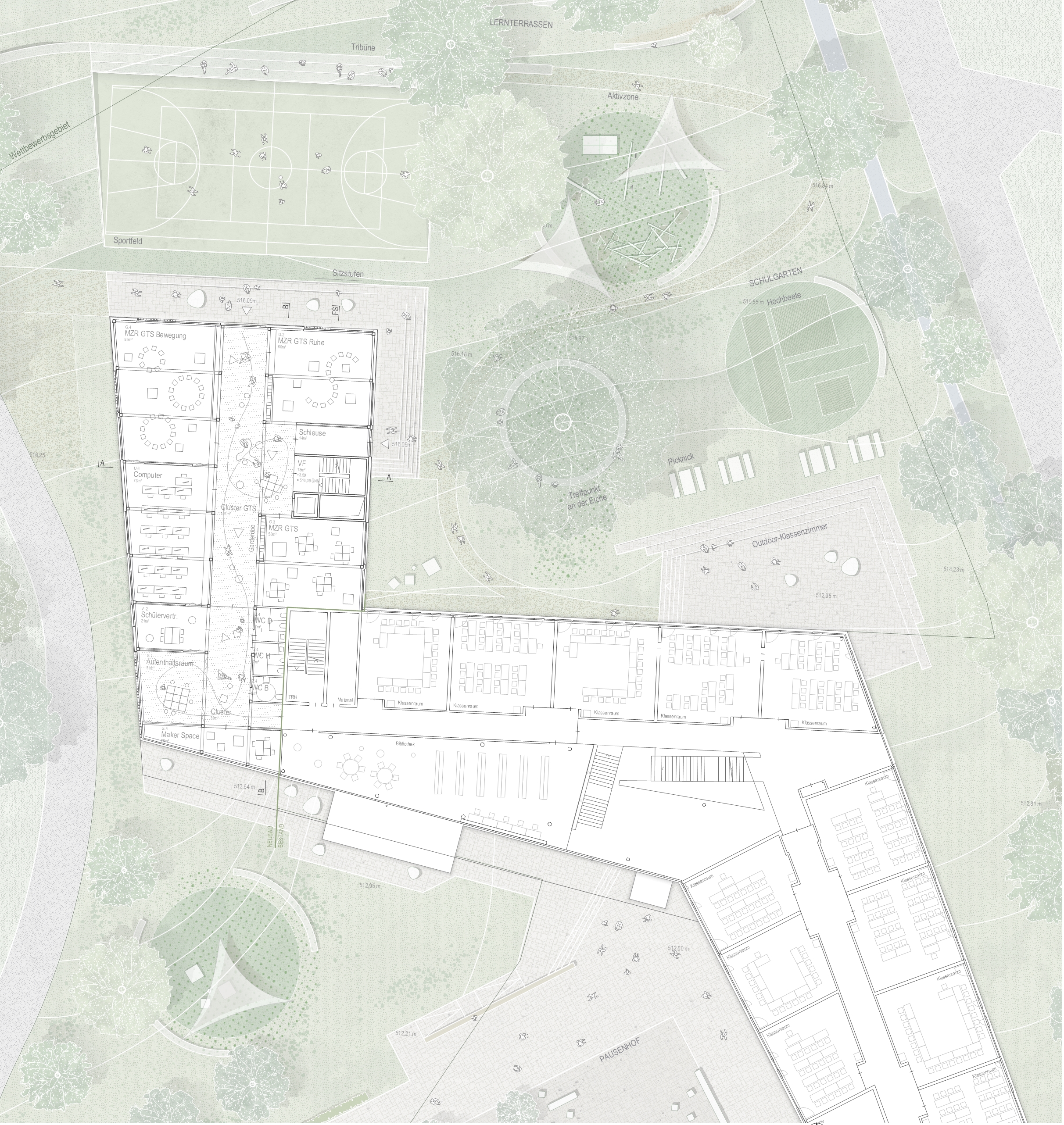 Auch die neuen Außenanlagen werden im selben Duktus wie die bestehenden Außenanlagen angelegt. Am Kopf der Erweiterung wird das Erdgeschoss über eine Hof- und Treppenanlage in das Gelände eingepasst. Es entstehen neue Schulgärten und Lernterrassen. Der Sportplatz wird auf dem Gelände neu verortet in Verlängerung der Erweiterung. Durch den Neubau eingerahmt, dient die große Eiche als zentraler Treffpunkt im grünen Schulhof.
