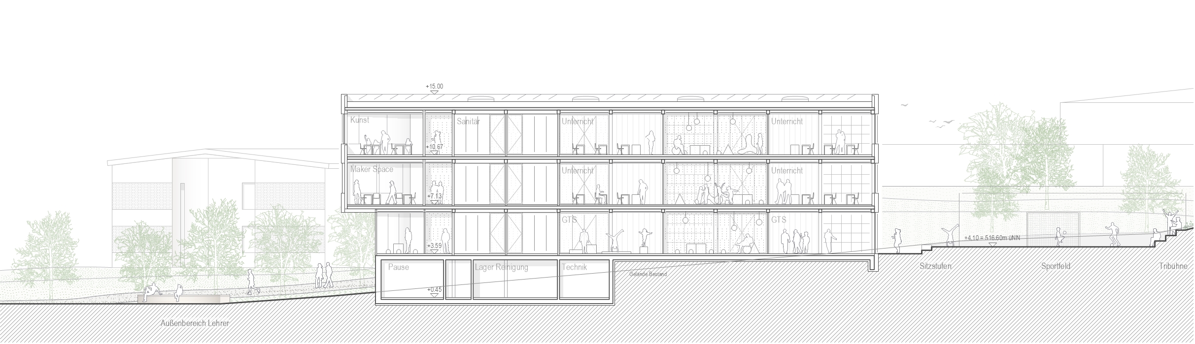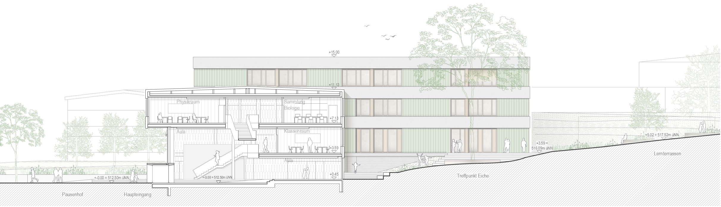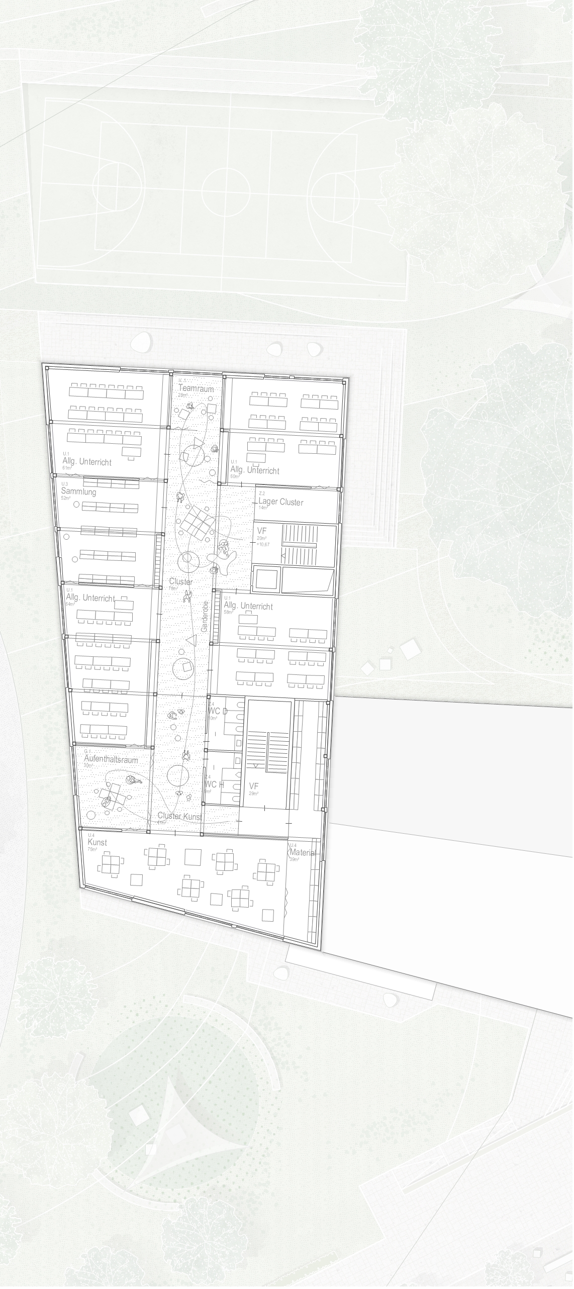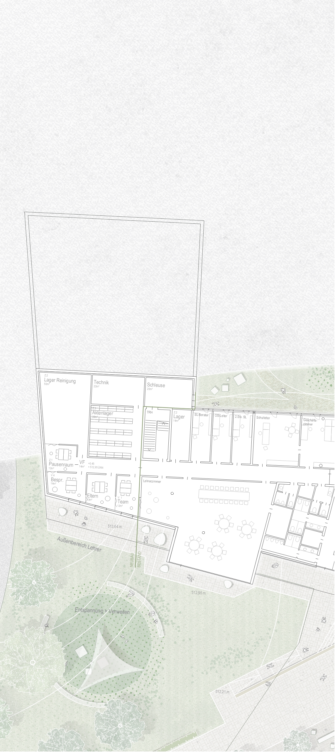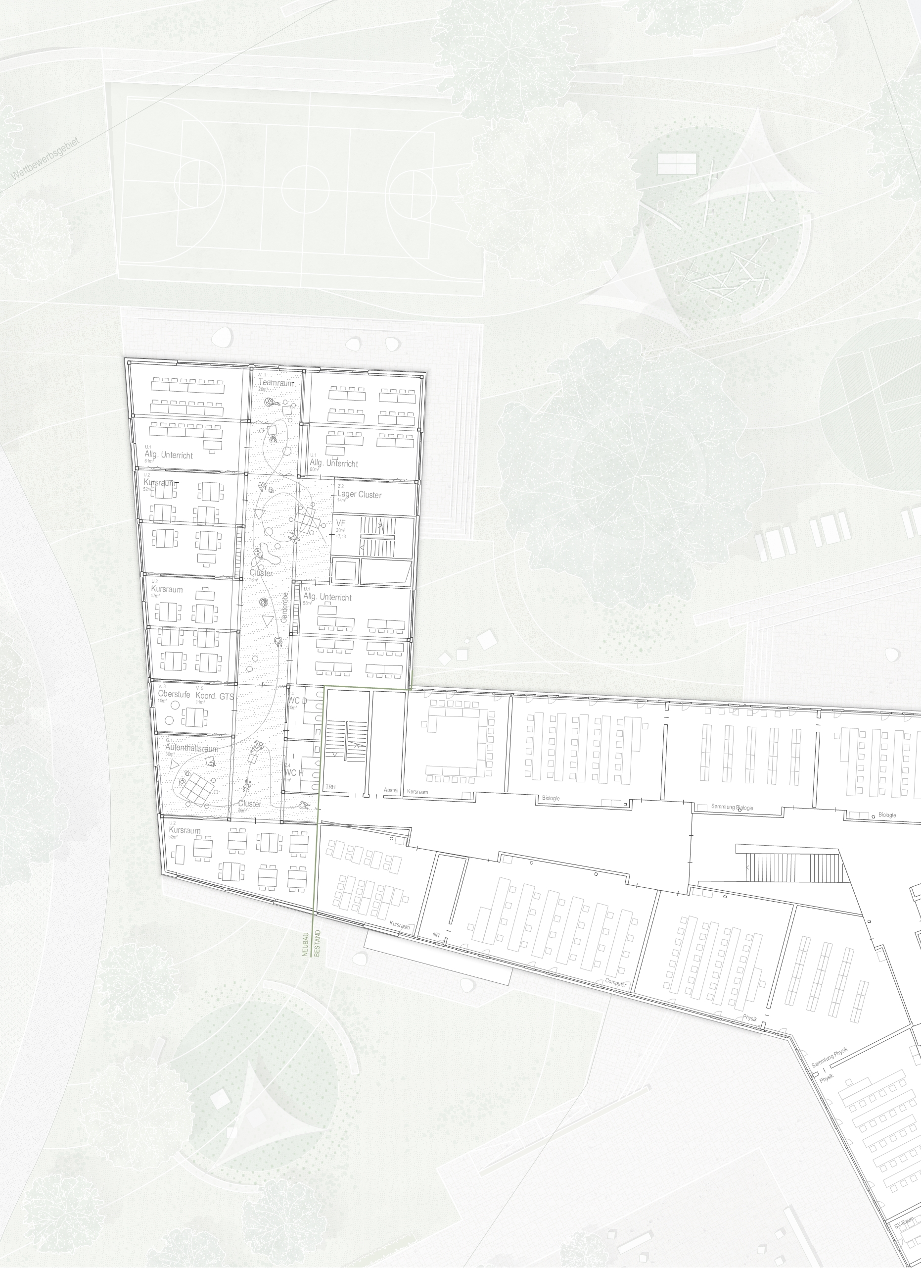 Die bestehende Schule ist durch ein offenes dreigeschossiges Foyer mit Aula geprägt, das als zentrales Herzstück fungiert. Innerhalb der Flügel sind die Flächen für Begegnungsräume sowie für Rückzugsmöglichkeiten begrenzt. Der Erweiterungsbau bietet die Chance, diese Defizite auszugleichen und eine moderne Lernumgebung zu schaffen, die direkt an den Bestand angeschlossen ist und fließend in diesen übergeht. In Übereinstimmung mit den pädagogischen Zielen der Schule entstehen Räume für konzentrierten Unterricht und freie Lernformen. Erschließungsbereiche werden nicht nur als Verkehrsflächen, sondern als aktive Lern- und Aufenthaltszonen konzipiert.