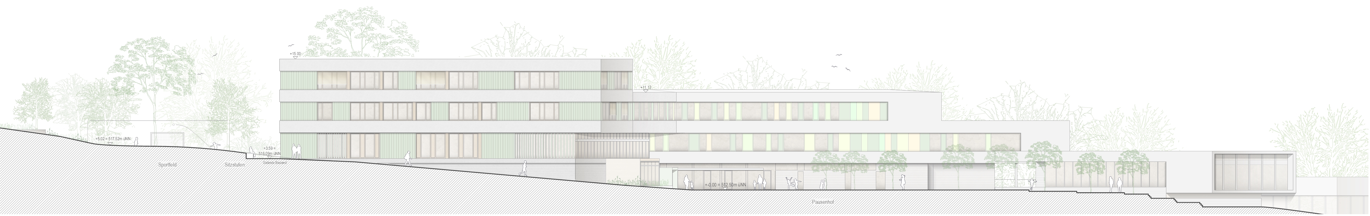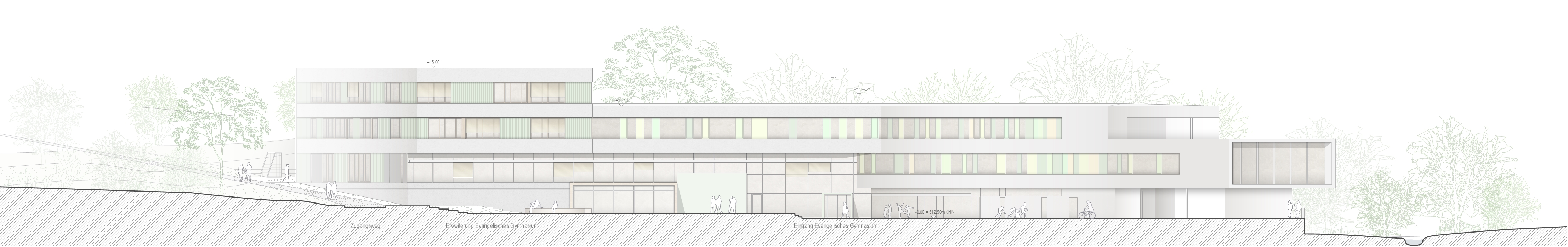 Der Grundgedanke unseres Entwurfs für die Erweiterung des Gymnasiums ist die Fortführung der Bestandsbebauung. Wie ein Passstück dockt der Erweiterungsbau im Westen an den Bestand an und macht aus der Winkelform eine Z-Form. Dabei übernehmen wir die Bandfassaden und die Staffelung des Gebäudevolumens. Das neue Gesamtvolumen staffelt sich von drei über zwei zu einem Geschoss ab und fügt sich so, dem Hanggelände folgend, in die Topographie ein.