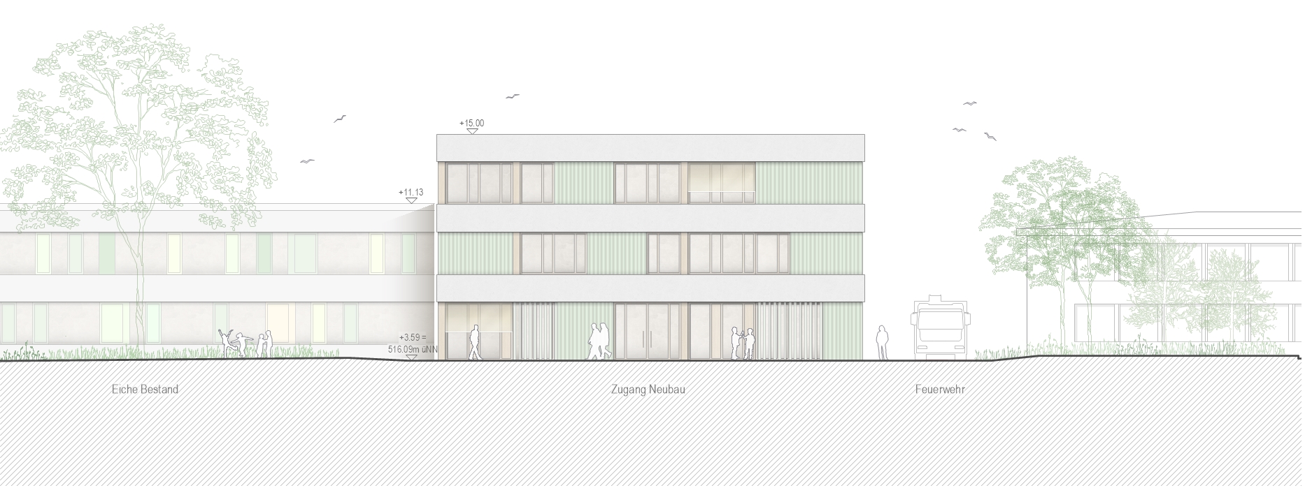 Insgesamt geht unser Entwurf mit dem Prinzip des WEITERBAUENS individuell auf den Bestand, seine Kubatur und Architektursprache ein und schafft es über das verbindende Element der Bänderung den Neubau wie selbstverständlich in das Ensemble einzufügen.