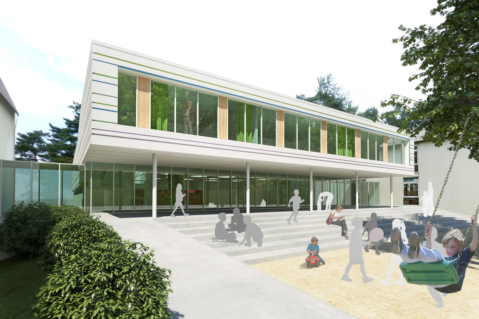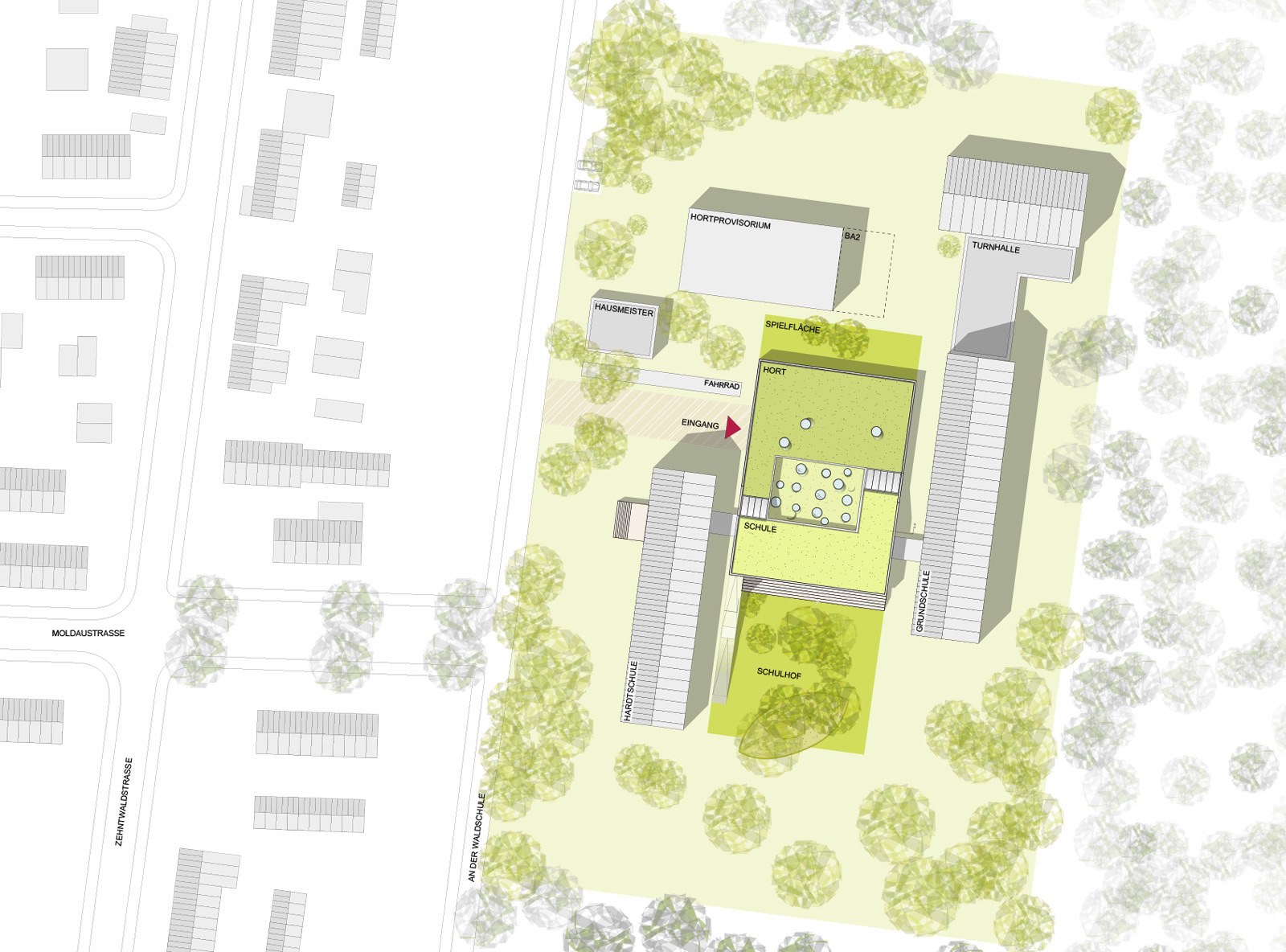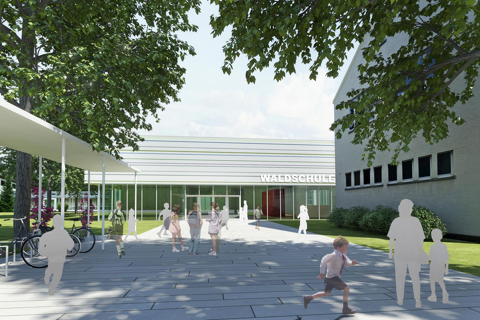 Die Waldschule besteht momentan aus zwei unterschiedlichen Schulen, die auch baulich klar voneinander getrennt sind. Aufgabe ist es, weitere Nutzungen, wie einen Kinderhort und großzügige Mehrzweckbereiche sowie mehrere Kurz- und Klassenräume hinzuzufügen.