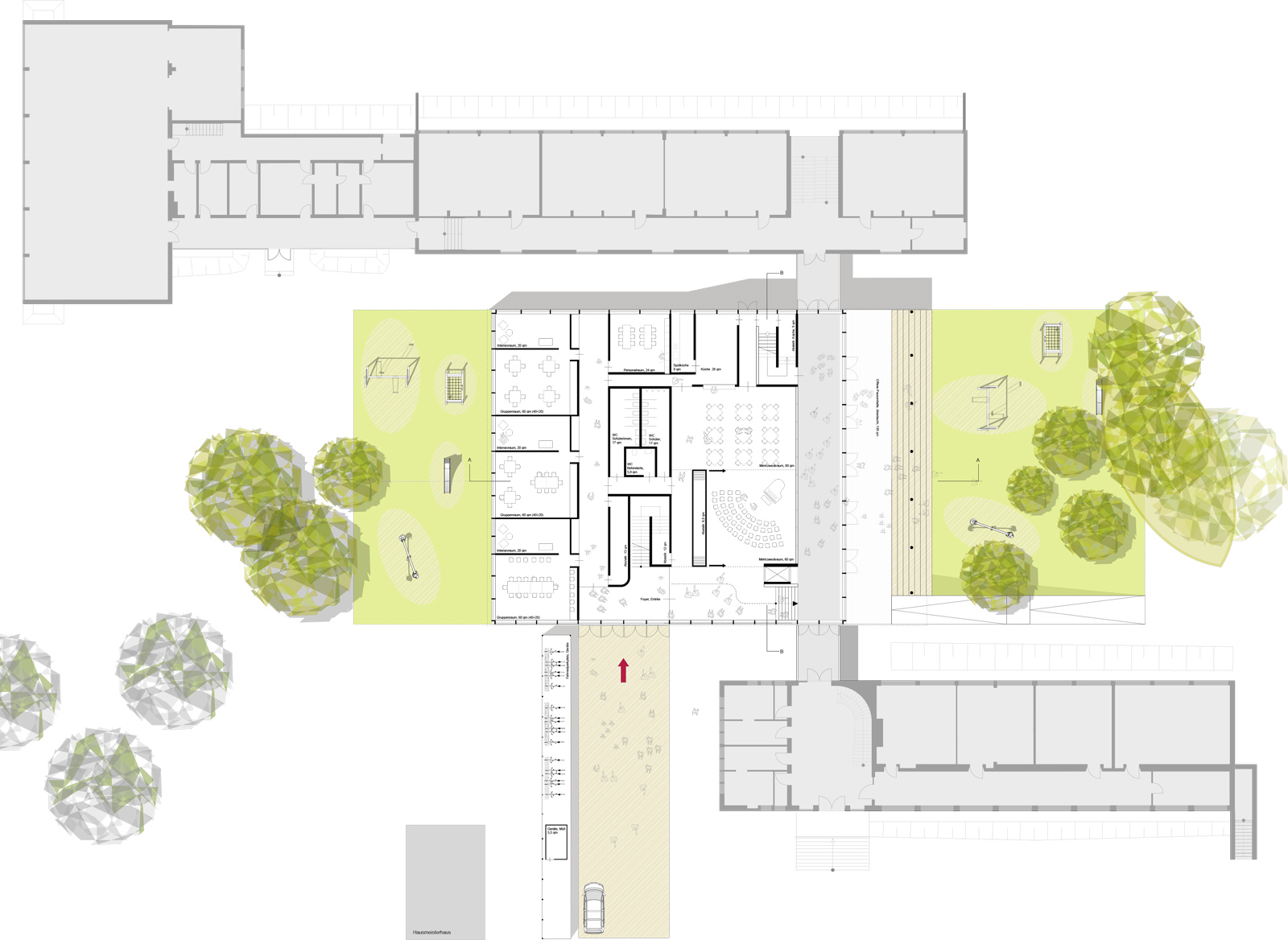 Die Erweiterung in einem separaten Baukörper, der nur über einen gedeckten Gang mit den anderen Baukörpern verbunden wird, haben wir rasch verworfen. Zum einen werden die eigentlichen Probleme der Schule, wie der fehlende gemeinsame Eingang, der Zugang zu den Pausenflächen und die behindertengerechte Erschließung des Bestands, nicht gelöst, zum anderen wird die Schule städtebaulich zu einer Ansammlung von Einzelgebäuden, die dem Namen „Waldschule“ als Ensemble nicht gerecht werden können.