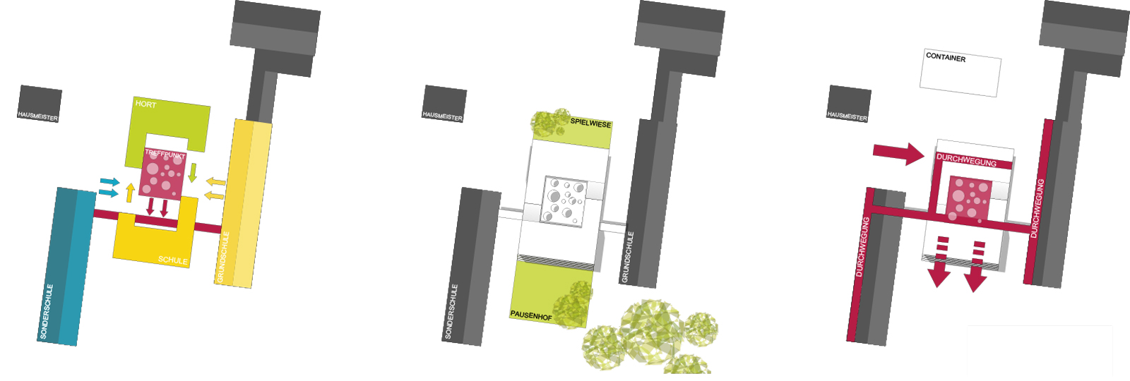 Die den Pausenflächen vorgelagerte überdeckte Pausenhalle schafft einen allmählichen Übergang von außen nach innen. Die anschließenden Stufen, aufgelockert durch Sitzgelegenheiten, und die seitlich liegende Rampe führen die Kinder zu den Spielbereichen. Das gesamte Konzept der Erweiterung basiert auf der optimalen Zuordnung der Funktionen im Inneren und Äußeren, wie die getrennte Erschließung von Hort und Schule, der externen Nutzung des Mehrzweckbereichs, die Zuordnung des Mehrzweckbereichs zur Pausenhalle und den Freibereichen, und es nutzt die Synergien, wie den gemeinsamen Eingang, die behindertengerechte Erschließung, die gemeinsam genutzten Sanitärbereiche und die eine gedeckte Pausenhalle für beide Schulen.