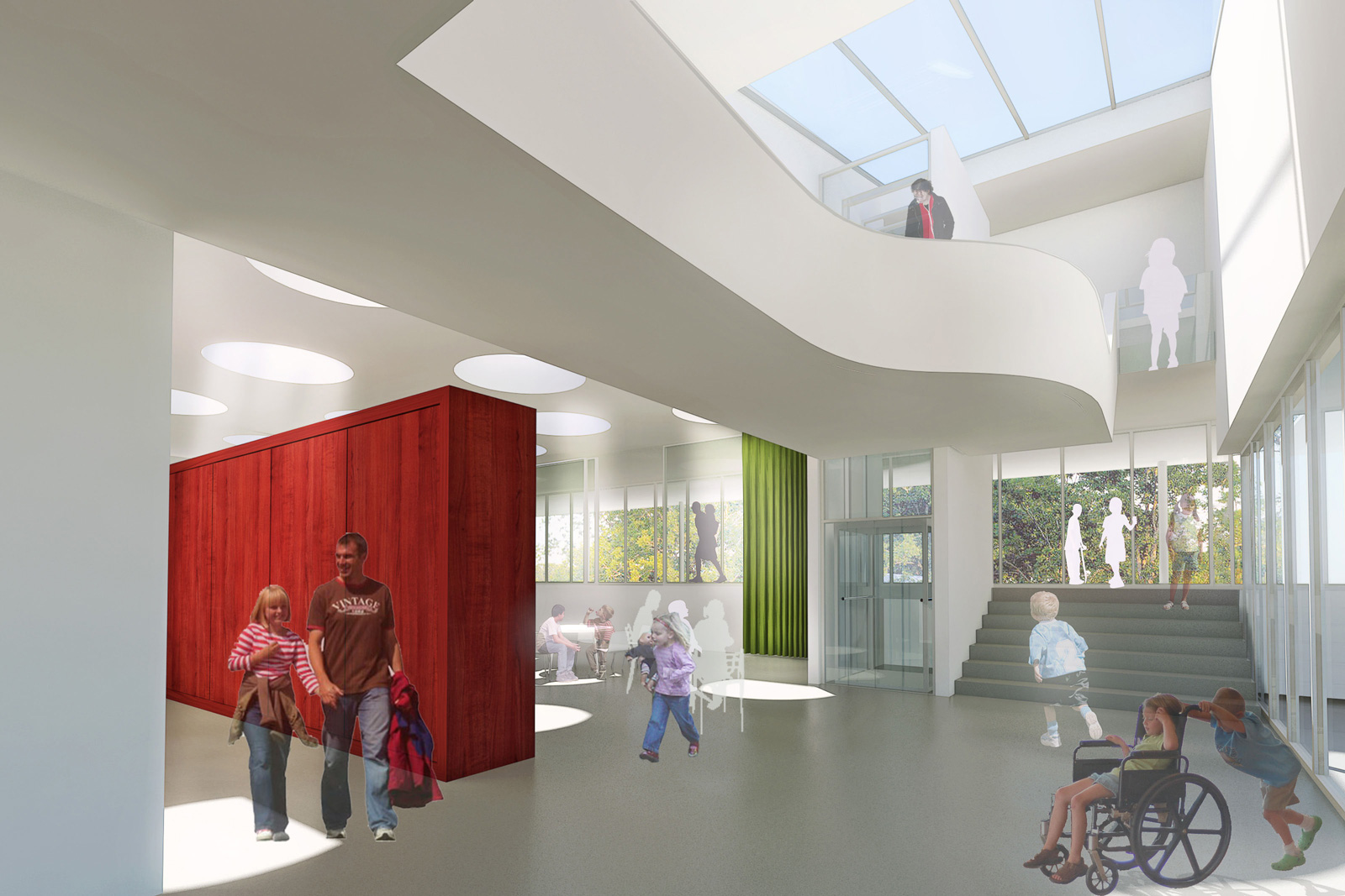 Mit der Platzierung des Baukörpers zwischen beide Bestandsgebäude bekommt die Schule ein neues Herz. Der neue Verbindungsbau vereint die Bauten zu einem Ensemble, ohne die lineare Struktur der Einzelgebäude zu zerstören. Durch die geschickte Anwendung des Split-Level-Prinzips konnten die unterschiedlichen Niveaus ausgeglichen werden. Der neue Zugang führt die Schüler ohne aufwändige Treppen- oder Rampenanlagen in das zentrale Gebäude, innen überbrückt man wie selbstverständlich den Niveausprung im Foyer.
