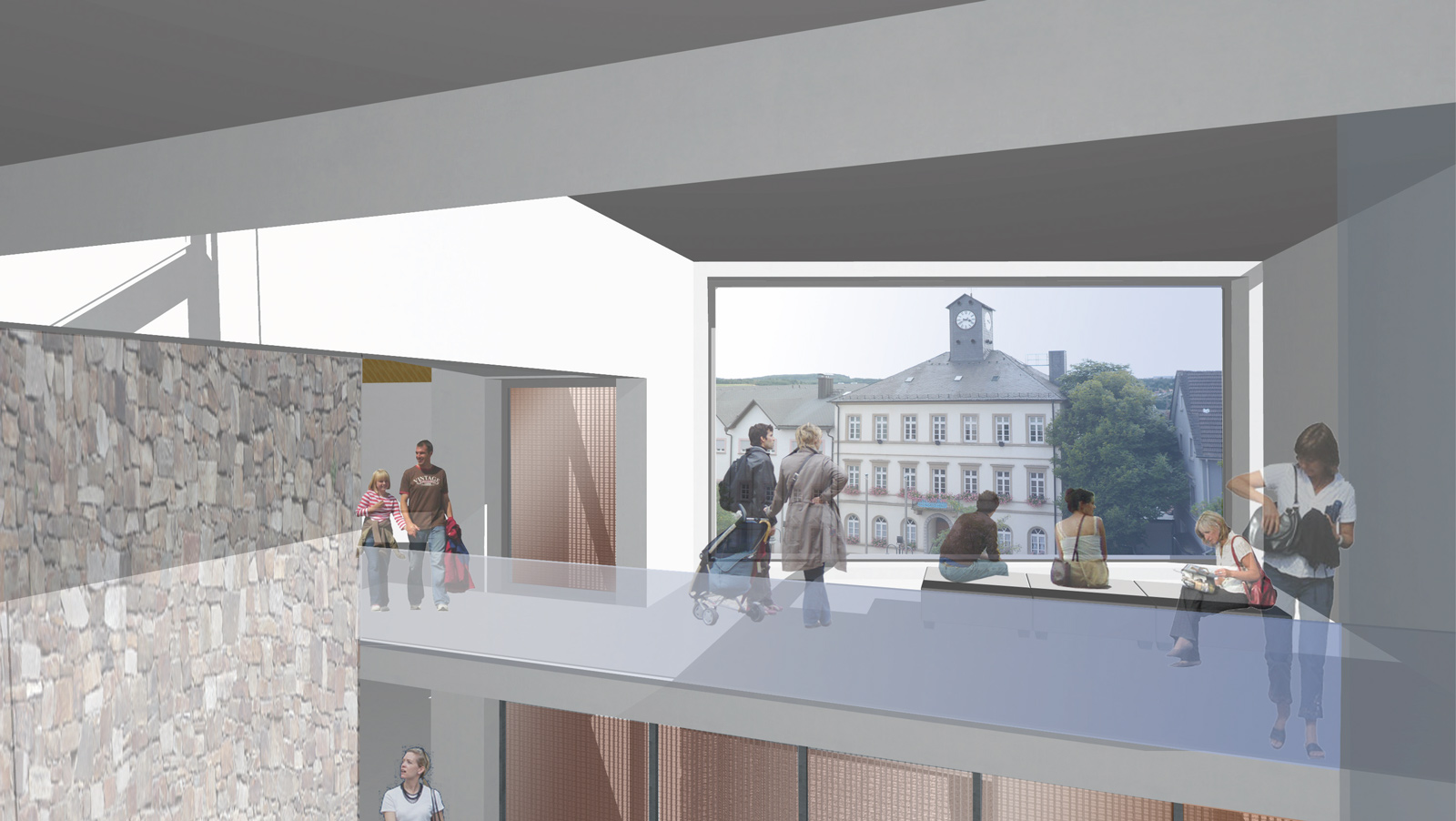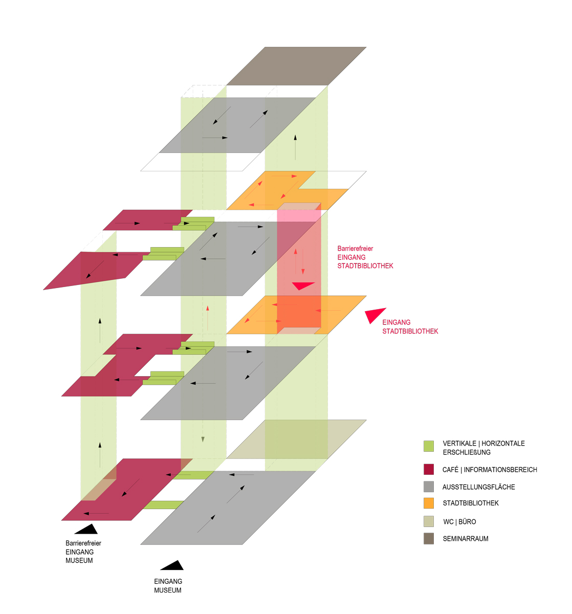 Die Themenschwerpunkte des Stadtmuseums sind stockwerksweise getrennt. Einer allgemeinen Einführung in das jeweilige Thema im lichtdurchfluteten Foyer des Glashauses folgt das Eintauchen in die einzelnen Themenbereiche über Stege zwischen Neu- und Altbau, verdeutlicht durch eine Lichtfuge im Dach. Die Ausstellungsräume selbst erhalten durch die Kontrastierung von Alt und Neu ihre atmosphärische Dichte. Genaue Grundrisslösungen sind zusammen mit einem Büro für die Ausstellungskonzeption zu erarbeiten. Es gibt also weder eine „white box“ noch ein ausschließlich an der historischen Gebäudehülle orientiertes Ausstellungsdesign, sondern ein von Planungsbeginn an gemeinsam zu entwickelndes Museumskonzept. Die Flächen für Wechselausstellungen sind publikumsnah im Erdgeschoss vorgesehen.